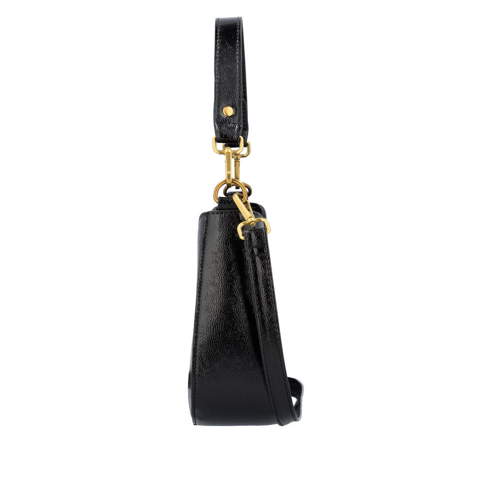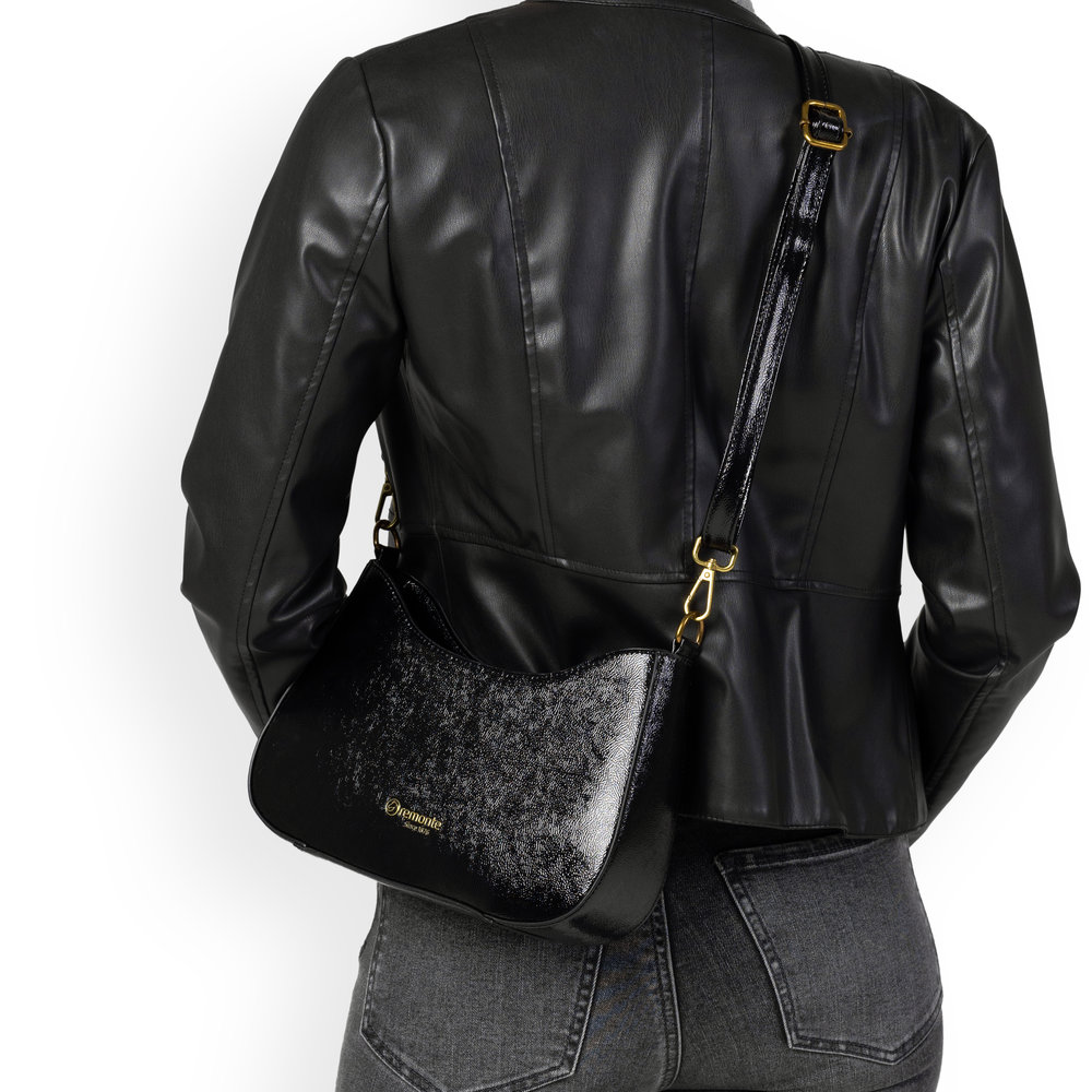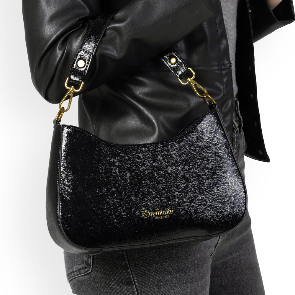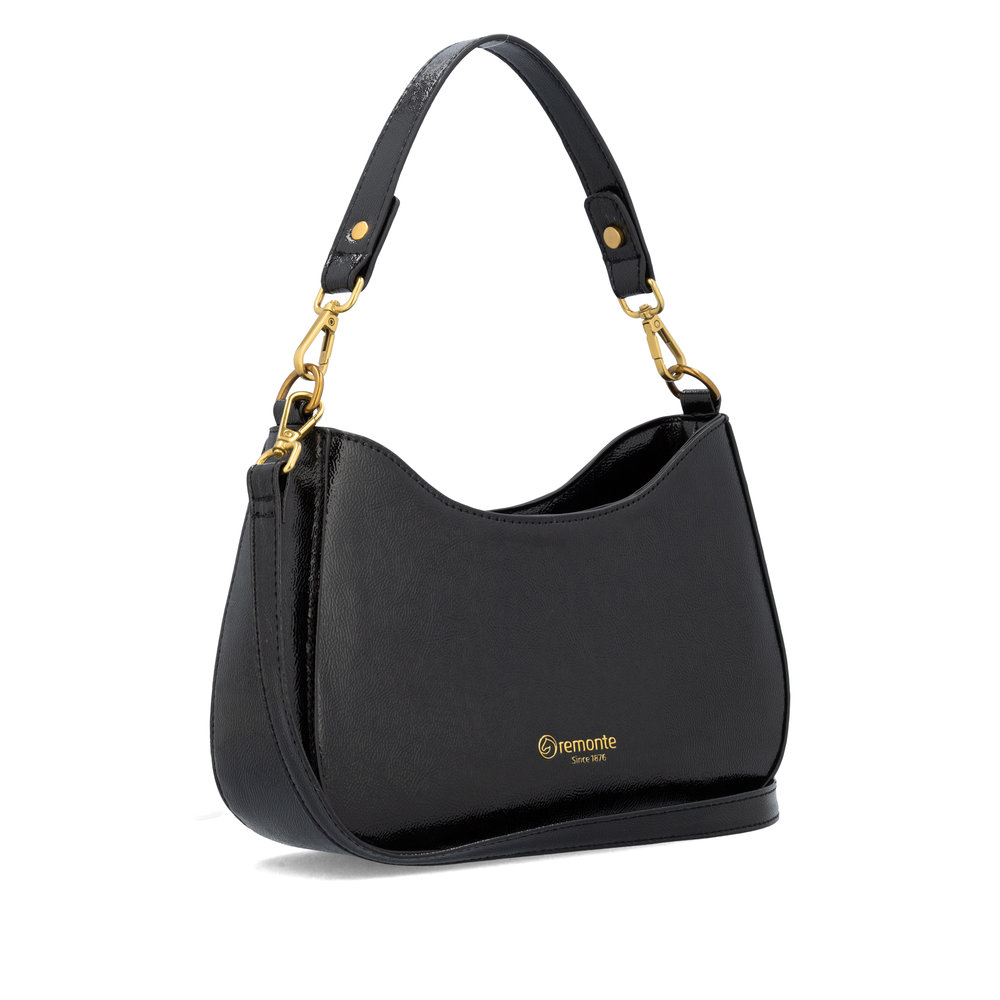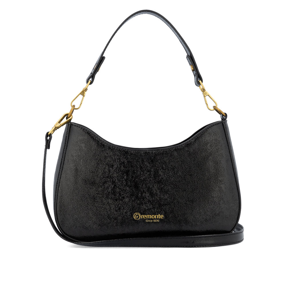 Luxusní dámská kabelka od značky Remonte v nádherném designu. Svrchní materiál je v černé barvě s lesklou úpravou a decentním logem značky. Vše dolaďují doplňky ve zlaté barvě. Hlavní část kabelky je uzavíratelná zipem. Můžete si vybrat, jestli budete nosit kablku na kratším pevném popruhu nebo na dlouhém popruhu. Obě varianty jsou odepínatelné. S touto kabelkou budete mít vždy půvab a šarm.