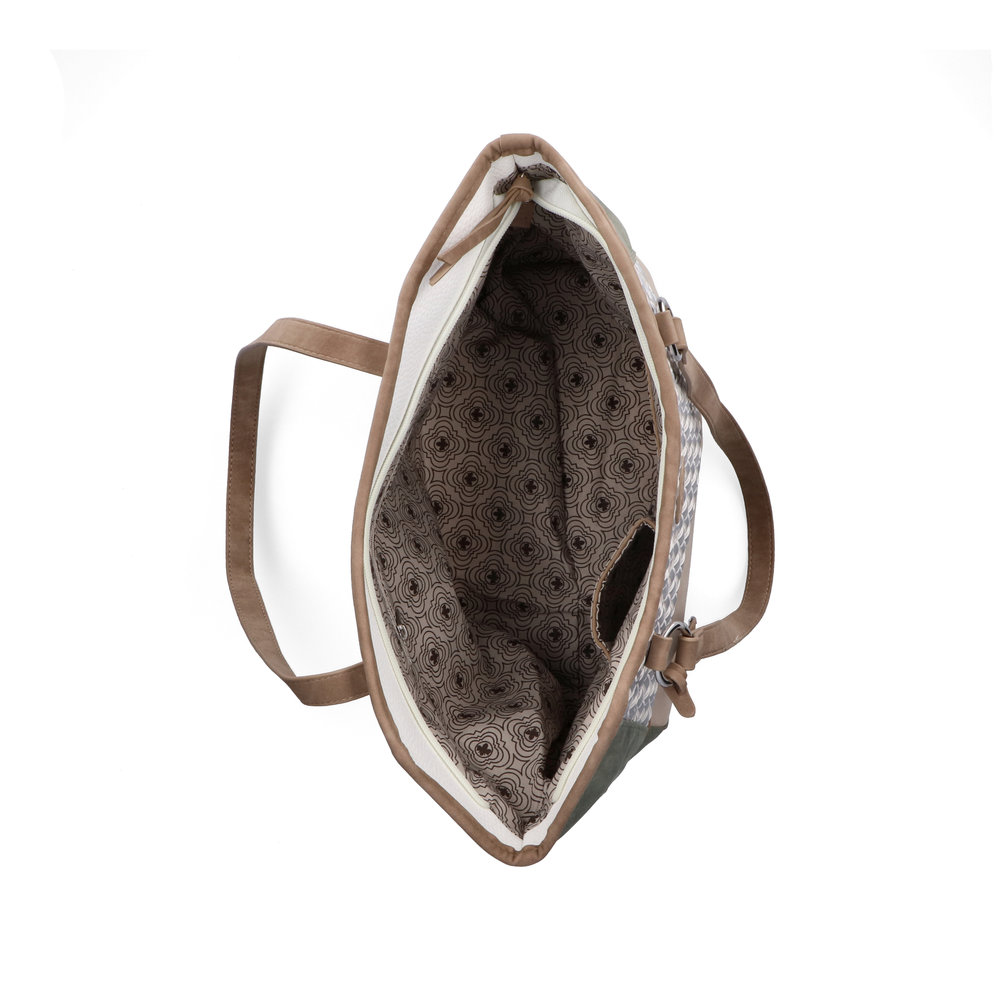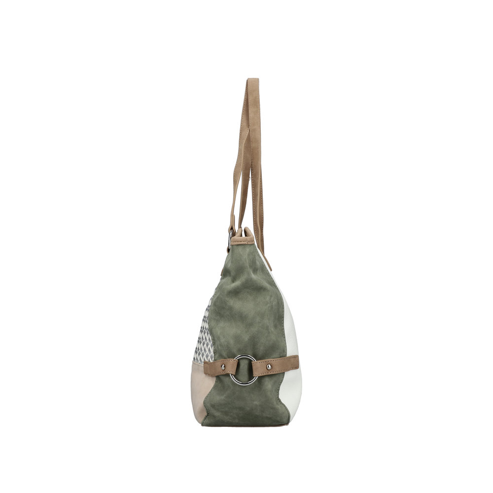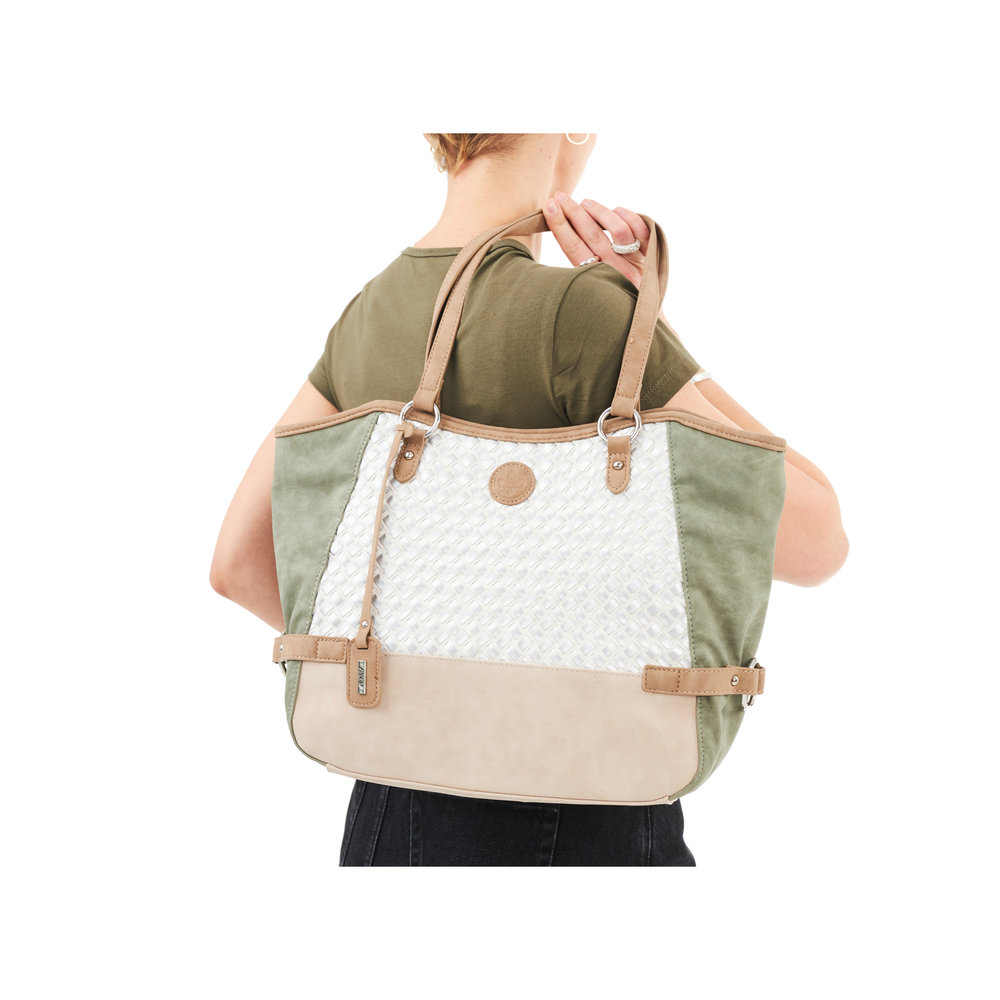 Výrazná kabelka v jemných barvách zelené a růžové, je na bílém pozadí zvýrazněna stříbrným proplétáním. Dvě dlouhá ucha na nošení v ruce i na rameni. Velká prostorná hlavní přihrádka nabízí i menší přihrádky pro drobnosti. Tato kabelku se hodí třeba k látkovým kalhotám v přírodních barvách, ale také k riflím a jednobarevným šatům.