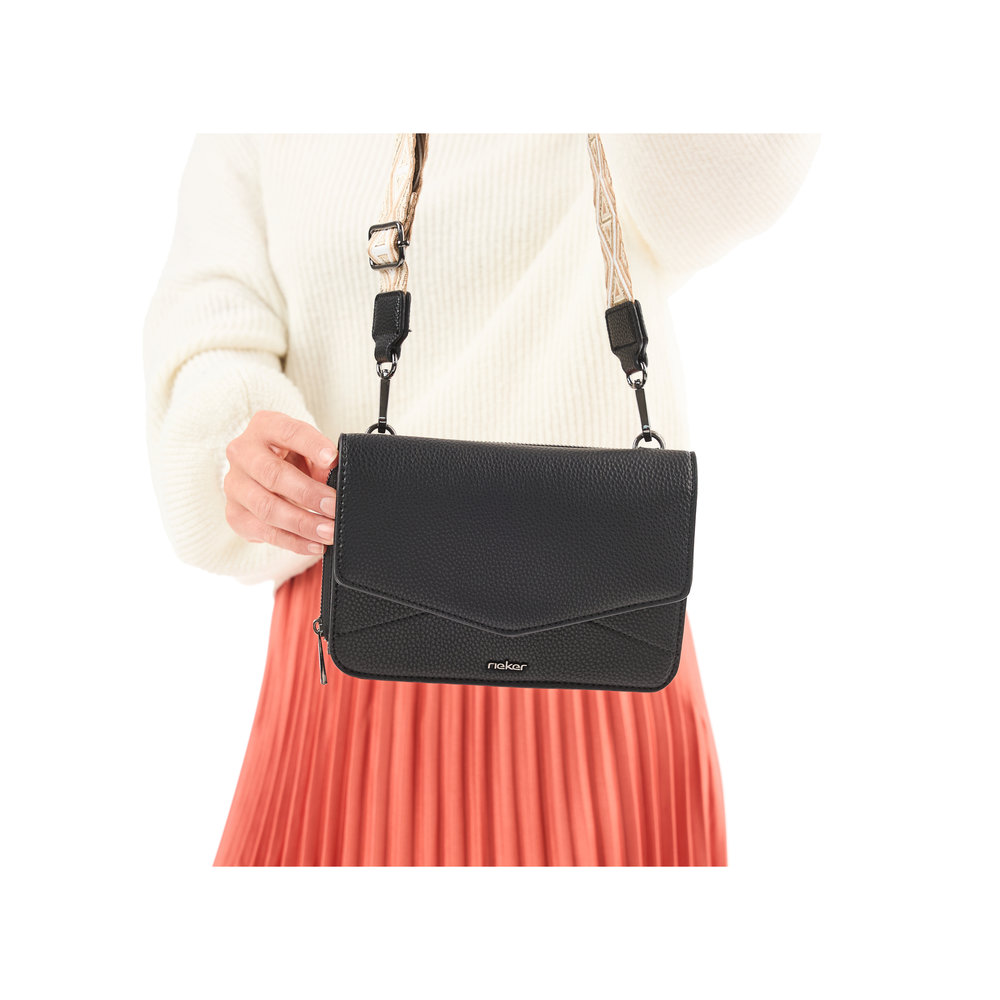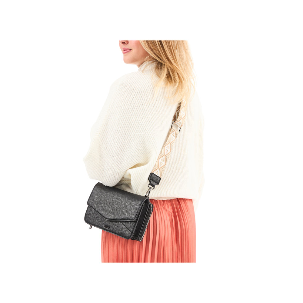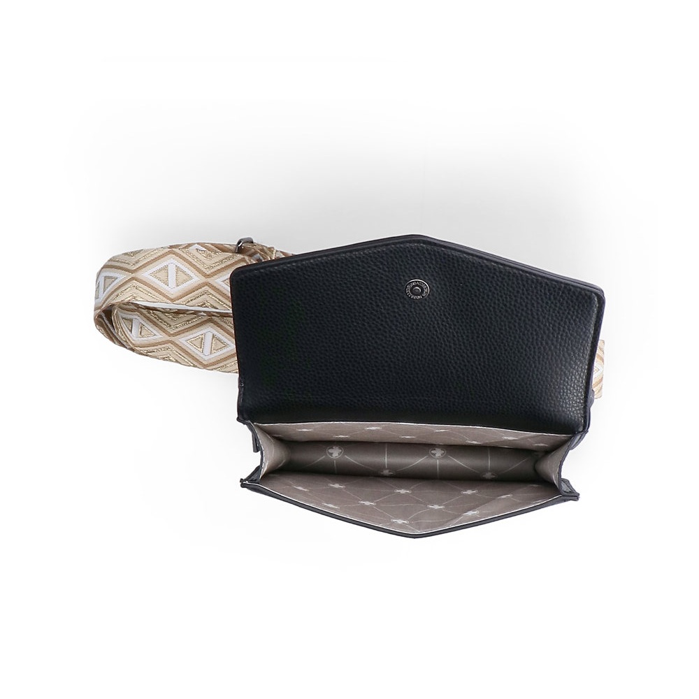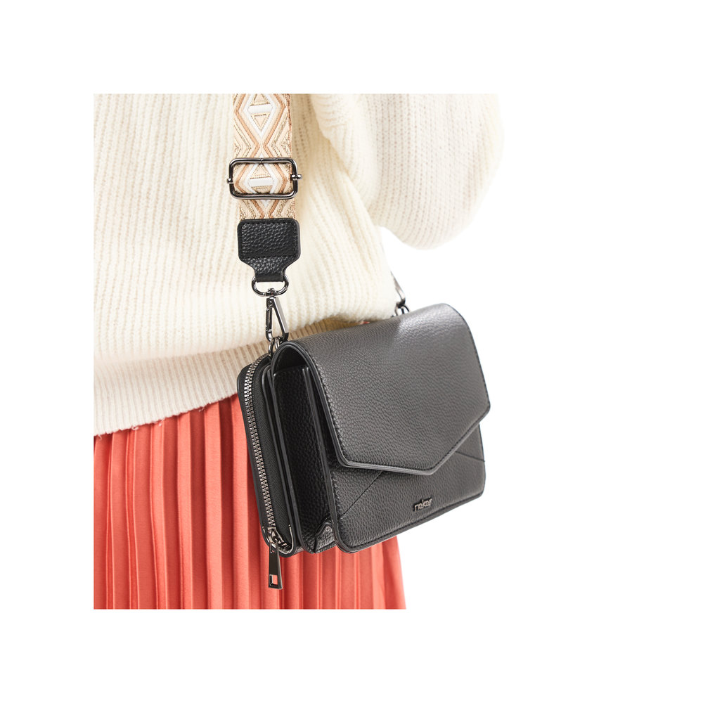 Kabelka je tvořena ze dvou částí, které jsou k sobě připnuty čtyřmi magnety a každá část má navíc závěsná očka pro uchycení dlouhého popruhu, který je délkově nastavitelný a lze odepnout.