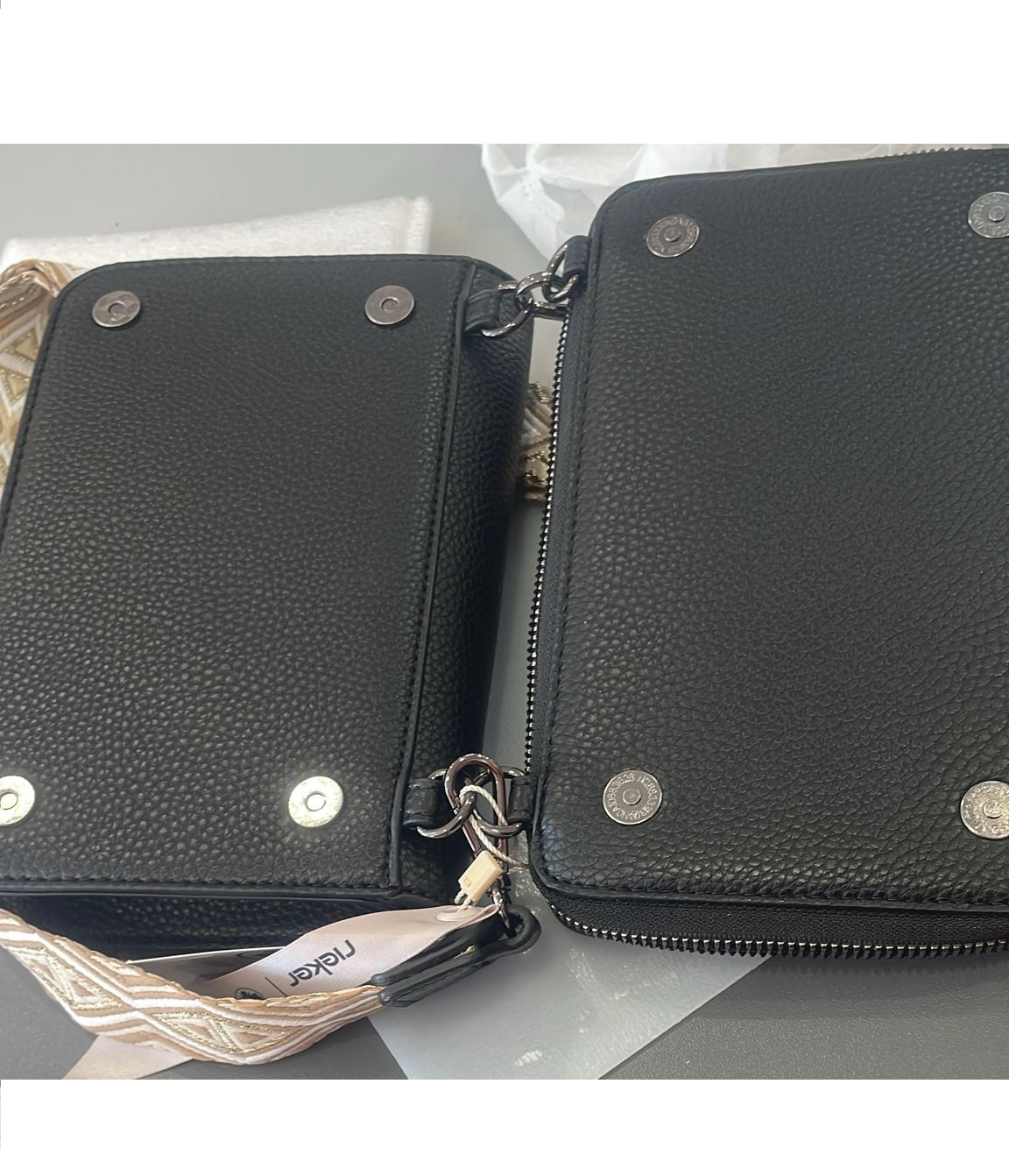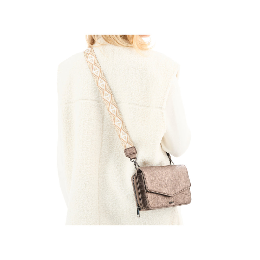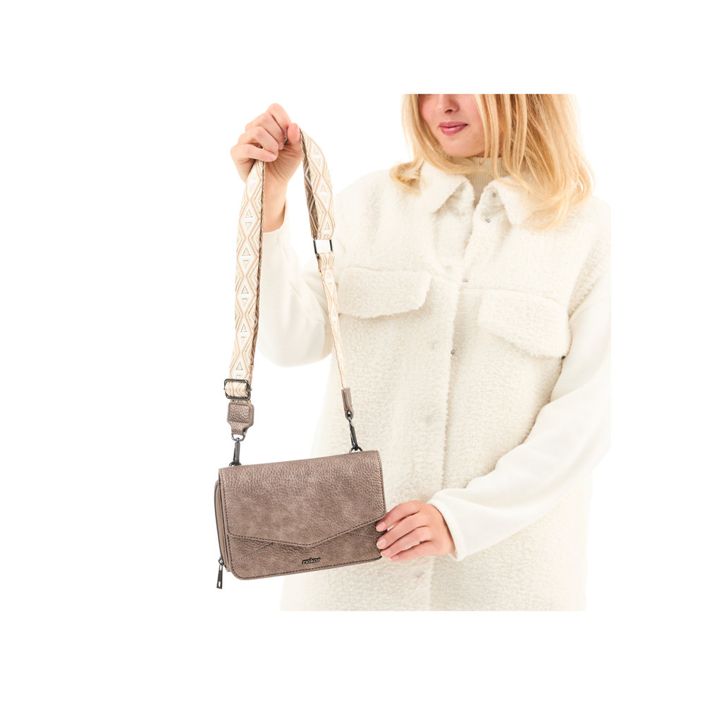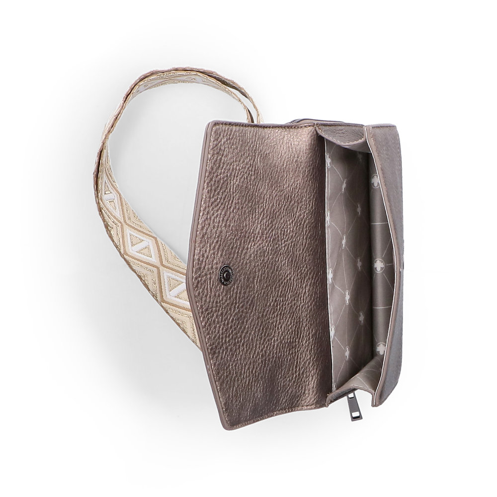Kabelka je tvořena ze dvou částí, které jsou k sobě připnuty čtyřmi magnety a každá část má navíc závěsná očka pro uchycení dlouhého popruhu, který je délkově nastavitelný a lze odepnout.