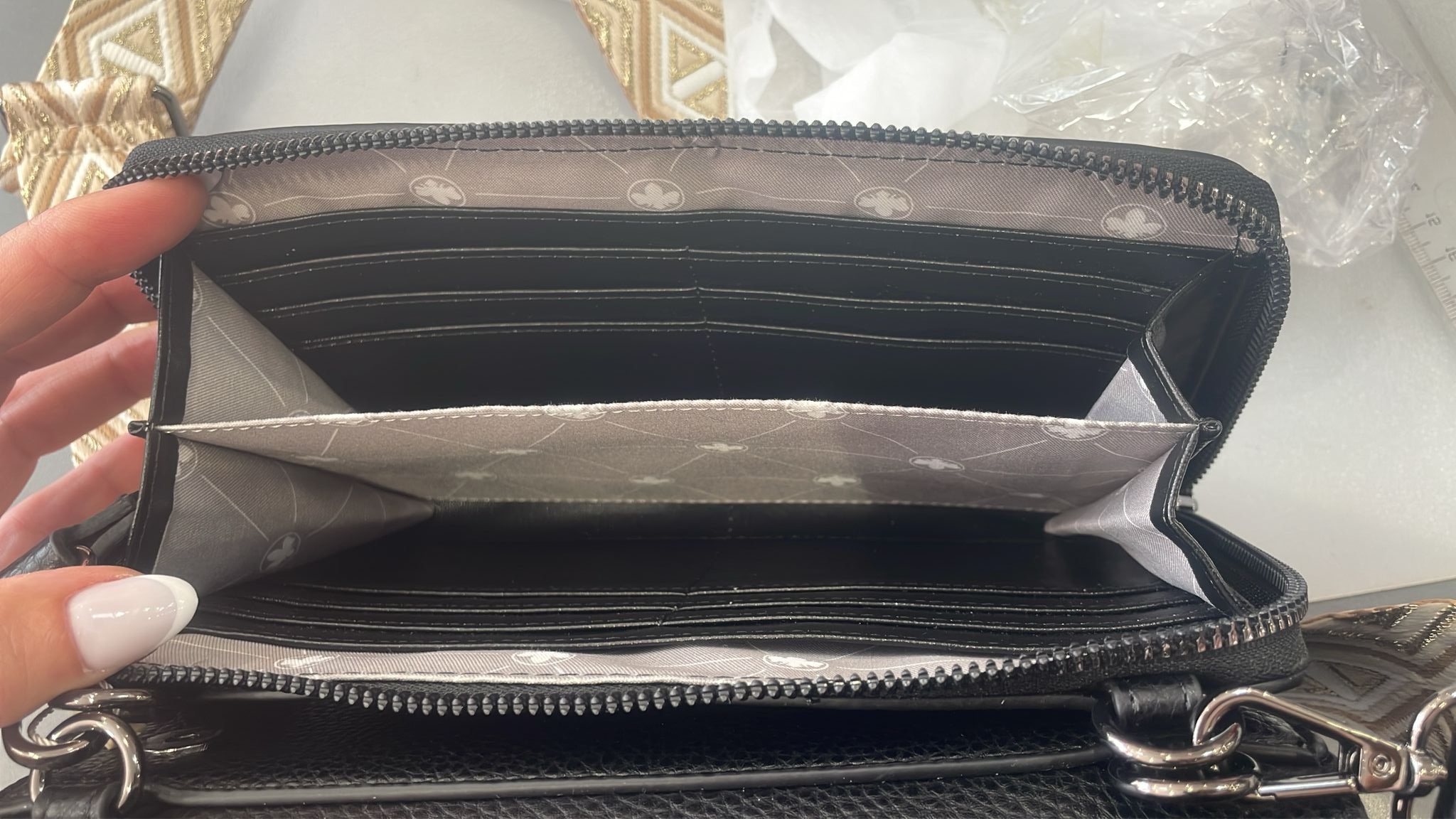 2. část uzavíratelná zipem - uvnitř je kabelka dělená přihrádkou a navíc je vybavena po stranách přihrádkami na karty (tato část kabelky Vám dokonale nahradí peněženku).