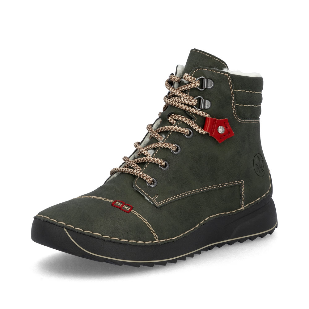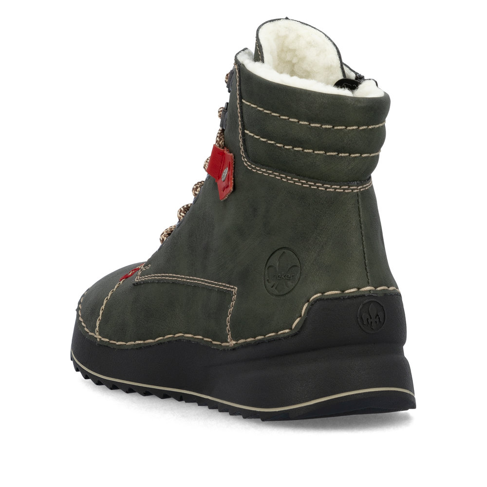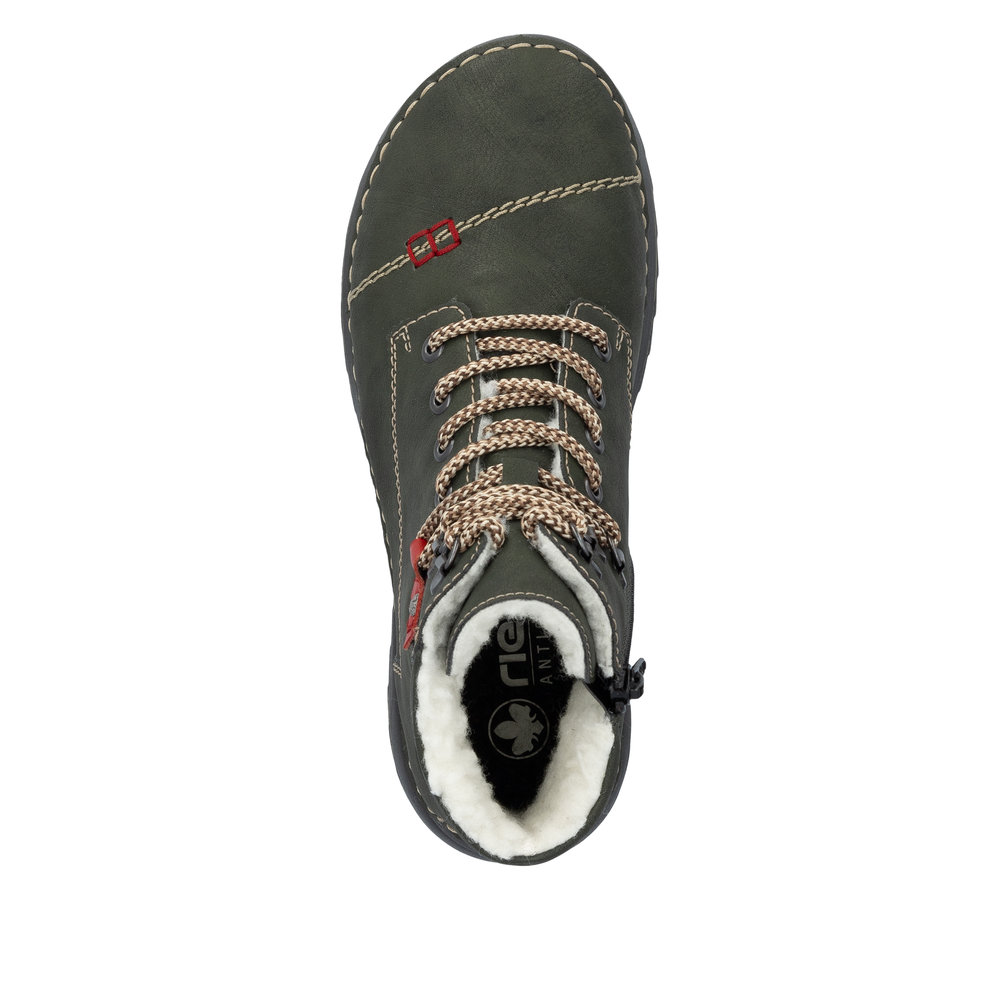 Výborná volba jsou tyto dámské zimní kotníkové boty Rieker v zelené barvě s černou podešví. Jsou doladěny světlým prošíváním, červenými aplikacemi a logem. Výhodou je funkční zip na vnitřní straně obuvi a tkaničky, díky kterým si obuv přizpůsobíte svým potřebám. Zateplení uvnitř obuvi Vás bude hřát a flexibilní podešev se přizpůsobí každému kroku. Do přírody i do města na každodenní nošení jsou tím pravým parťákem. Technologie: Antistress - podešev je díky této technologii lehká, flexibilní, absorbuje nárazy při došlapu a snadno se přizpůsobí každé noze. Výrobní způsob - šitá obuv.