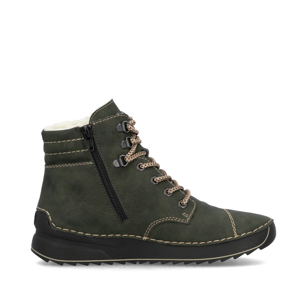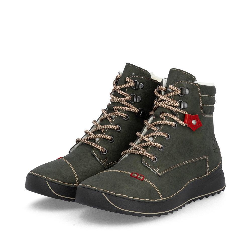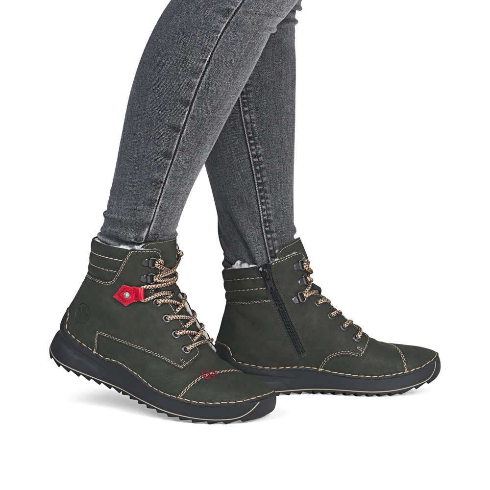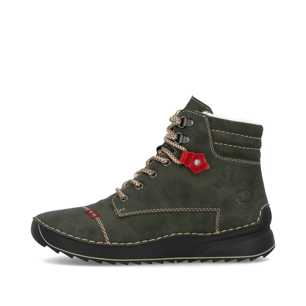 Výborná volba jsou tyto dámské zimní kotníkové boty Rieker v zelené barvě s černou podešví. Jsou doladěny světlým prošíváním, červenými aplikacemi a logem. Výhodou je funkční zip na vnitřní straně obuvi a tkaničky, díky kterým si obuv přizpůsobíte svým potřebám. Zateplení uvnitř obuvi Vás bude hřát a flexibilní podešev se přizpůsobí každému kroku. Do přírody i do města na každodenní nošení jsou tím pravým parťákem. Technologie: Antistress - podešev je díky této technologii lehká, flexibilní, absorbuje nárazy při došlapu a snadno se přizpůsobí každé noze. Výrobní způsob - šitá obuv.