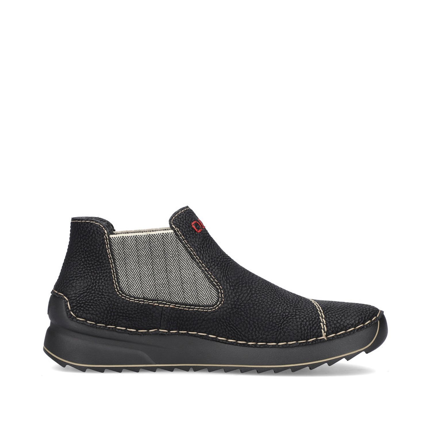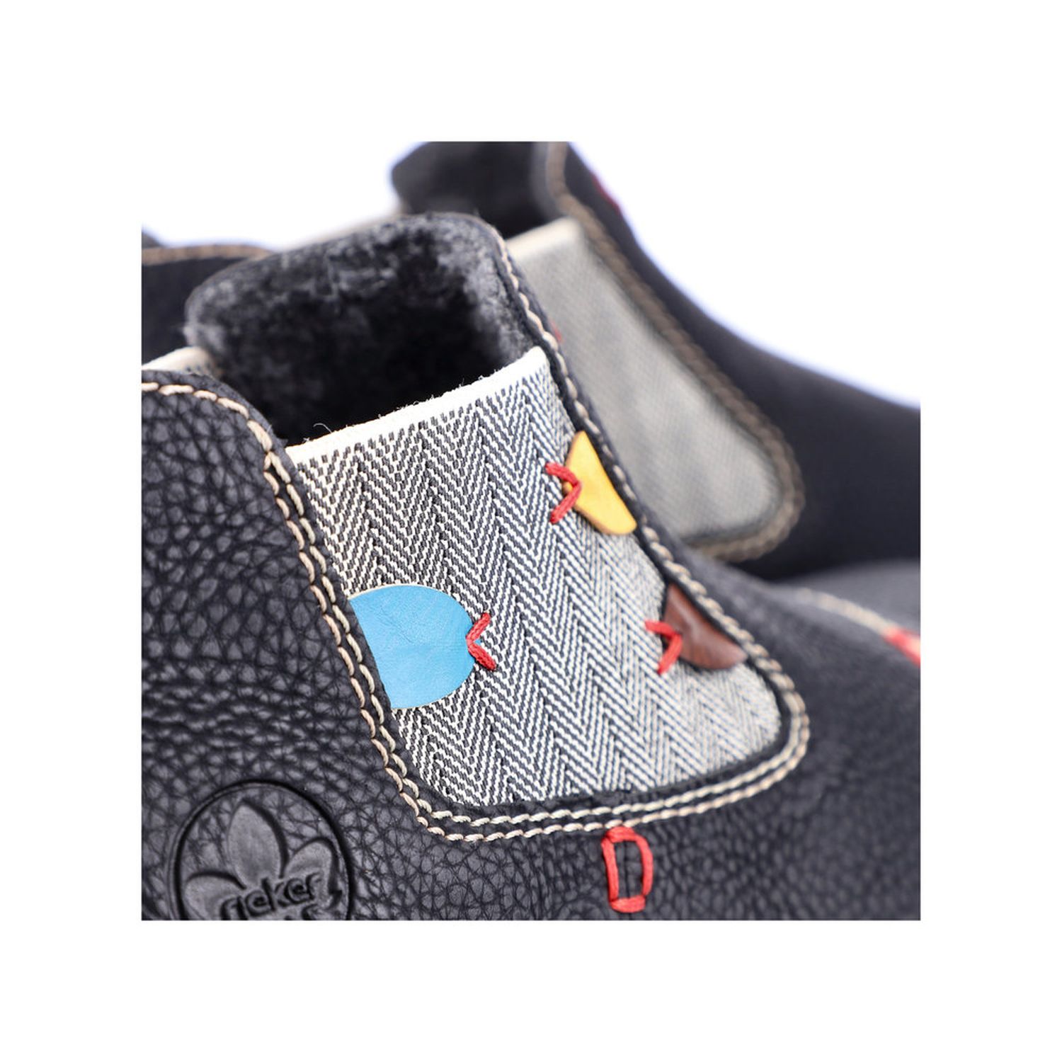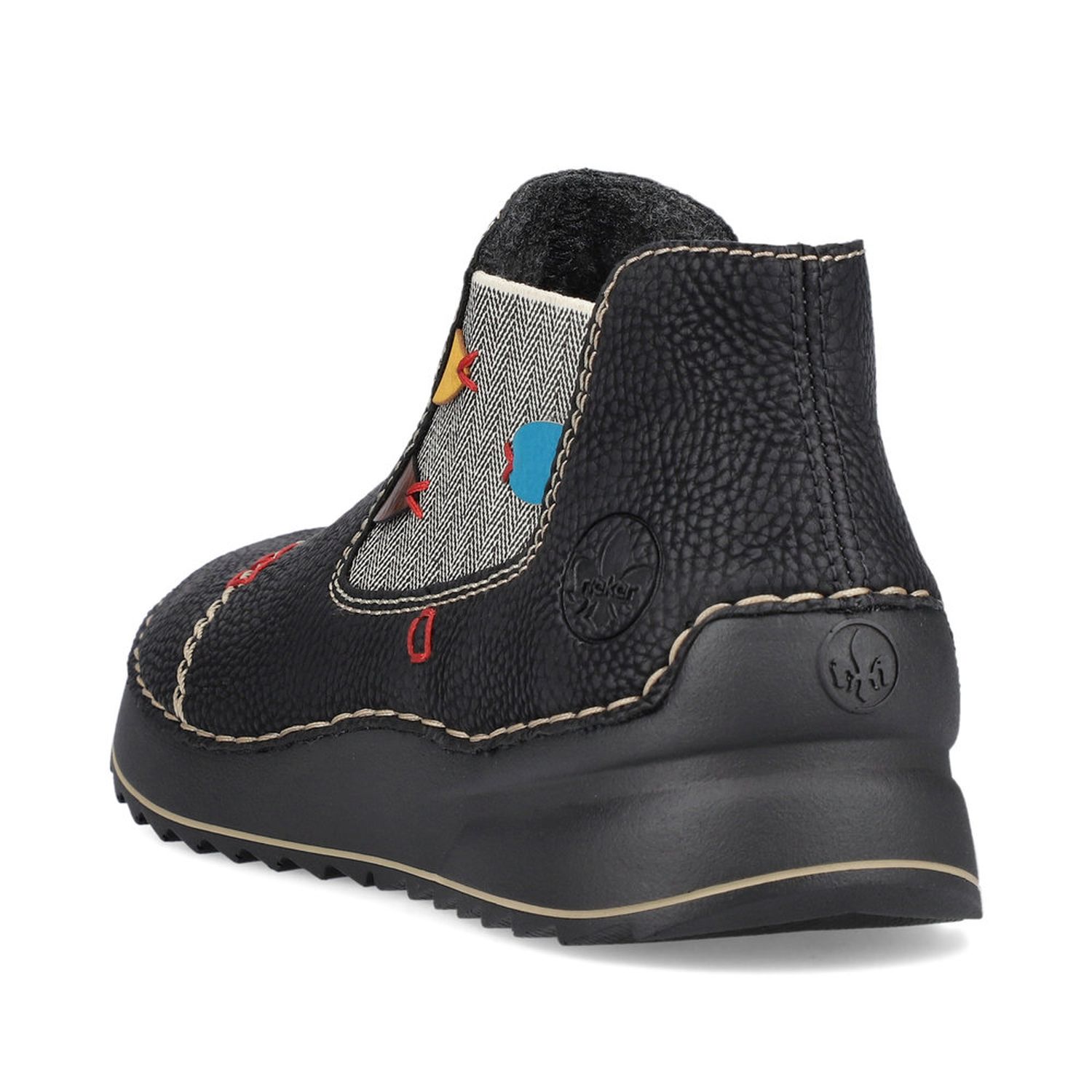 Barevné kotníkové boty Rieker rozzáří Vás outfit. Nízká kontíková obuv na pohodlné flexibilní podešvi v černé barvě s barevnými prvky a prošíváním je skvělou volbou. Všité pružinky na obou bocích obuvi slouží nejen jako pěkný prvek, ale také k praktickému obouvání. Oceníte pohodlnou stélku z paměťové pěny, která Vás bude hýčkat na každém kroku. Skvěle se budou hodit ke kalhotám i sukni. Technologie: Antistress - podešev je díky této technologii lehká, flexibilní, absorbuje nárazy při došlapu a snadno se přizpůsobí každé noze.
