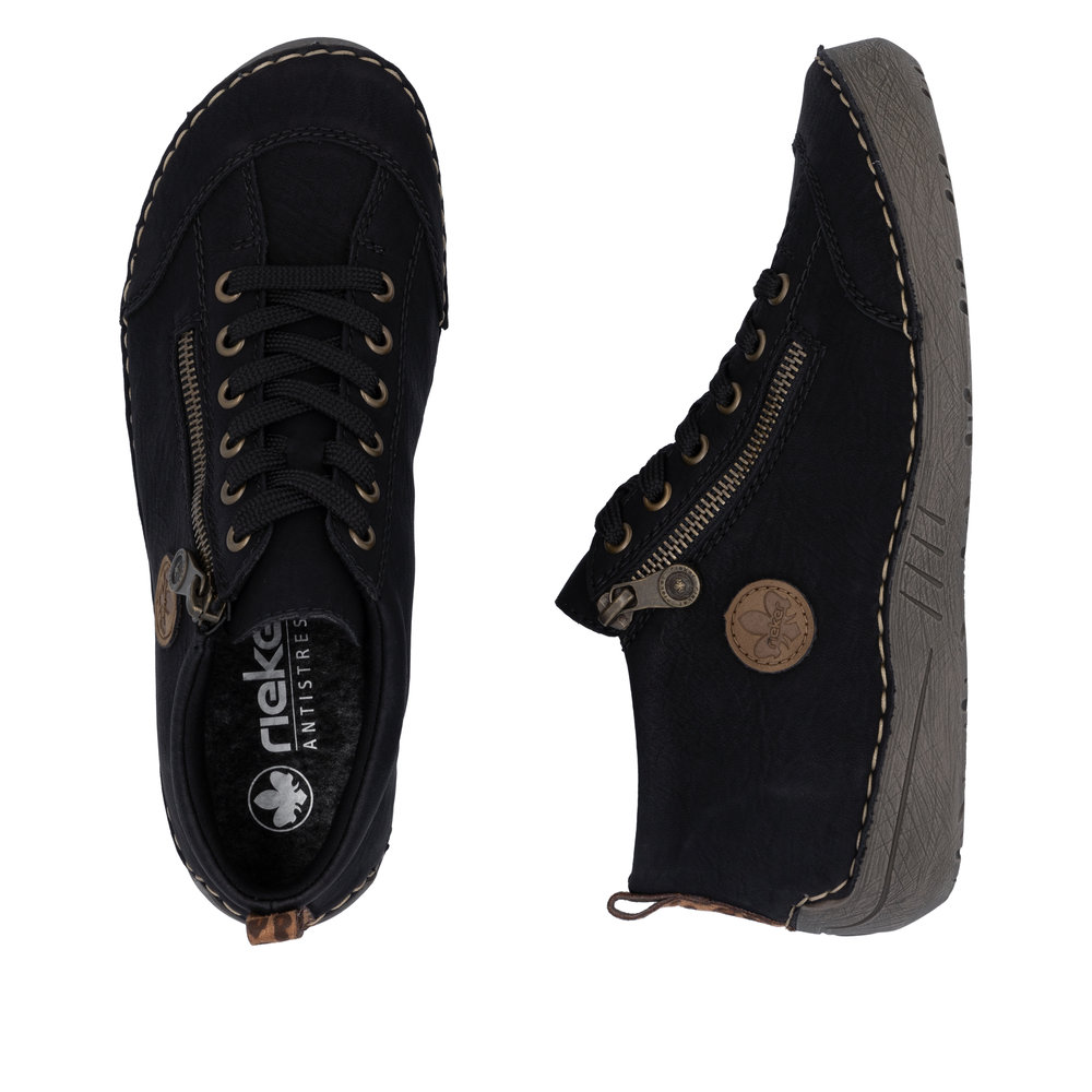 Dámská kotníková obuv Rieker v černé barvě, doladěna zvířecím vzorem na patě, logem a praktickým zipem. Díky zipu a tkaničkám je obouvání hračka. Příjemná podšívka a měkká stélka Vám dodají pohodlí po celý den. Flexibilní podešev se přizpůsobí každému kroku a tlumí nárazy, tím chrání Vaši páteř. Na každodenní nošení a výlety je tato obuv tou správnou volbou. Technologie: Antistress - obuv Rieker Vám nabízí komfortnější chůzi - tato obuv je lehká, pružná, prostorná a skvěle absorbují nárazy, tím chrání páteř. ŠÍŘE H - širší střih bot, který vytvoří dostatečný prostor Vašemu chodidlu a zajistí dokonalý komfort při nošení.