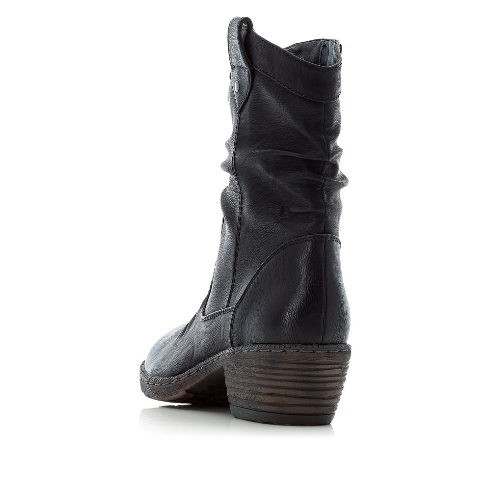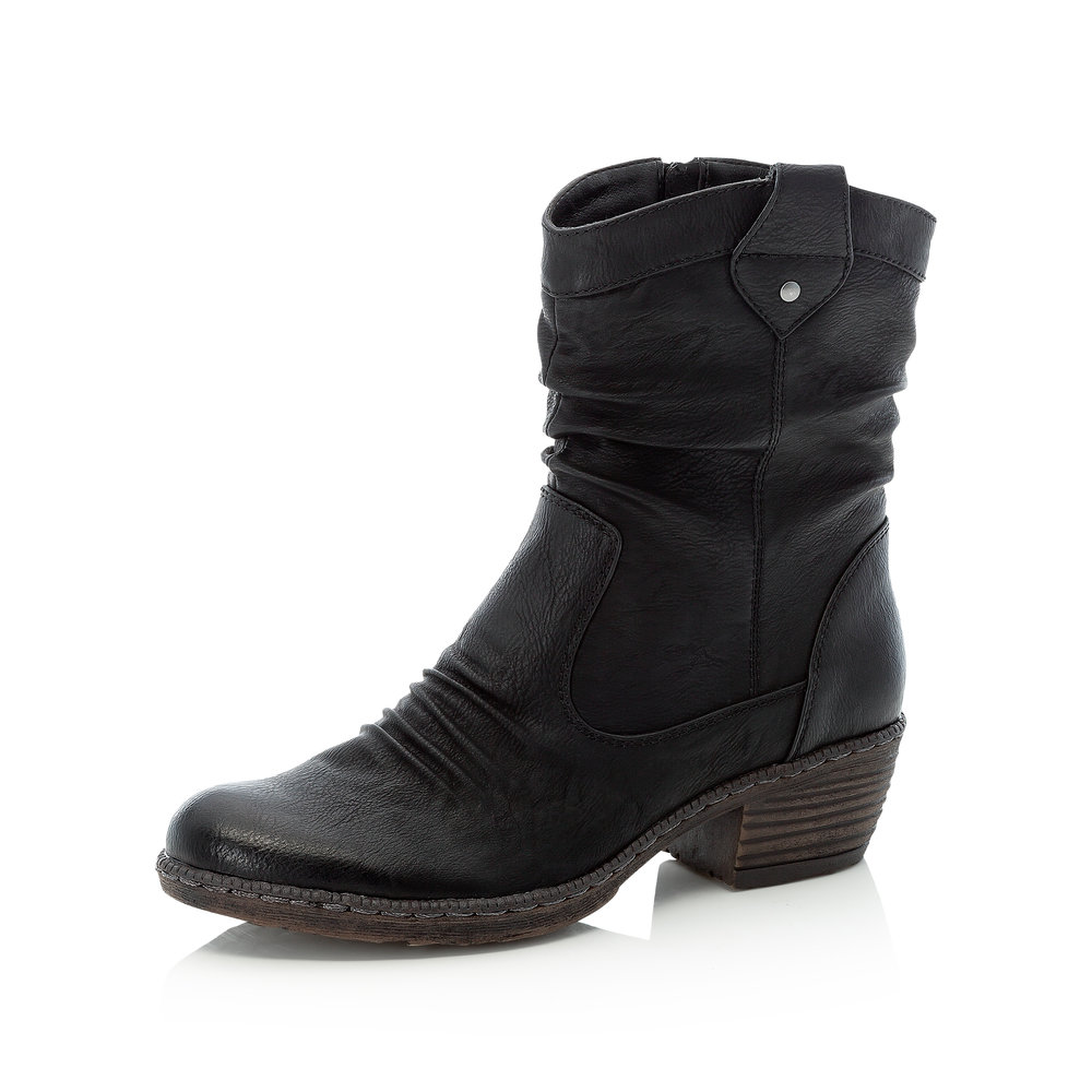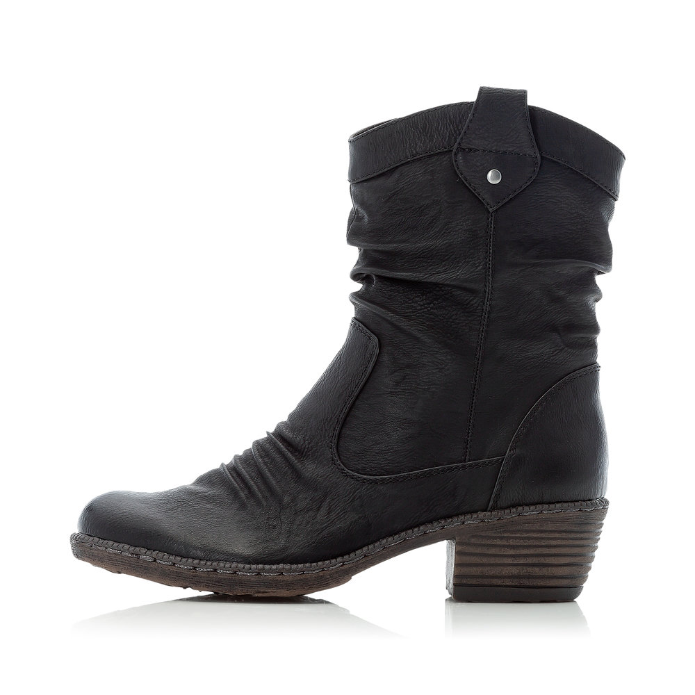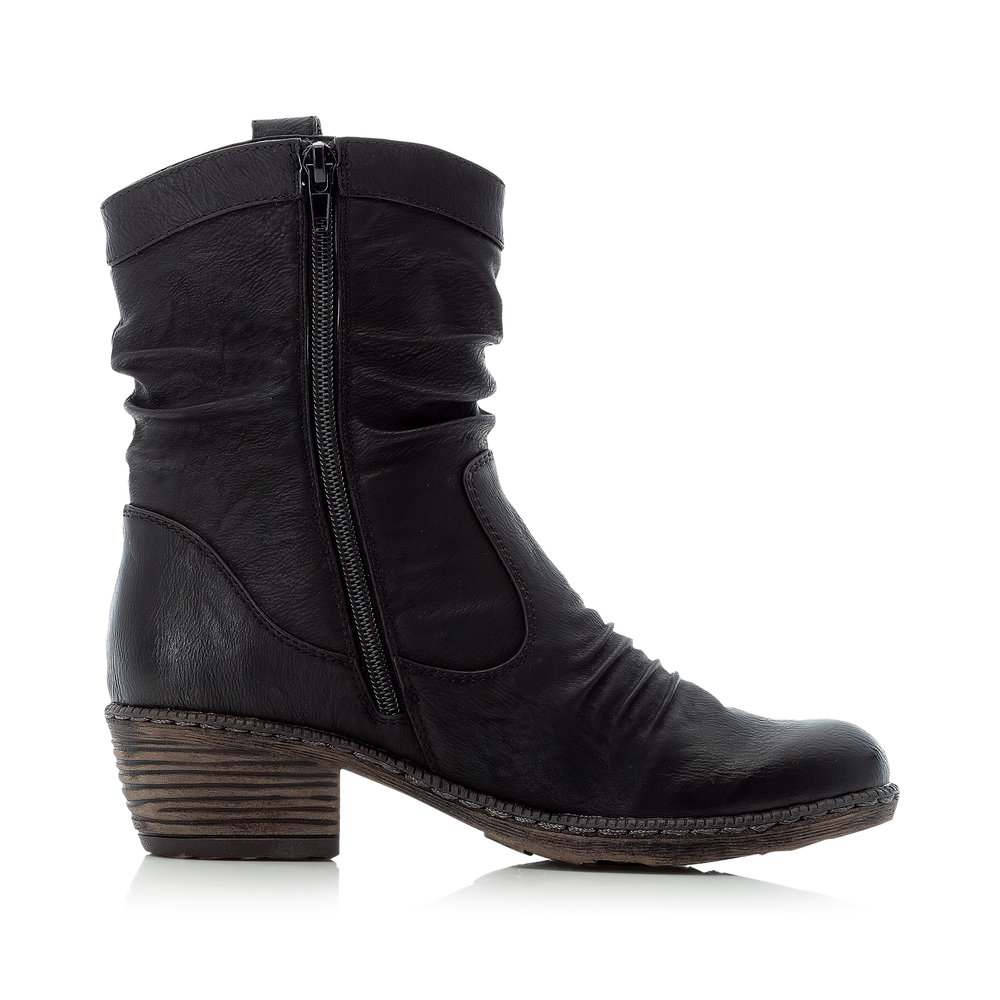 Pohodlné kotníkové boty od značky Rieker v černé barvě. Obuv má elegantně nařasený svršek a zajímavé prošívání. Z vnitřní strany je funkční zip, který Vám usnadní obouvání. V chladných zimních dnech oceníte příjemně zateplenou podšívku. Pohodlí po celý den Vám zajistí příjemná stélka a kvalitní podešev s technolgoií Antistress. Technologie: Antistress - podešev je díky této technologii lehká, flexibilní, absorbuje nárazy při došlapu a snadno se přizpůsobí každé noze.