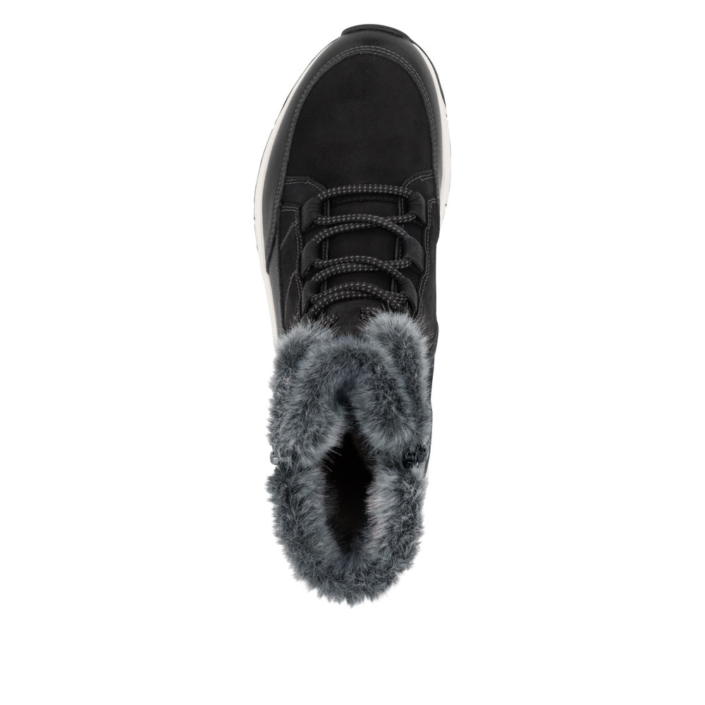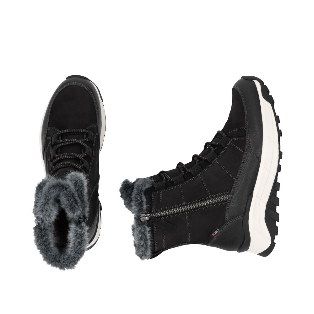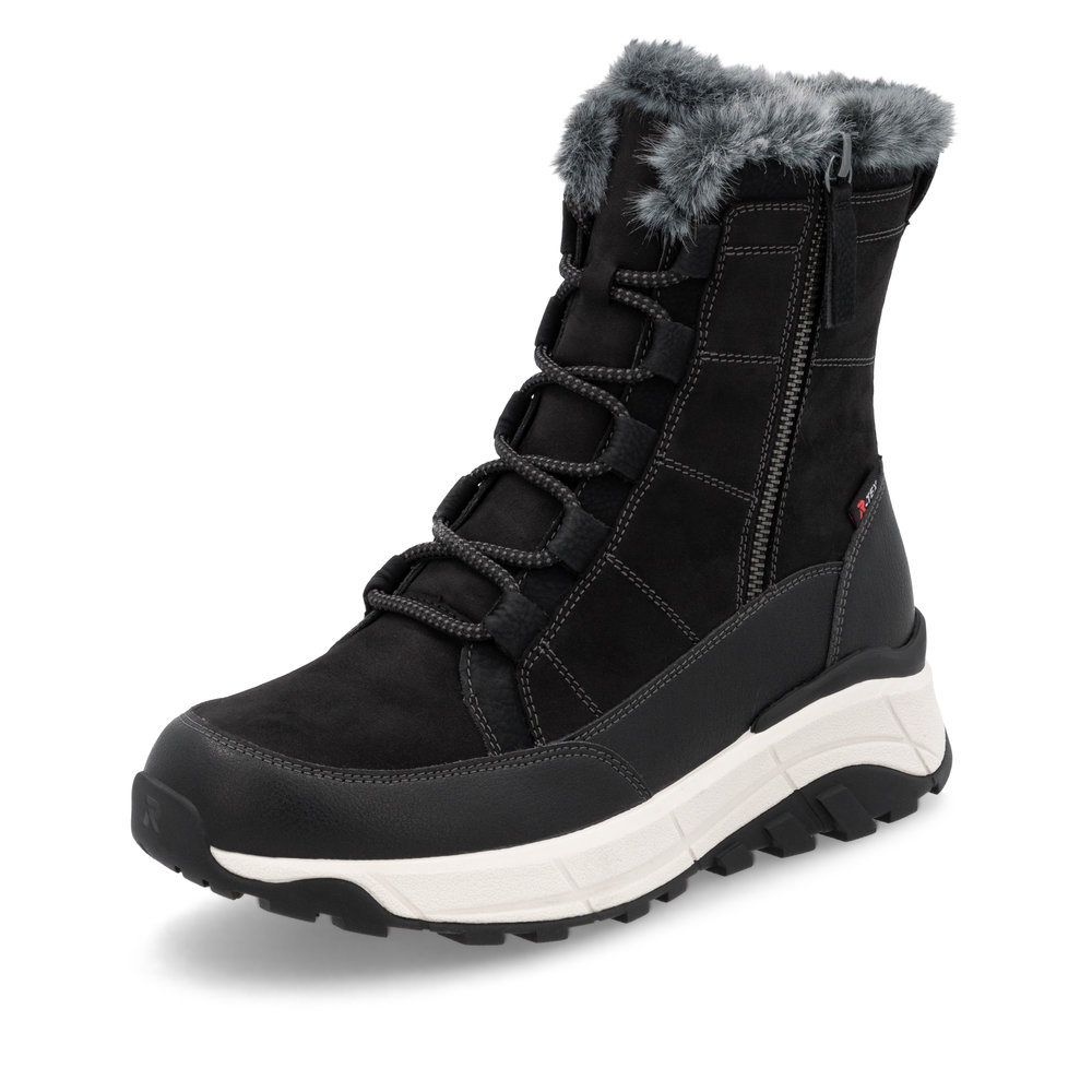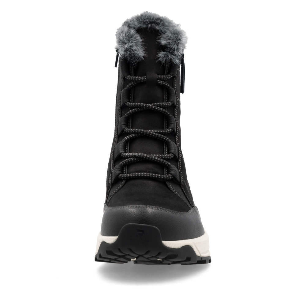 Nabízíme Vám tyto moderní, dámské kotníkové boty, od značky Rieker v černé barvě. Jejich originální design zvýrazňuje ozdobné prošívání na boku, žíhované tkaničky a hřejivý kožíšek u horního lemu. Obuv má z obou stran funkční zipy, které Vám usnadní obouvání a tkaničkami si boty utáhente podle svých potřeb. Uvnitř je zateplená podšívka z pravé ovčí vlny a vyjímatelná Thermo stélka, která Vám bude držet teplo uvnitř boty. Nemusíte se bát, že by Vám do obuvi zatekla voda. Obuv má totiž pod svrškem nepromokavou membránu s technologií RevolutionTex.