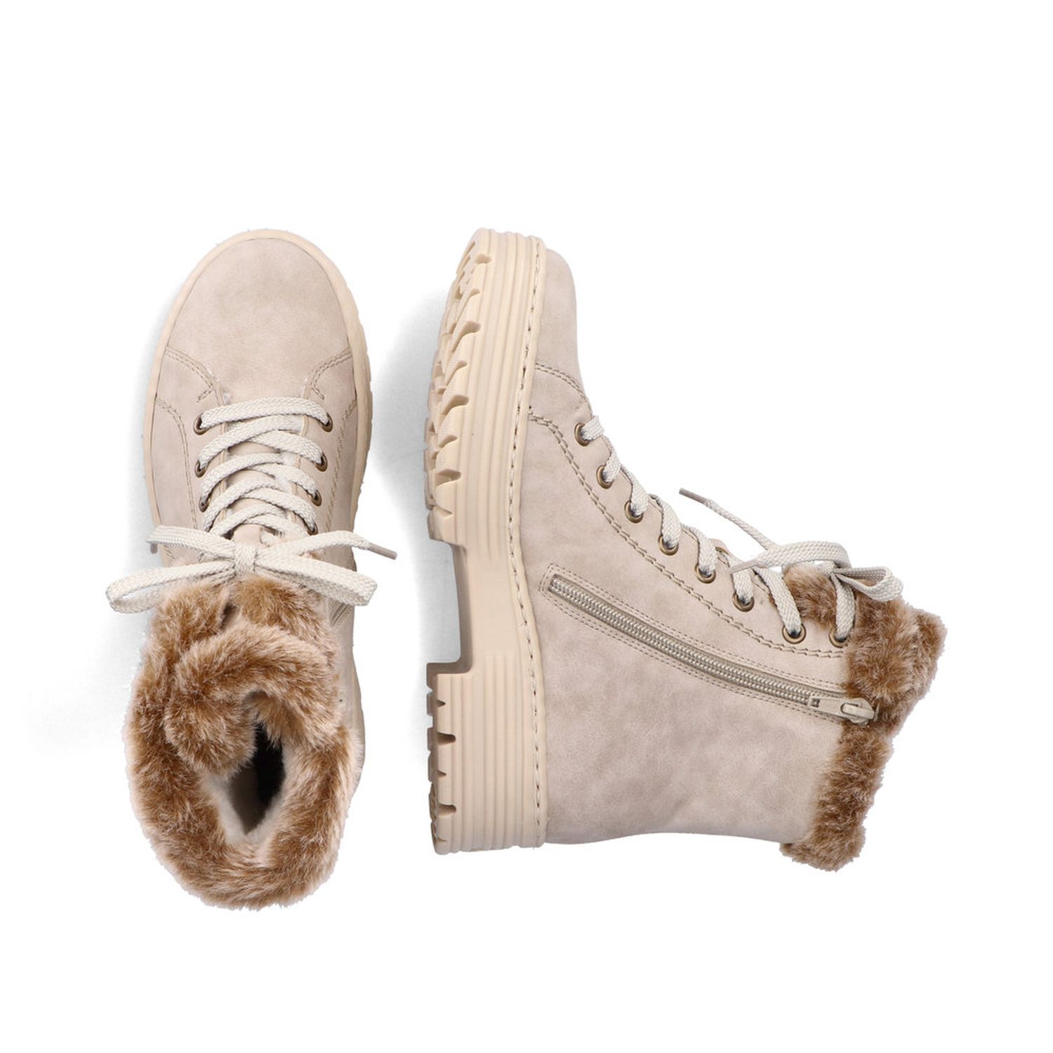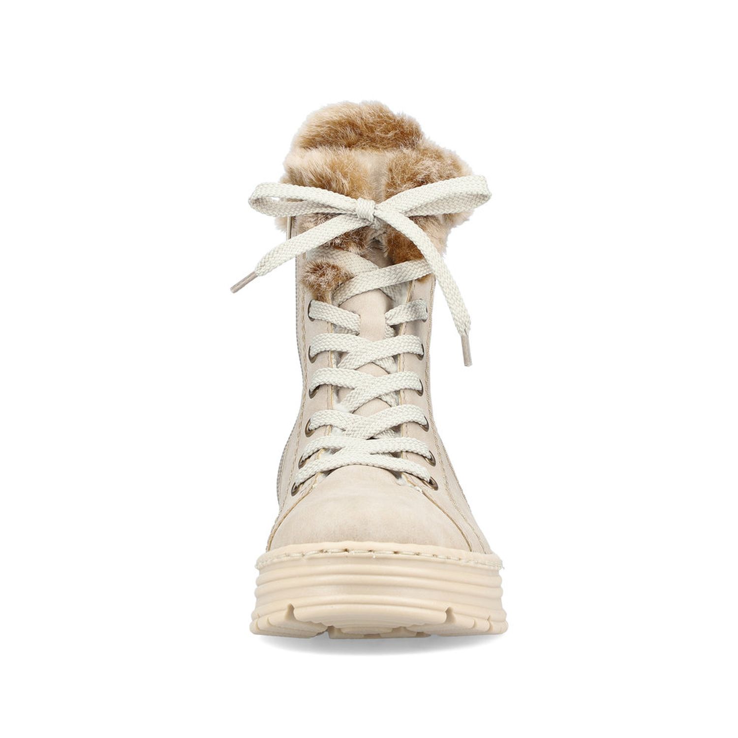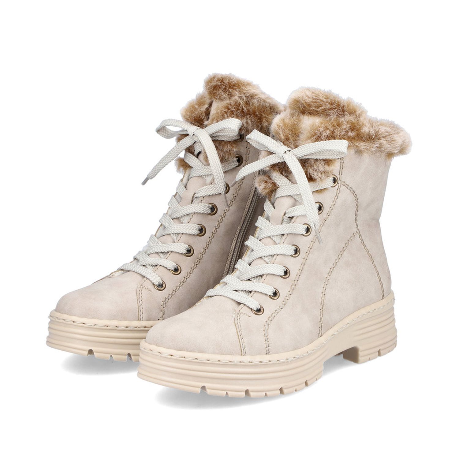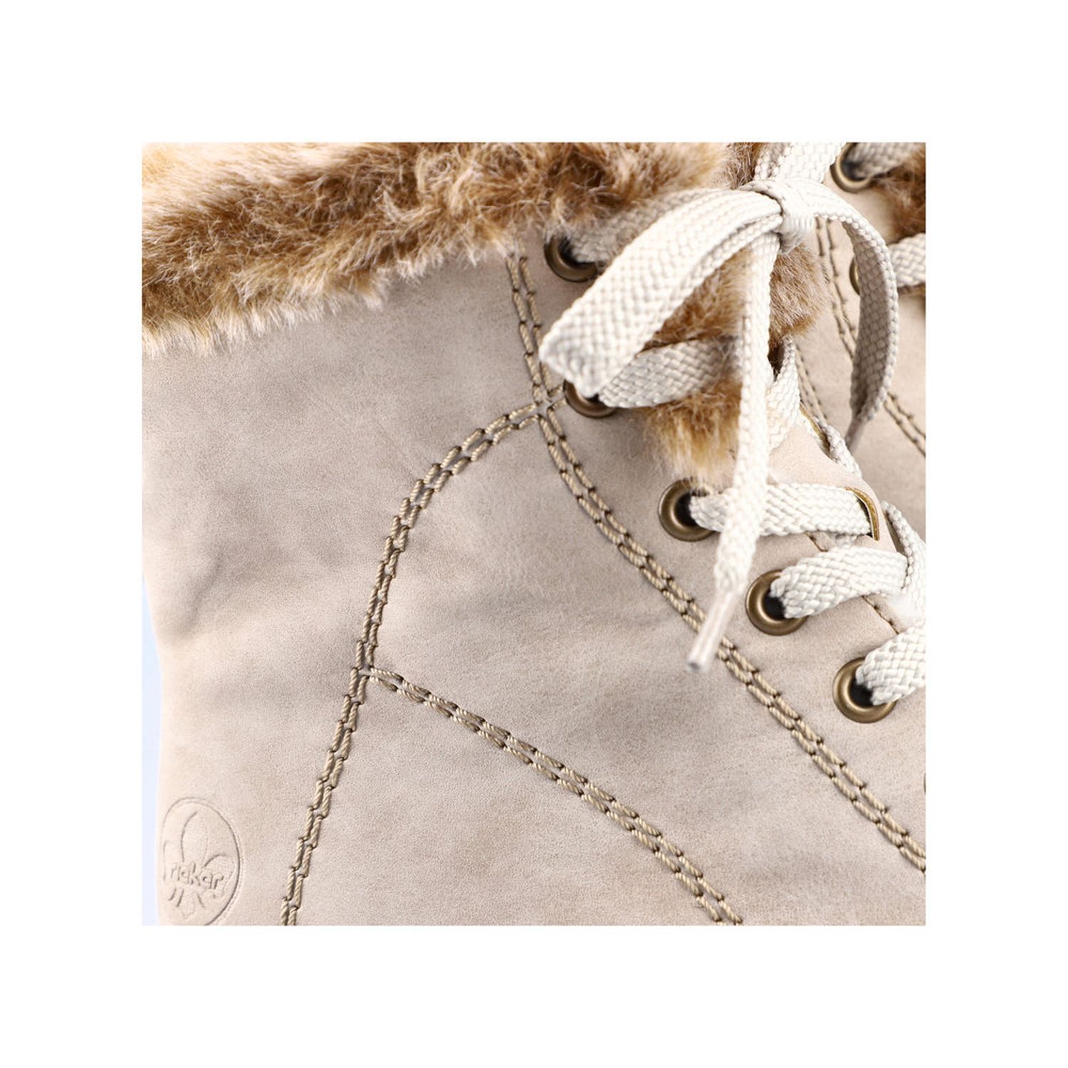 Světlé dámské zimní boty Rieker. Tento jednoduchý model ve světlé barvě s jemným prošíváním je dozdoben luxusním kožíškem. Snadné obouvání díky zipům je samozřejmostí. Oceníte vyjímatelnou stélku. Pomocí tkaniček si obuv ještě lepe přizpůsobíte svým potřebám. Flexibilní lehká podešev se přizpůsobí každému Vašemu kroku, a tak můžete s radostí vyrazit do zimních dní. Technologie: Antistress - podešev je díky této technologii lehká, flexibilní, absorbuje nárazy při došlapu a snadno se přizpůsobí každé noze. Vyjímatelná stélka.