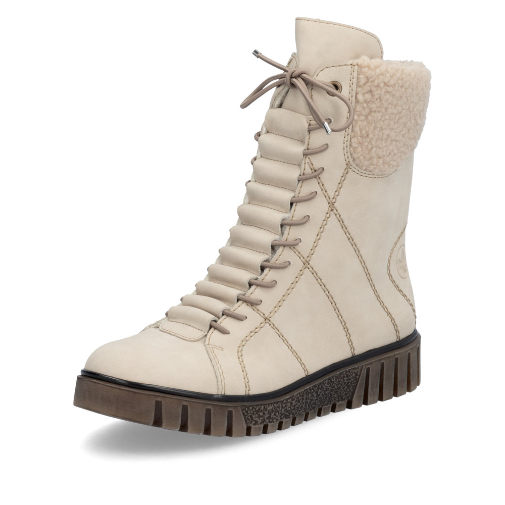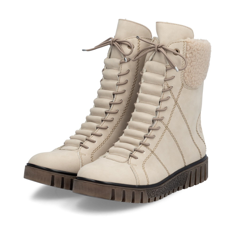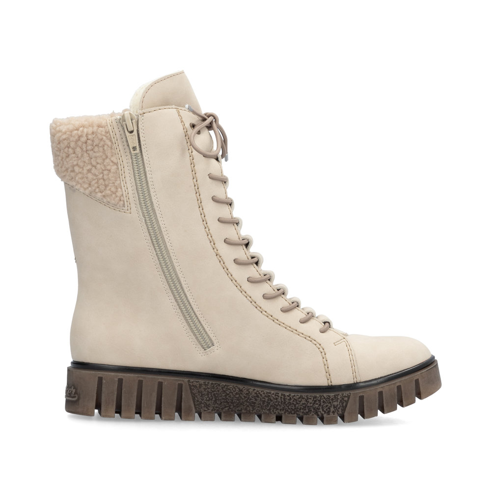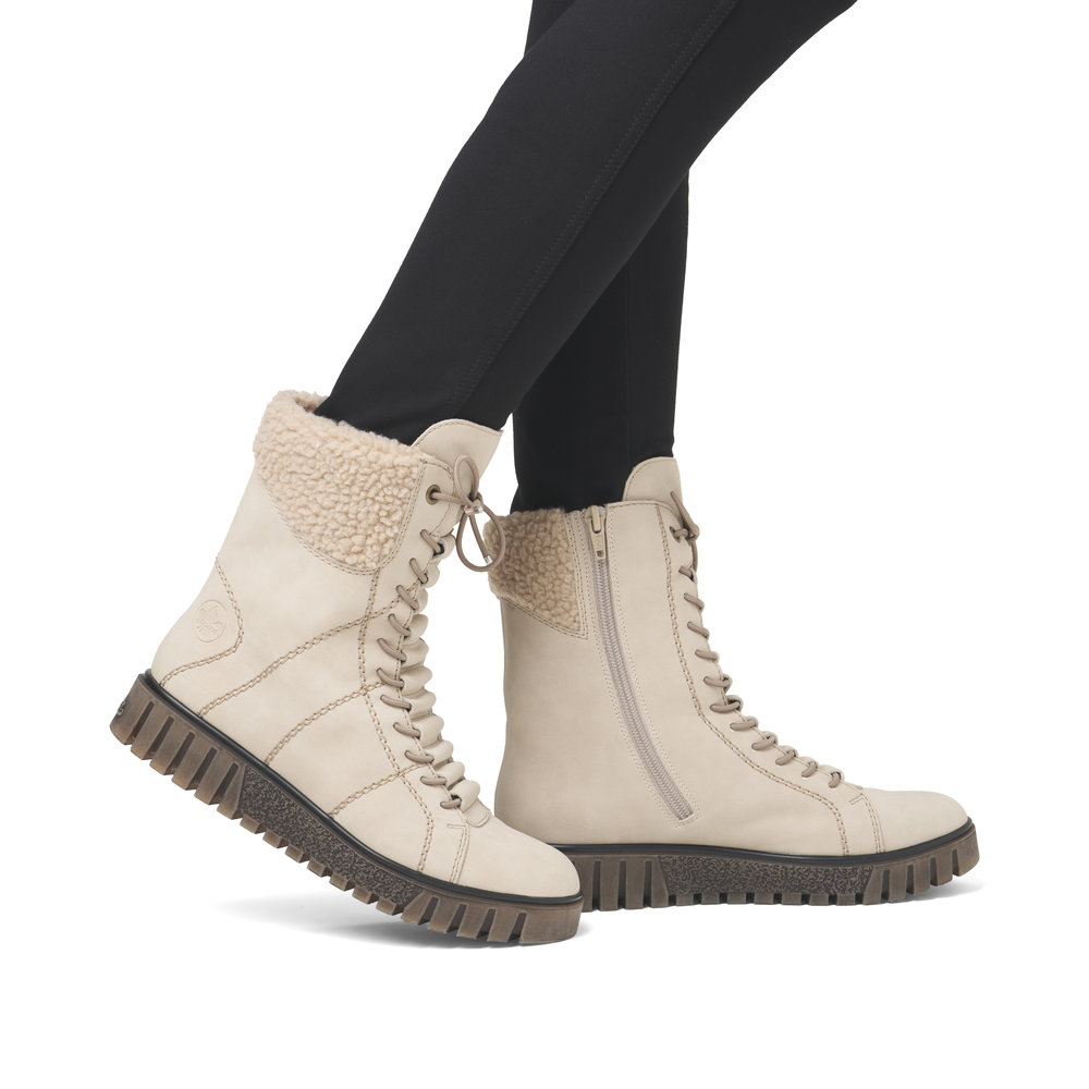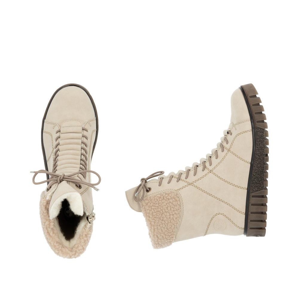 Moderní kotníkové boty Rieker v béžové barvě, které dokonale podtrhnou Váš styl. Na první pohled zaujme originální provedení (zakrytí) tkaniček a ozdobné prošívání na boku. Díky funkčnímu zipu z vnitřní strany, se Vám budou boty skvěle a jednoduše obouvat. Uvnitř je zateplená podšívka a pohodlná stélka. Díky kvalitní podešvi s technologií Antistress je obuv velmi pohodlná a Vy tak vydržíte chodit v botách klidně celý den. Tento model nabízíme i v další barevné variantě (platí do vyprodání zásob). Technologie: Antistress - podešev je díky této technologii lehká, flexibilní, absorbuje nárazy při došlapu a snadno se přizpůsobí každé noze. Podšívka je z pravé ovčí vlny. Výrobní způsob obuvi - lepená obuv.