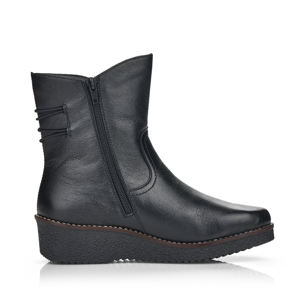 Detailní informace Dámská kotníková obuv Rieker v černé barvě, na nízkém klínku. Obuv zdobí jemné řasení kolem kotníku. Pro snadné obouvání je z vnitřní strany zip. Uvnitř najdete zateplený kožíšek, který Vaše nohy zahřeje v chladných zimních dnech. Pohodlí po celý den budete mít díky měkké stélce a kvalitní podešvi s technologií Antistress, která perfektně tlumí při došlapu nárazy a otřesy, čímž šetří tlak na Vaše nohy a páteř. Navíc je díky této technologii podešev lehká a flexibilní. Do obuvi Vám nezateče díky technologii RiekerTex.