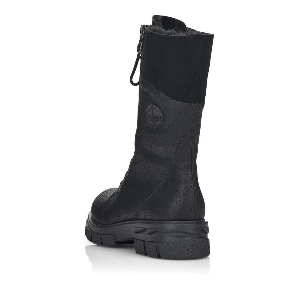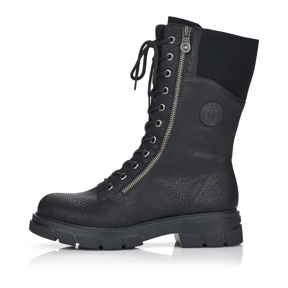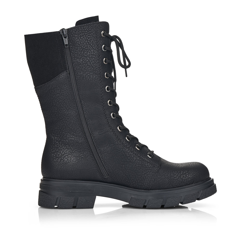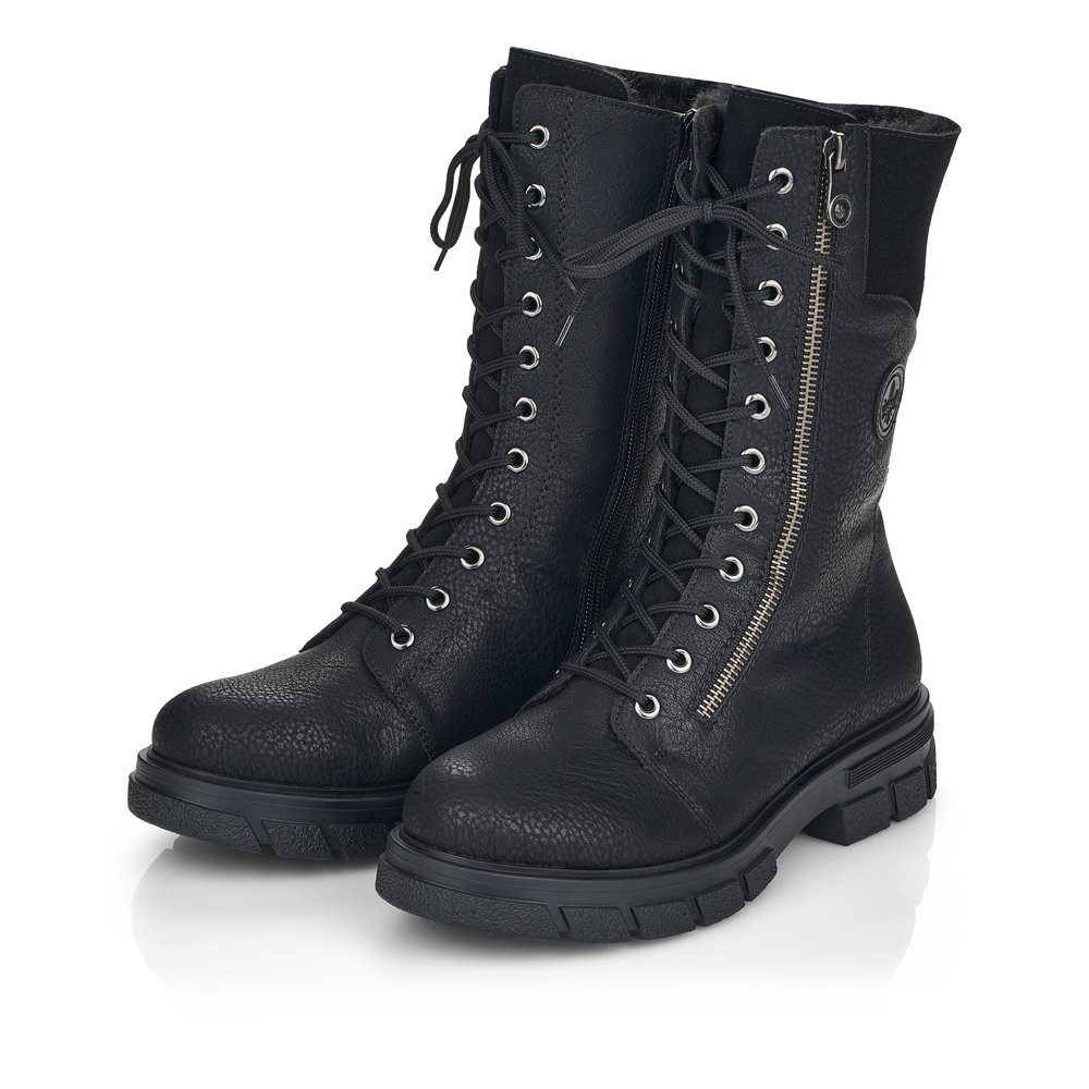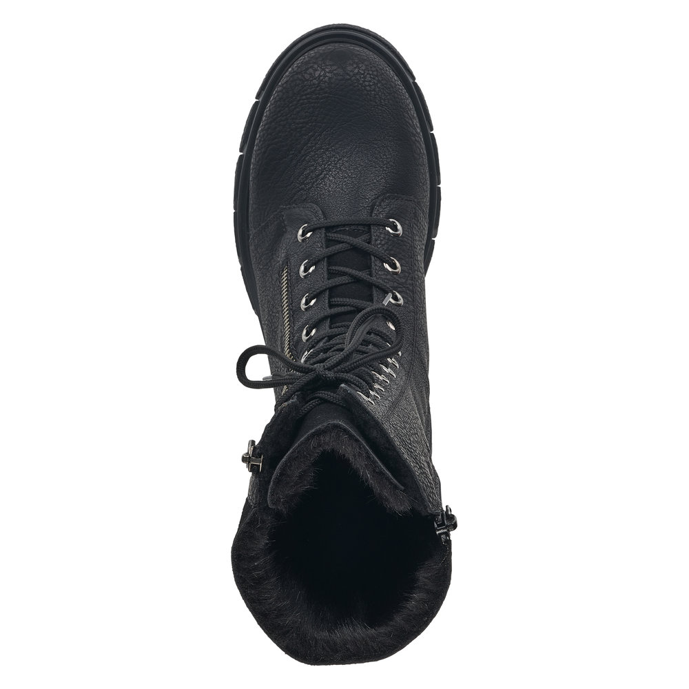 Nádherné dámské polokozačky černé barvy od značky Rieker s výrazným šněrováním. Díky funkčním zipům na obou stranách se Vám budou boty snadno obouvat. Uvnitř najdete příjemně zateplenou podšívku z kožešinky a měkkou stélku. Výrazným designovým prvkem je robustní podešev a podpatek. Tento model bude vypadat dokonale ke každému outfitu, zejména k uplým džínám. Technologie: Antistress - díky této technologii je obuv lehká, flexibilní, absorbuje nárazy při došlapu a snadno se přizpůsobí každé noze.