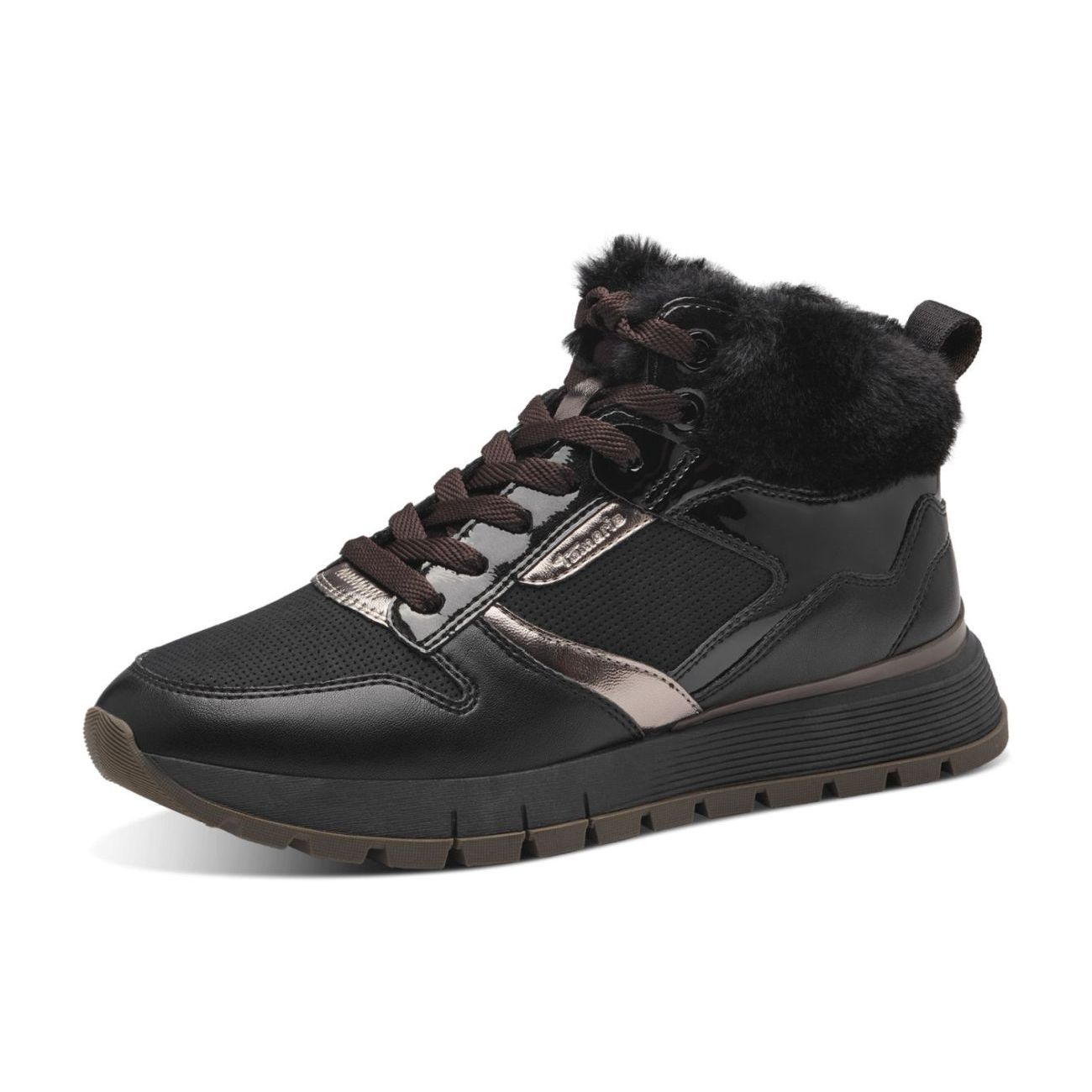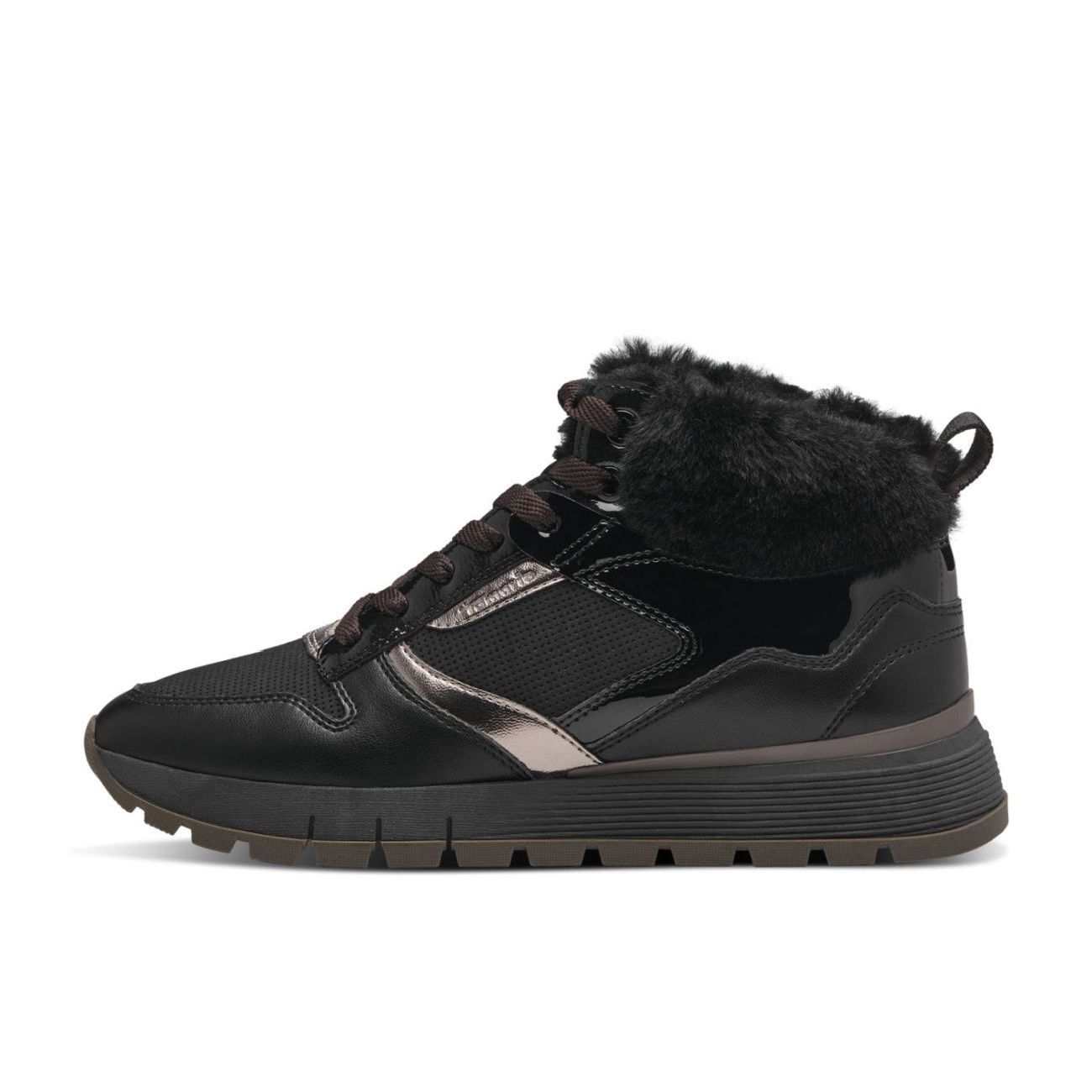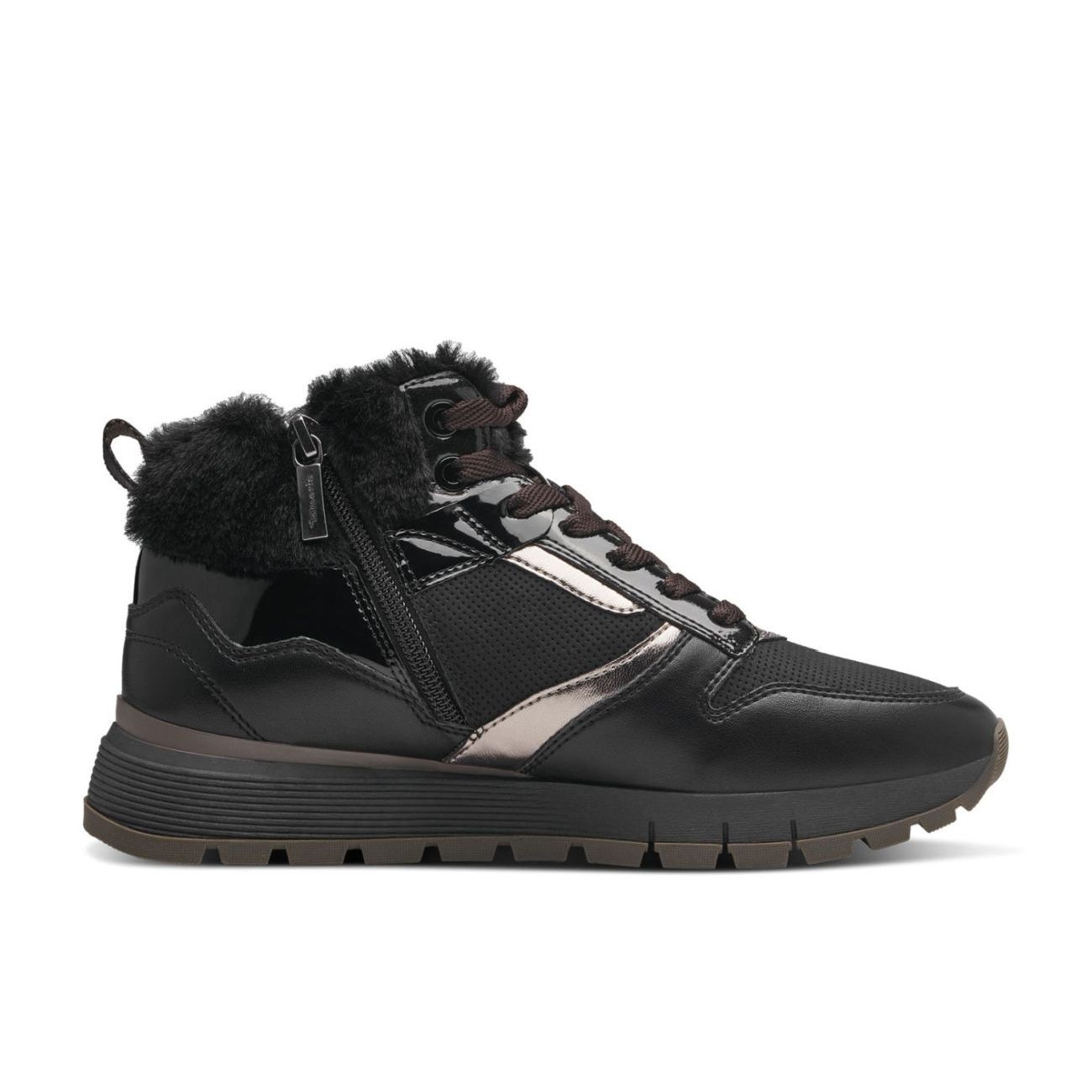 Módní kousek od značky Tamaris, to jsou tyto zimní tenisky v černé barvě, doladěné hnědými tkaničkami a metalickými aplikacemi. Na vnitřní straně mají funkční zip a díky tkaničkám si obuv přizpůsobíte svým potřebám. Měkká stélka a teplá podšívka Vám zaručí pohodlí po celou dobu nošení. Celkový vzhled doladí lem z kožíšku, který dodá třešničku tomuto modelu. Technologie: Vyjímatelná stélka.