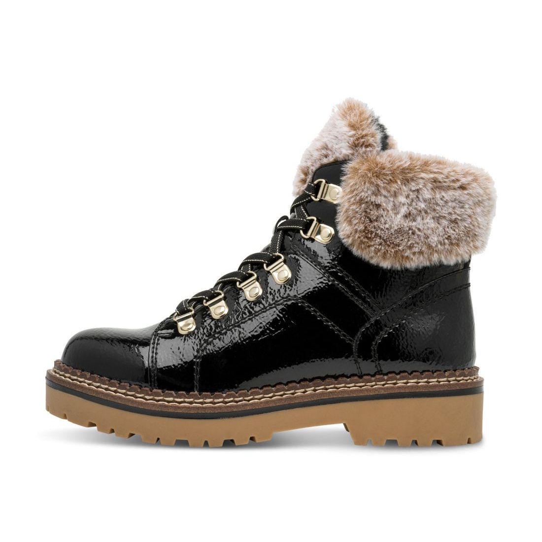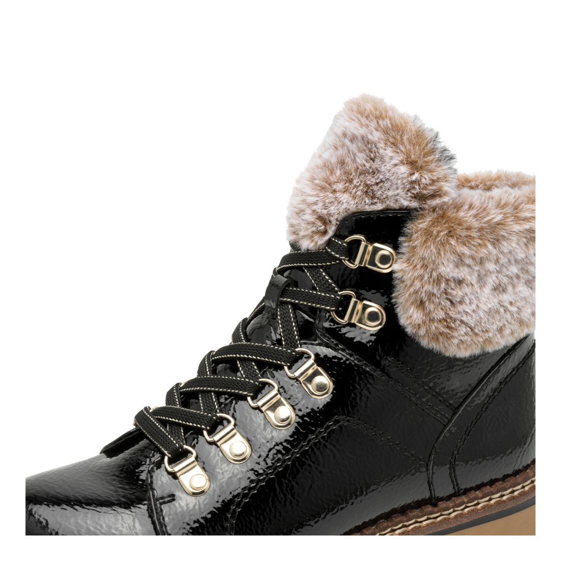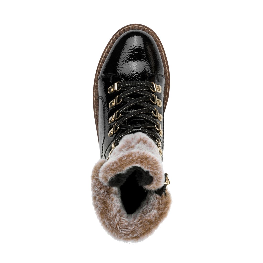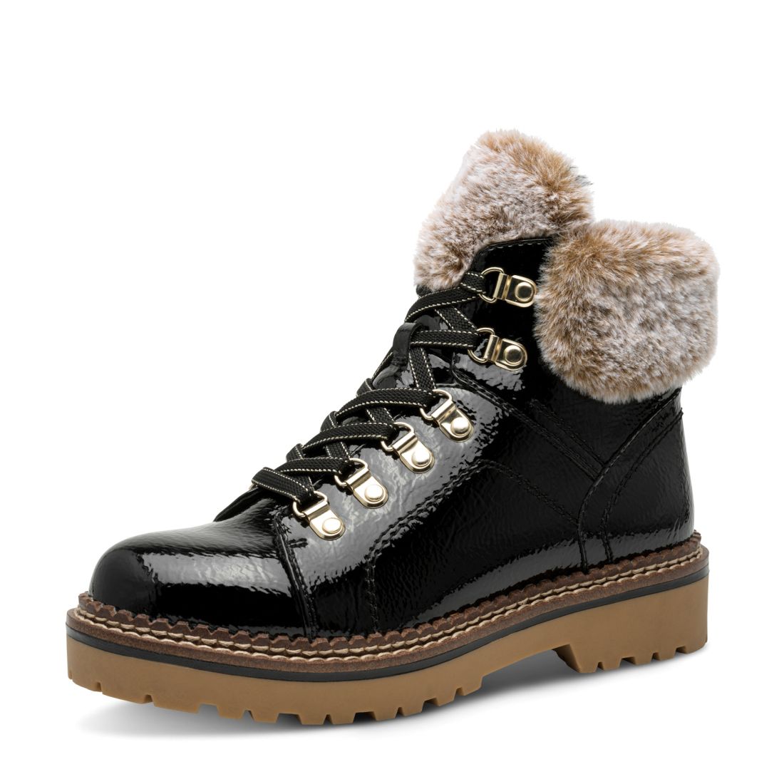 Chcete být stylová a cítit se pohodlně. Nabízíme Vám tyto luxusní kotníkové boty Tamaris v lesklém, černém provedení, s kožíškem kolem kotníku. Tento model je doladěn kovovými očky na tkaničky a tím podtrhuje celkový vzhled obuvi. Funkční zip na vnitřní straně obuvi usnadní obouvání a pomocí tkaniček si obuv přizpůsobíte svým potřebám. Měkká vyjímatelná stélka je velkou výhodou, můžete ji vyvětrat nebo vyměnit třeba za ortopedickou. V nepříznivém počasí oceníte hrubou podešev se vzorkem. Užívejte si podzimní a zimní procházky s těmito botami. Technologie: Tato obuv má vyjímatelnou stélku.