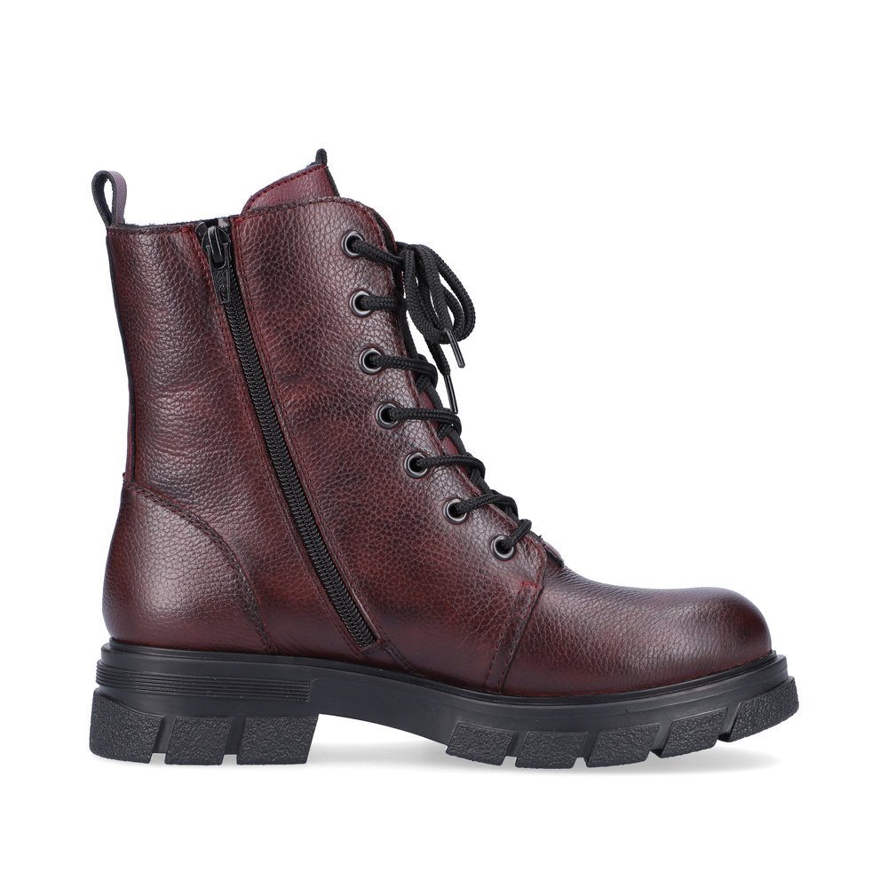 Detailní informace Moderní dámská kožená kotníková obuv značky Rieker ve vínové barvě. Díky šněrování si upravíte šíři obuvi dle svých potřeb. Obouvání Vám usnadní funkční zip z vnitřní strany a poutko v zadní části horního lemu obuvi. Maximální pohodlí budete mít díky měkké stélce, hřejivé podšívce a kvalitní podešvi s technologií Antistress, tato podešev se perfektně přizpůsobí každému kroku a tlumí nárazy, tím chrání páteř. Jistý krok Vám dodá také silnější hrubá podešev se vzorkem.