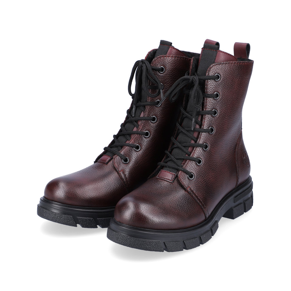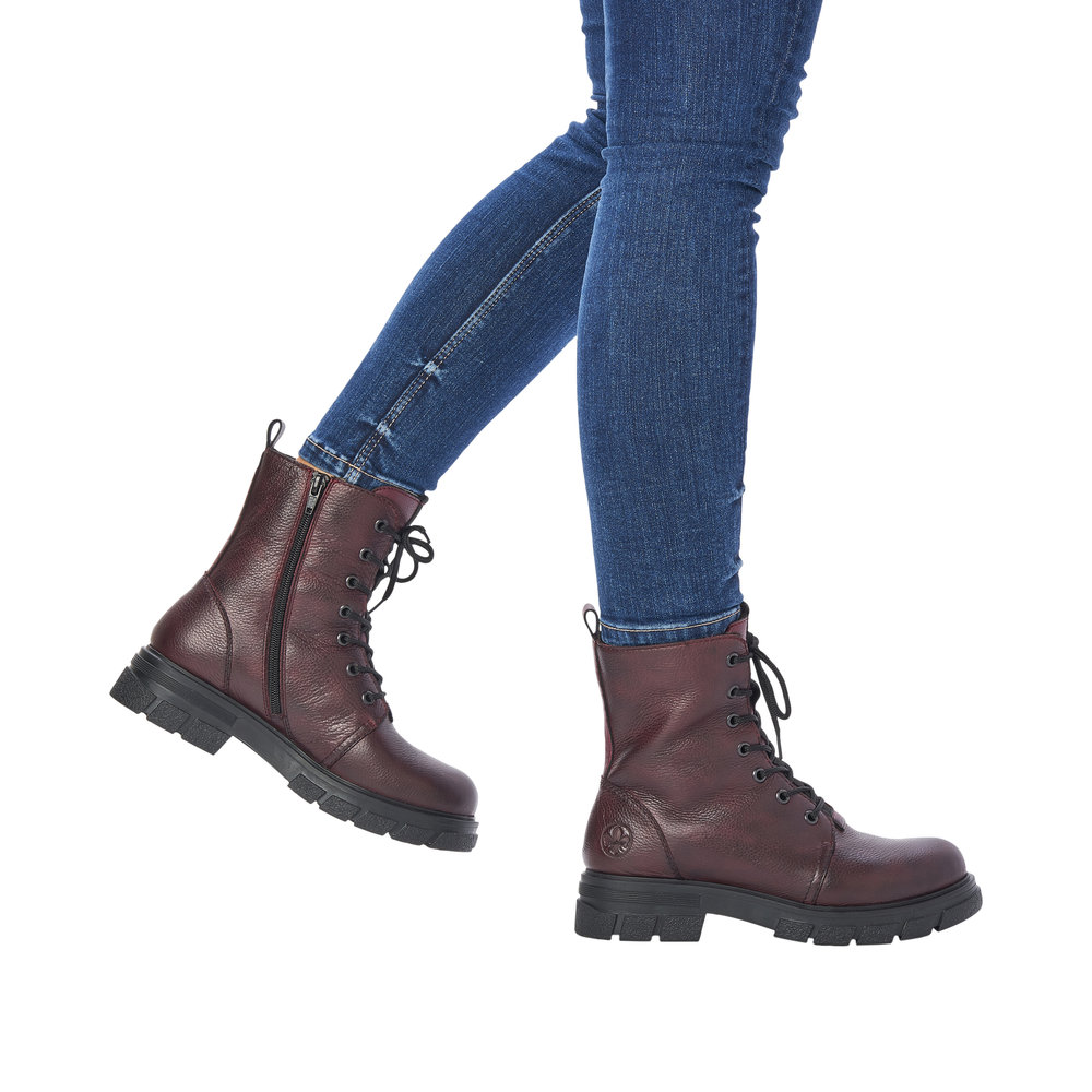 Moderní dámská kožená kotníková obuv značky Rieker ve vínové barvě. Díky šněrování si upravíte šíři obuvi dle svých potřeb. Obouvání Vám usnadní funkční zip z vnitřní strany a poutko v zadní části horního lemu obuvi. Maximální pohodlí budete mít díky měkké stélce, hřejivé podšívce a kvalitní podešvi s technologií Antistress, tato podešev se perfektně přizpůsobí každému kroku a tlumí nárazy, tím chrání páteř. Jistý krok Vám dodá také silnější hrubá podešev se vzorkem. Technologie: Antistress - díky této technologii je obuv lehká, flexibilní, absorbuje nárazy při došlapu a snadno se přizpůsobí každé noze. Výrobní způsob - lepená obuv.