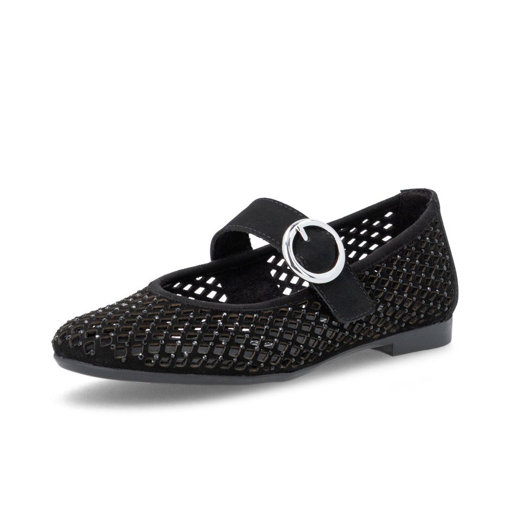Detailní informace Jemné dámské baleríny s perforací od značky Remonte v černé barvě se Vám určitě budou hodit. Mají jemné ozdobné kamínky a pásek přes nárt na suchý zip, takže si obuv přizpůsobíte svým potřebám. Kožená stélka a lehká flexibilní podešev Vám dopřejí pohodlí po celou dobu nošení. Tyto vzdušné balerínky vynosíte každý letní den, ať už do práce, ve volném čase, ale i na slavnostní příležitosti.
