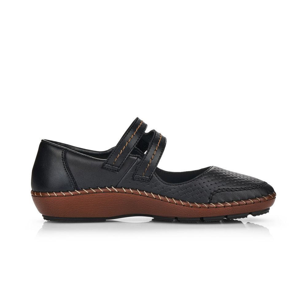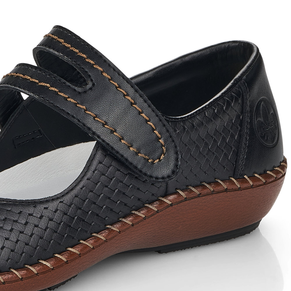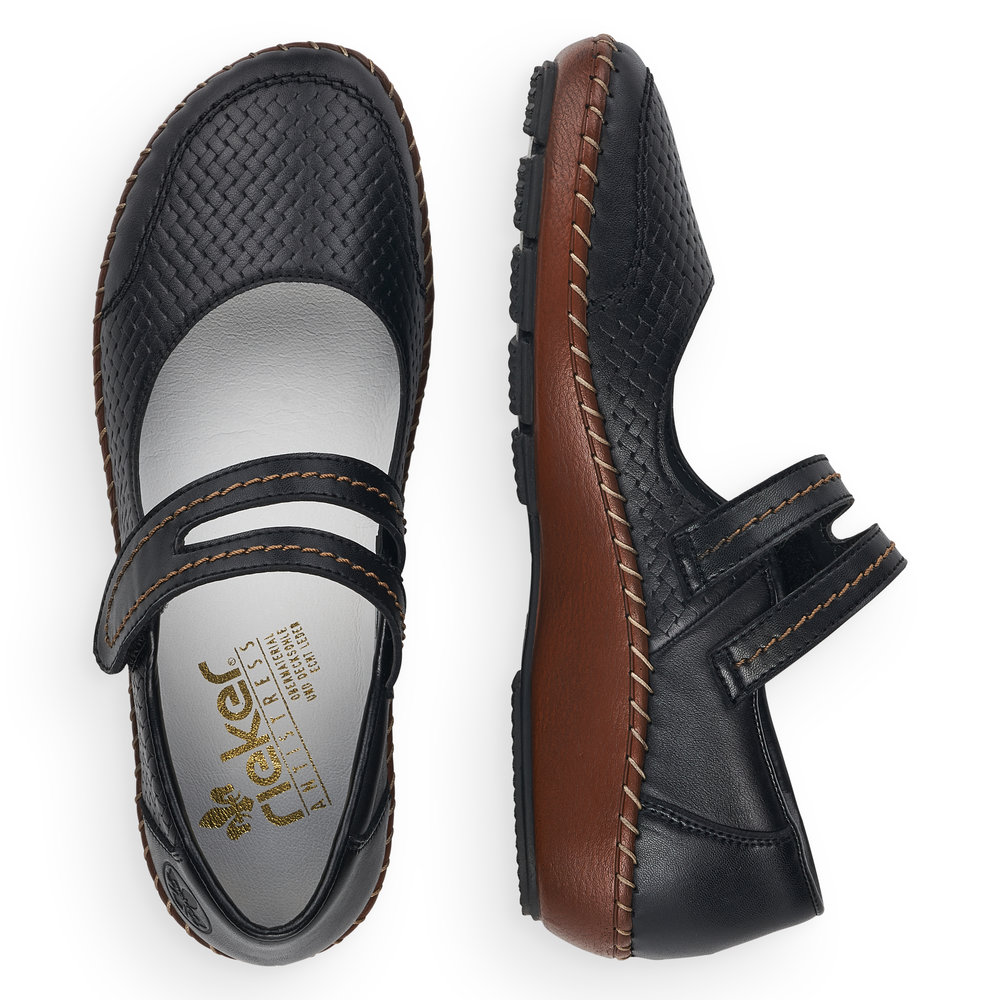 Dámské kožené balerínky Rieker v černé barvě s hnědou podešví jsou to pravé, co hledáte. Pásek na nártu Vám bude perfektně držet nohu a díky zapínání na suchý zip se rychle obujete a vyzujete. Jemně proplétaný vzor na svrchním materiálu je doplněn decentním prošíváním na podešvi a pásku přes nárt. Lehká, pohodlná, flexibilní podešev Vám zajistí pohodlí během celého dne. Technologie: Antistress - podešev je díky této technologii lehká, flexibilní, absorbuje nárazy při došlapu a snadno se přizpůsobí každé noze.