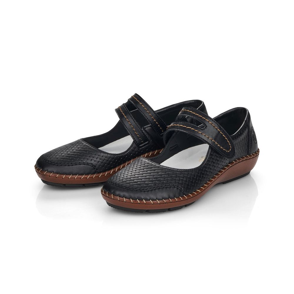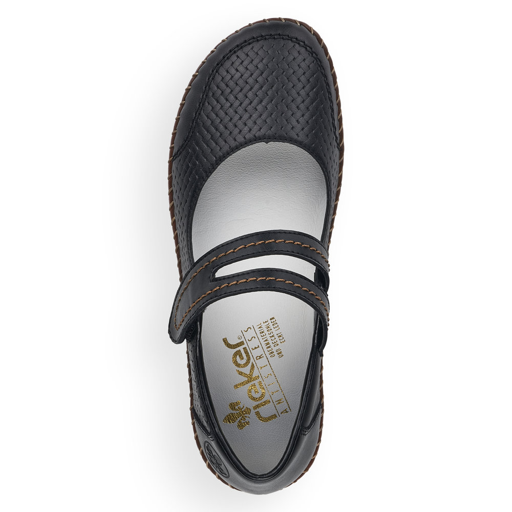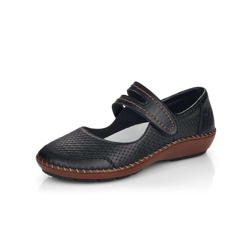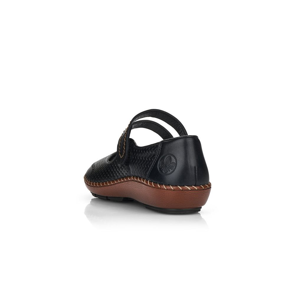 Dámské kožené balerínky Rieker v černé barvě s hnědou podešví jsou to pravé, co hledáte. Pásek na nártu Vám bude perfektně držet nohu a díky zapínání na suchý zip se rychle obujete a vyzujete. Jemně proplétaný vzor na svrchním materiálu je doplněn decentním prošíváním na podešvi a pásku přes nárt. Lehká, pohodlná, flexibilní podešev Vám zajistí pohodlí během celého dne. Technologie: Antistress - podešev je díky této technologii lehká, flexibilní, absorbuje nárazy při došlapu a snadno se přizpůsobí každé noze.