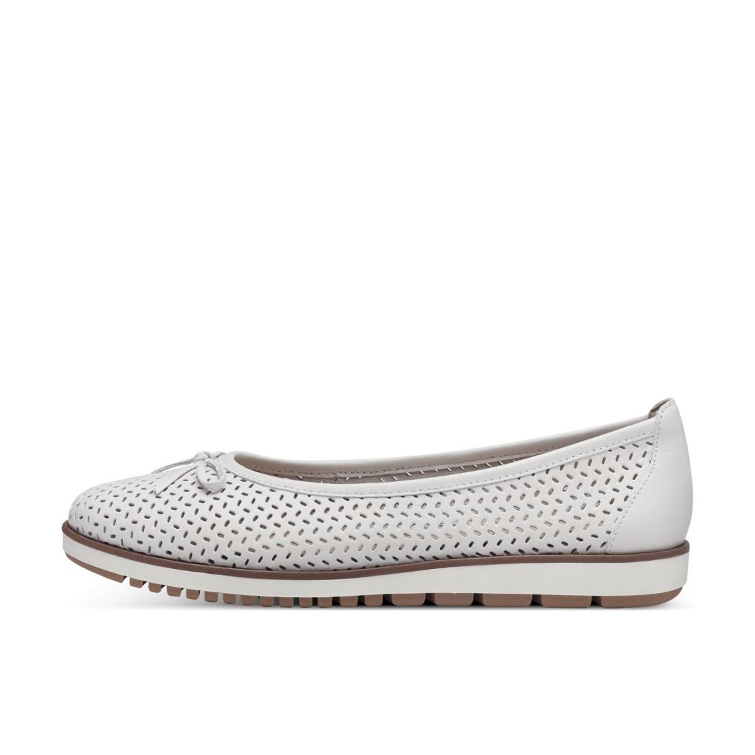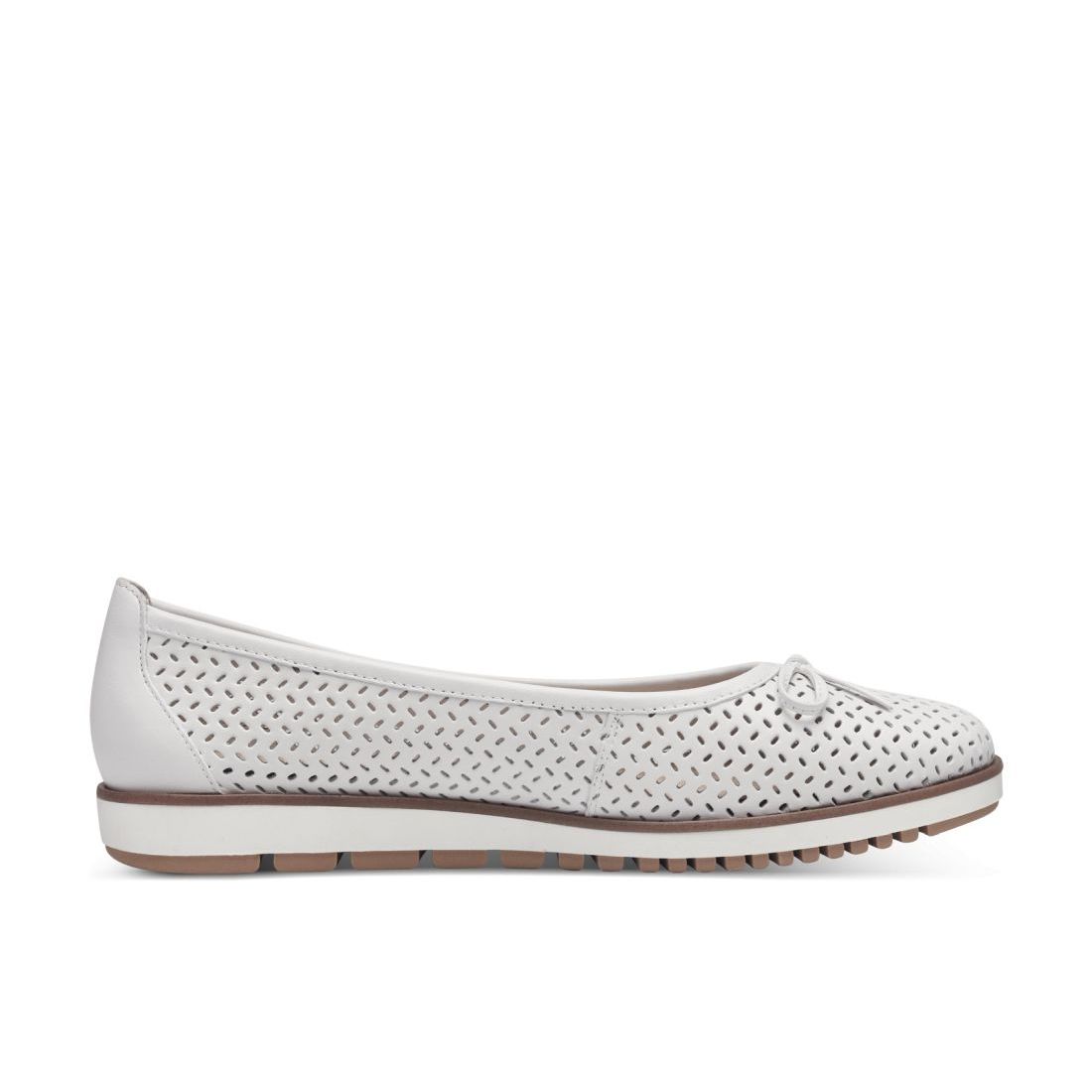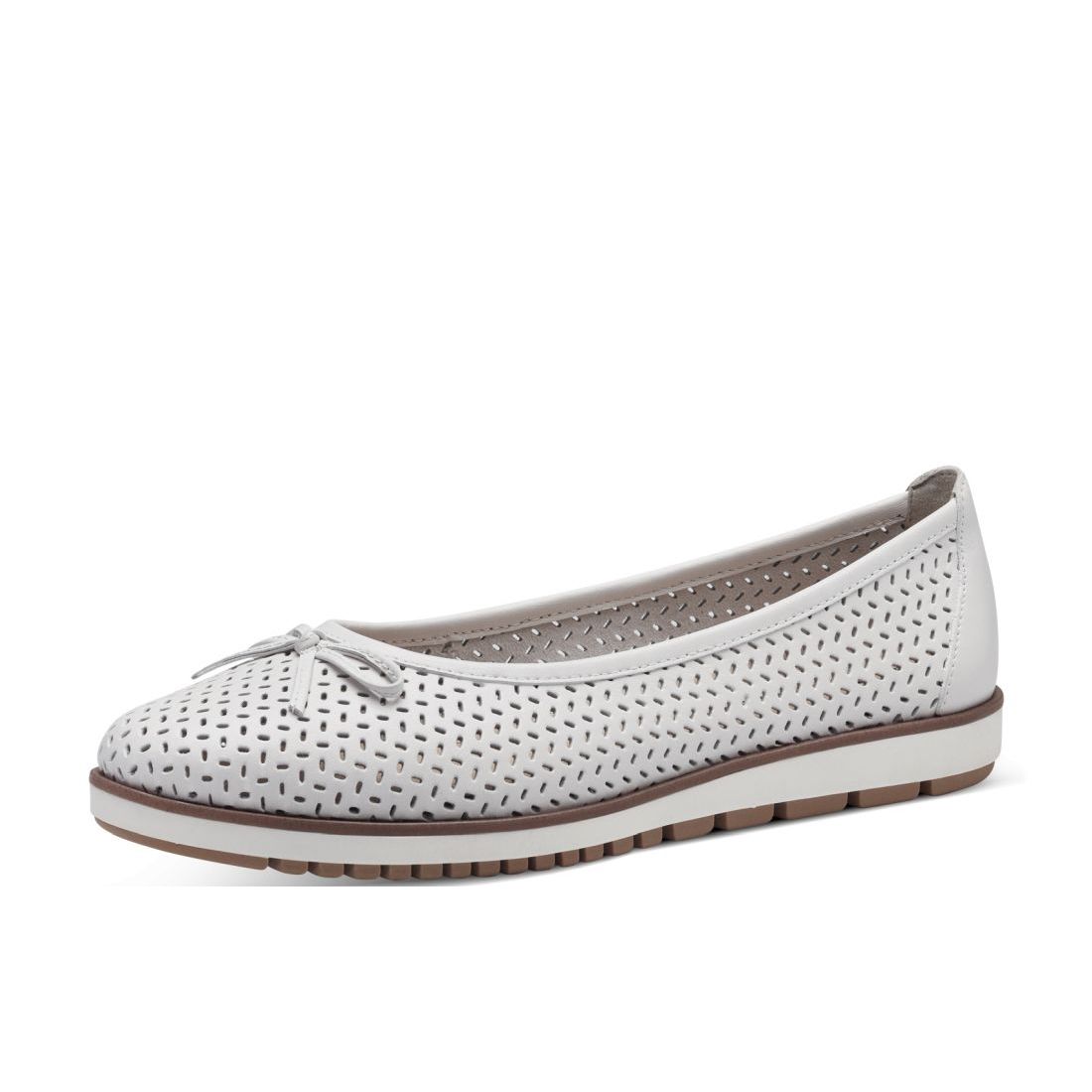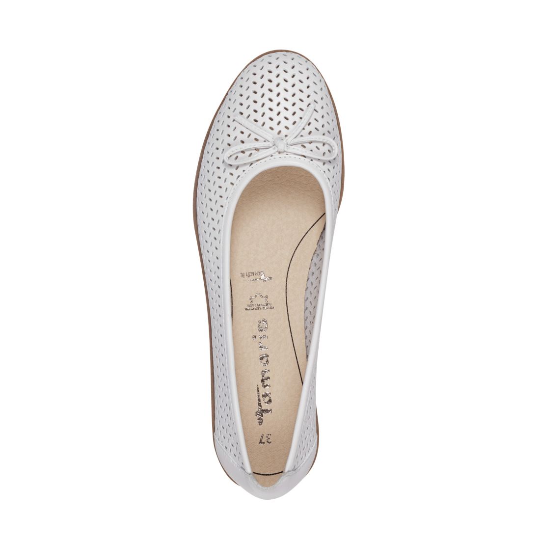Moderní dámské baleríny Tamaris v bílé barvě, které zaujmou svou povrchovou perforací. Svrchní materiál je z přírodní kůže a celkový vzhled dotváří detail v podobě jemné mašličky a hnědé linky kolem cele podešve. Měkká Touch-it stélka se přizpůsobí tvaru Vašeho chodidla, a tak se budete cítit skvěle po celou dobu nošení. Ať už do práce nebo do společnosti jsou skvělou volbou. Technologie: Touch-it - měkká stélka, která se dokonale přizpůsobí tvaru nohy, a díky tomu při nošení zajišťuje optimální pohodlí.