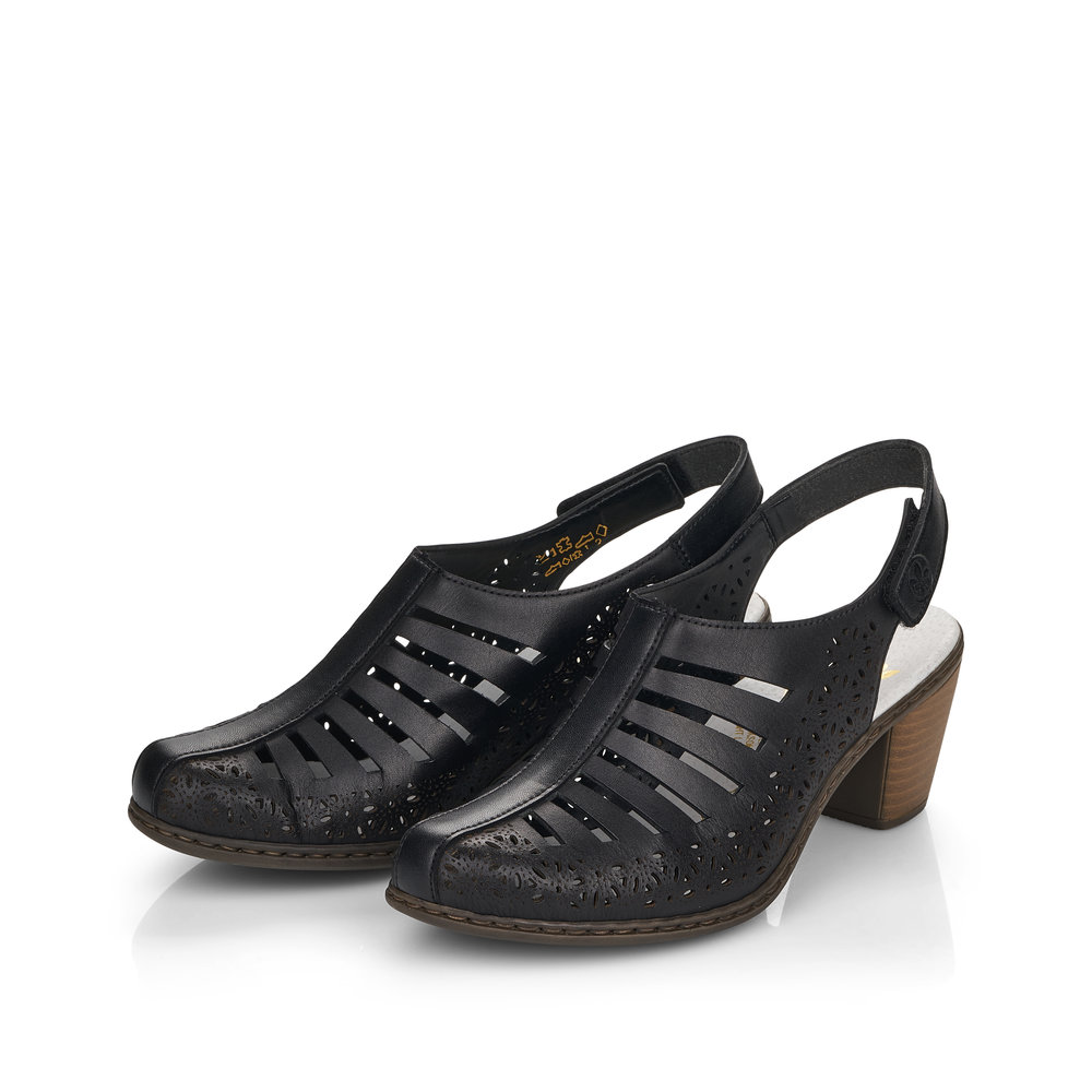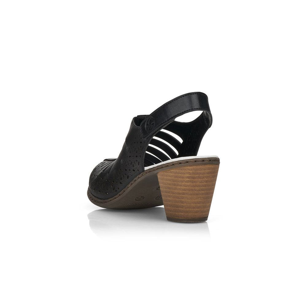 Stylové dámské kožené sandály na podpatku od značky Rieker v černé barvě. Tyto boty jsou to pravé do práce nebo na schůzky s přáteli. Uzavřená špice a perforace jsou pro letní dny tou pravou volbou. Snadné obouvání zajistí pásek na suchý zip. V letních dnech oceníte koženou stélku, která se spolu s flexibilní podešví postarají o Vaše pohodlí. Ať už zvolíte sukni nebo kalhoty, neuděláte chybu. Tento model nabízíme na našem e-shopu v další barevné kombinaci (platí do vyprodání zásob). Technologie: Antistress - podešev je díky této technologii lehká, flexibilní, absorbuje nárazy při došlapu a snadno se přizpůsobí každé noze.