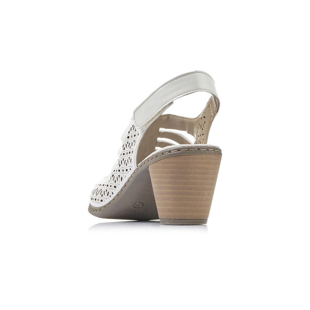 Stylové dámské kožené sandály na podpatku od značky Rieker v bílé barvě. Tyto boty jsou to pravé do práce nebo na schůzky s přáteli. Uzavřená špice a perforace jsou pro letní dny tou pravou volbou. Snadné obouvání zajistí pásek na suchý zip. V letních dnech oceníte koženou stélku, která se spolu s flexibilní podešví postarají o Vaše pohodlí. Ať už zvolíte sukni nebo kalhoty, neuděláte chybu. Tento model nabízíme na našem e-shopu v další barevné kombinaci (platí do vyprodání zásob). Technologie: Antistress - podešev je díky této technologii lehká, flexibilní, absorbuje nárazy při došlapu a snadno se přizpůsobí každé noze.