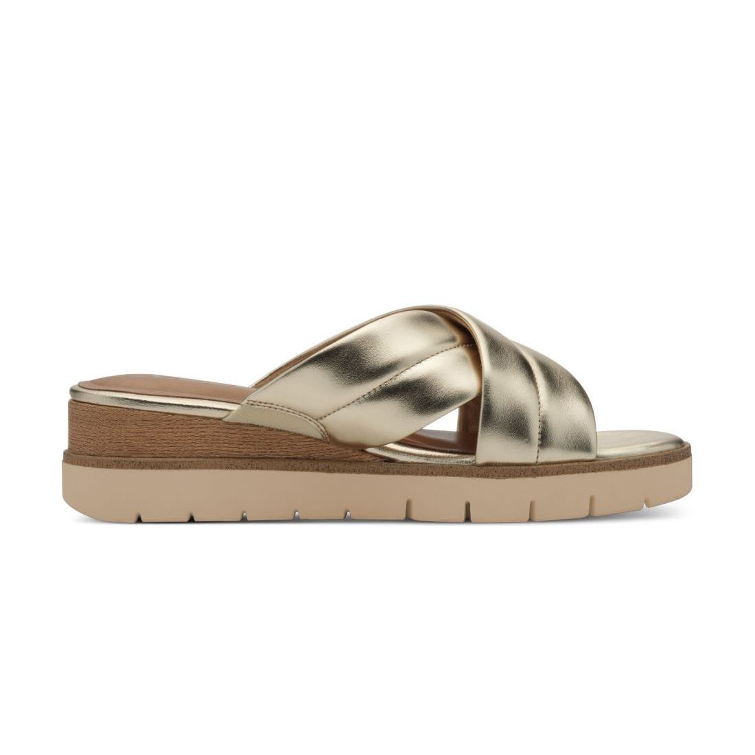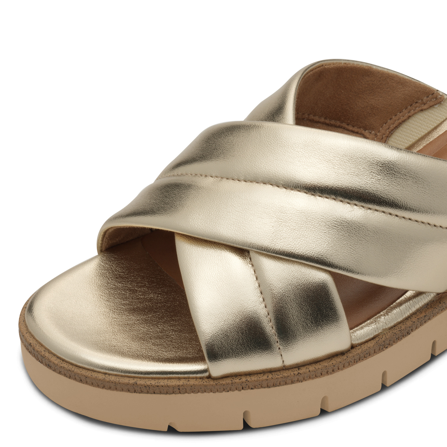 Elegantní dámské kožené nazouváky od značky Tamaris ve zlaté barvě. Tyto pantofle si rychle oblíbíte díky svému modernímu provedení, praktičnosti a pohodlnosti. Na první pohled zaujmou dva překřížené pásky, které vypdají skvěle na noze. Vaše chodidla budou "jako v bavlnce" díky měkké Touch it stélce z přírodní kůže. Tyto boty jsou ideálním společníkem pro teplé letní dny. Snadno se kombinují s jakýmkoliv outfitem. Technologie: Touch it - měkká stélka z paměťové pěny, která neustále reaguje na tlak a přizpůsobuje se tvaru chodidla.