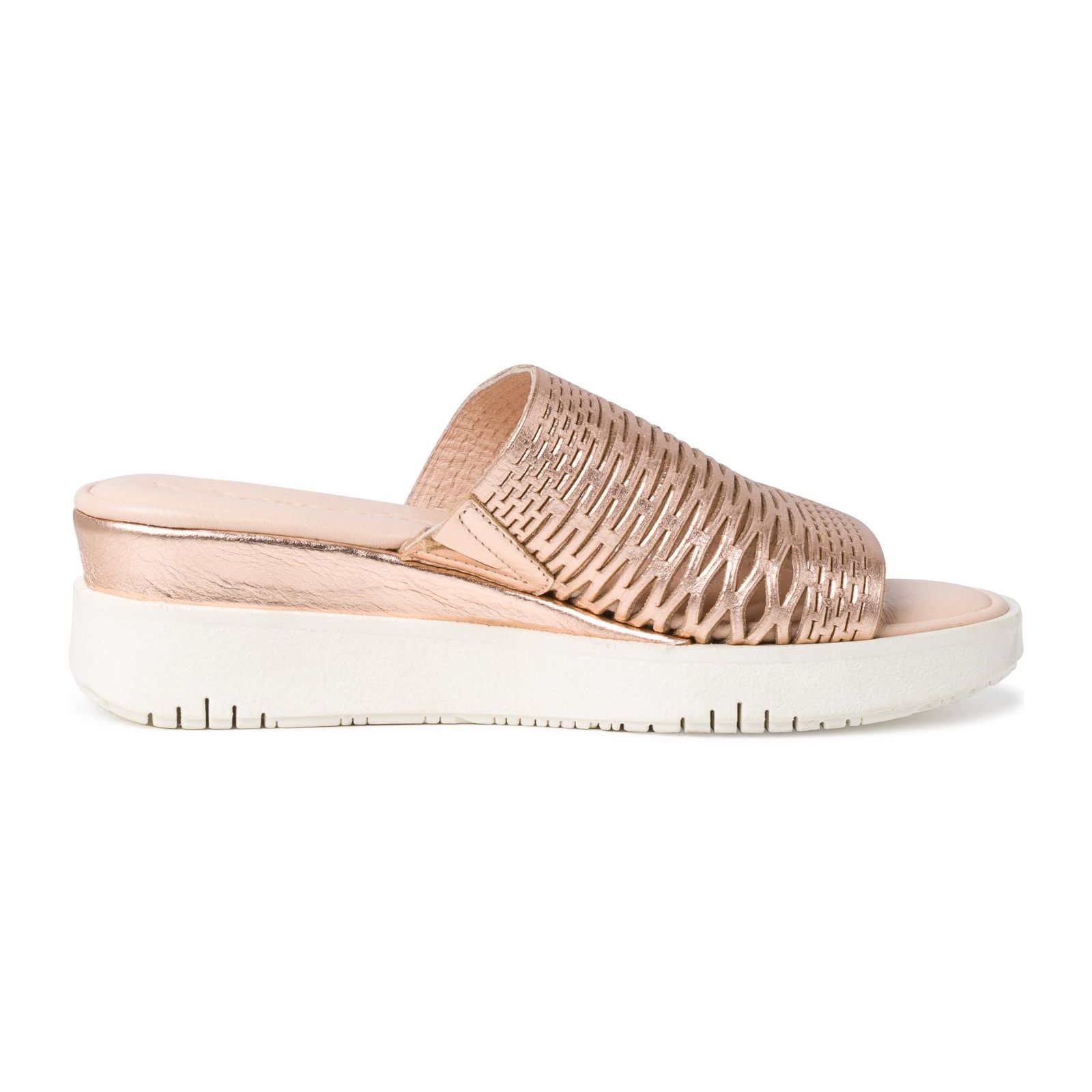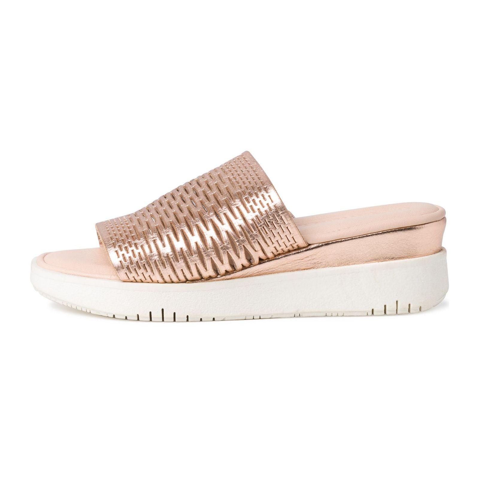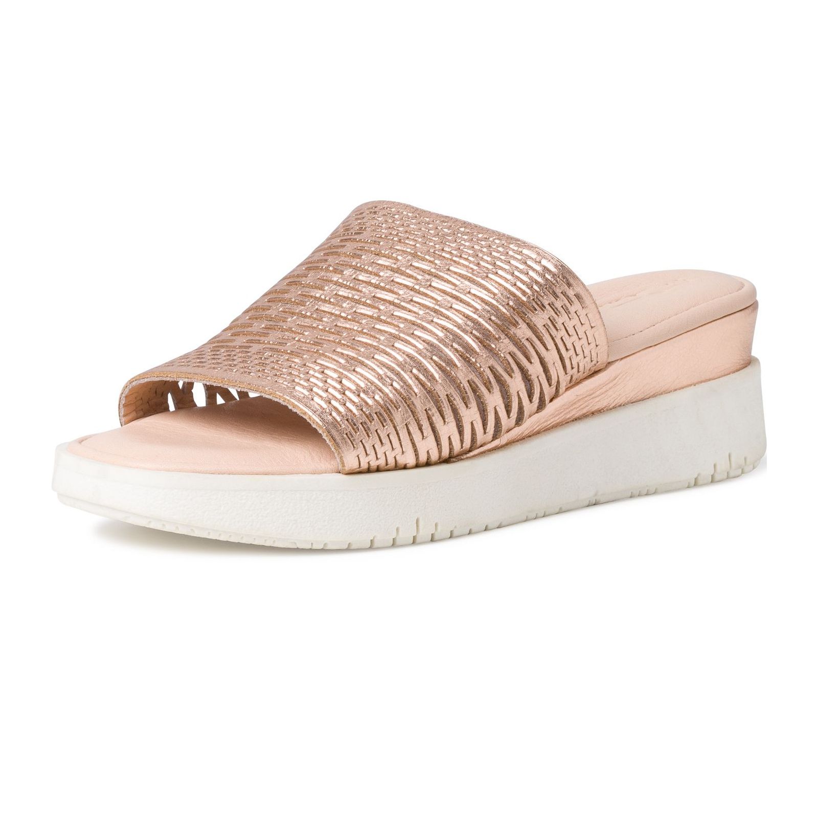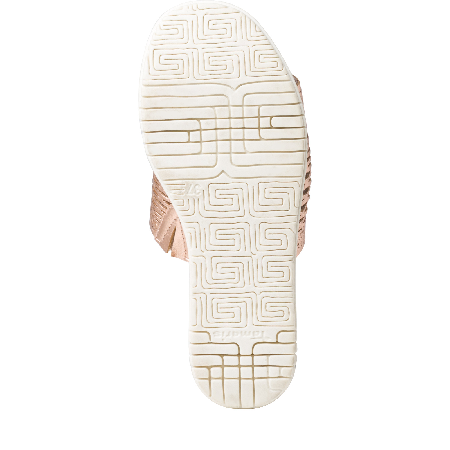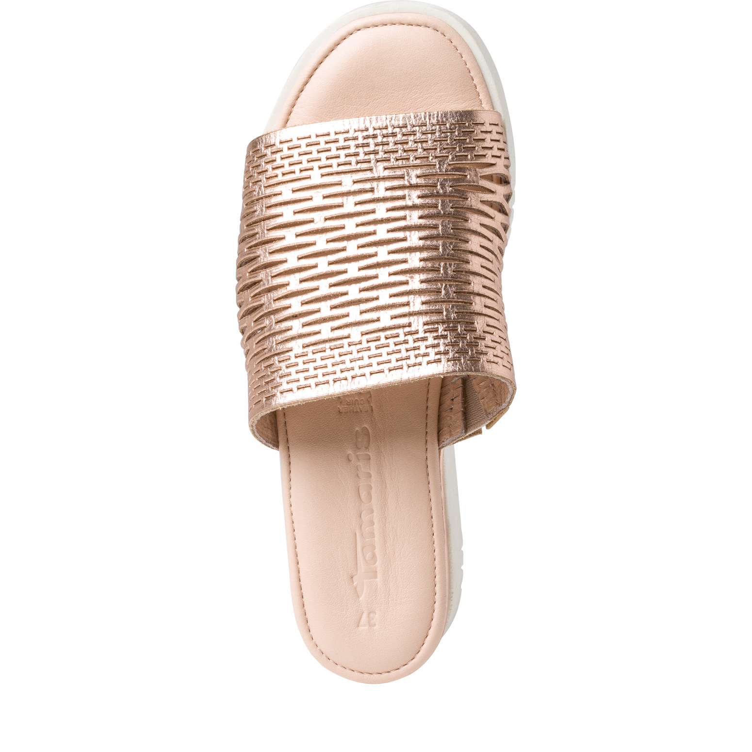 Detailní informace V těchto dámských pantoflích Tamaris růžovo-zlaté barvy, si léto užijete naplno. Díky zajímavé perforaci, na širokém pásku, se i v těch nejteplejších dnech budete cítit svěže. Tyto kožené pantofle mají měkkou koženou stélku, která Vám zpříjemní každý krok. Lehce je zkombinujete, jak se sukní nebo kalhotami.