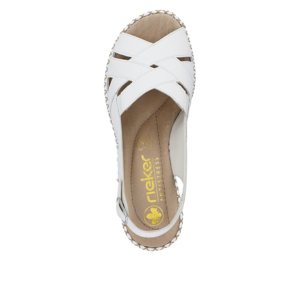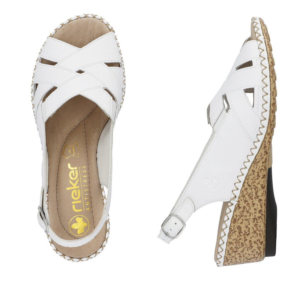 Pohodlné letní sandály Rieker, v bílé barvě, se budou v létě určitě hodit. Jsou vyrobeny z pravé kůže. Překřížené pásky na nártu a pohodlný klínek tvoří vyjímečný model. Snadné obouvání díky přezce. Měkká stélka a flexibilní podešev Vám zaručí pohodlí po celý čas nošení. K letním kalhotám i sukni budou vypadat skvěle. Technologie: Antistress - podešev je díky této technologii lehká, flexibilní, absorbuje nárazy při došlapu a snadno se přizpůsobí každé noze. Výrobní způsob - šitá obuv.