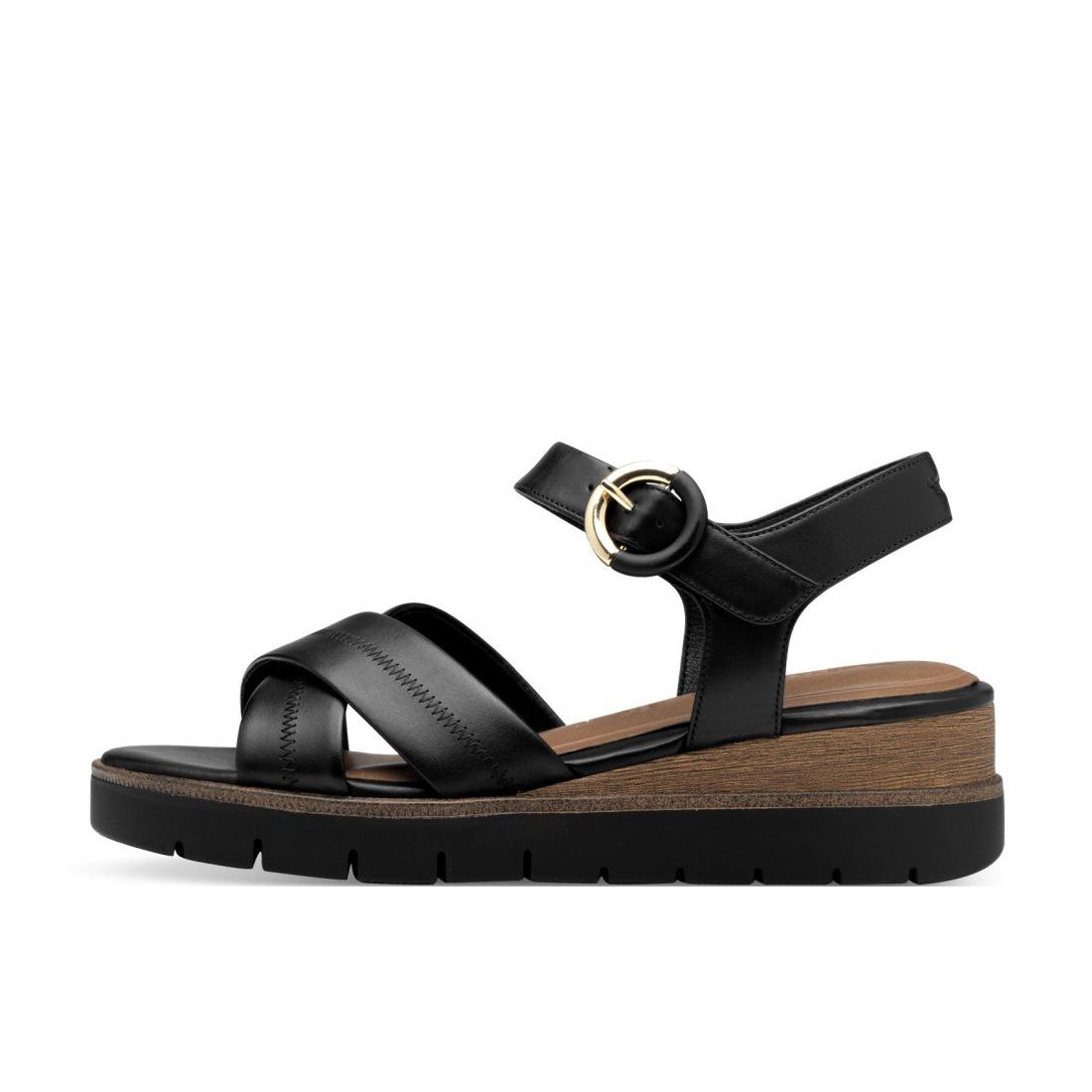Elegantní dámské sandály Tamaris v černé barvě. Svrchní materiál je z přírodní kůže. Na první pohled zaujmou stylově překřížené pásky v nártové části a ozdobná spona u pásku kolem kotníku, která je navíc funkční. Pohodlí na každém kroku budete mít díky měkké Touch-it stélce z paměťové pěny. Stabilitu Vám poskytne vyvýšená klínková podešev. Tento model bude ozdobou Vašeho outfitu. Technologie: Touch-it - měkká stélka, která se dokonale přizpůsobí tvaru nohy, a díky tomu při nošení zajišťuje optimální pohodlí.