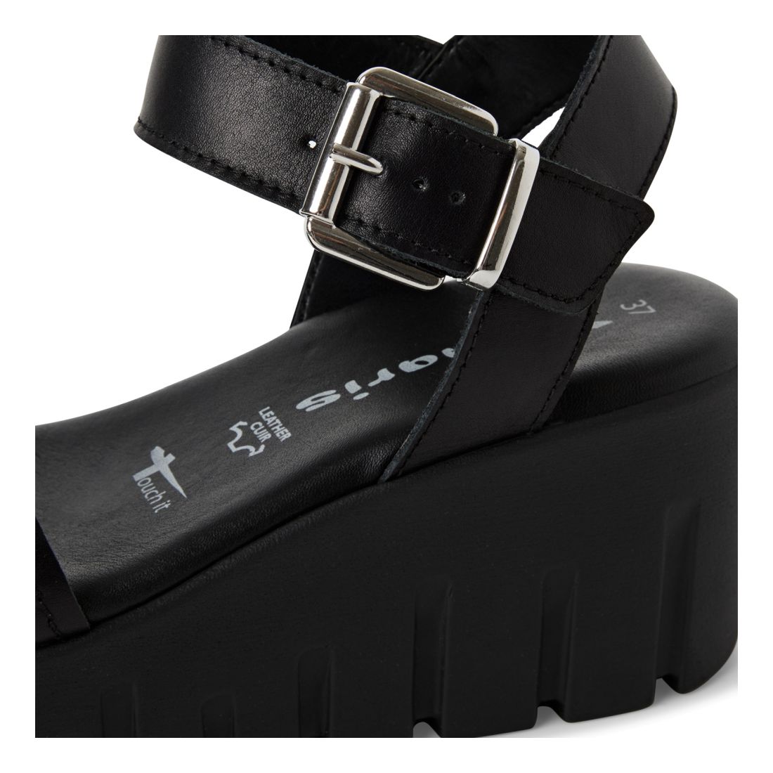 Moderní dámské sandály Tamaris v černé barvě s designovou platformou. Svrchní materiál je z přírodní kůže. Horní pásek má ozdobnou a zároveň funkční sponu. Pohodlí na každém kroku budete mít díky měkké Touch-it stélce z paměťové pěny. Stabilitu Vám poskytne vyvýšená platforma. Tento model bude ozdobou Vašeho outfitu. Technologie: Touch-it - měkká stélka, která se dokonale přizpůsobí tvaru nohy, a díky tomu při nošení zajišťuje optimální pohodlí.
