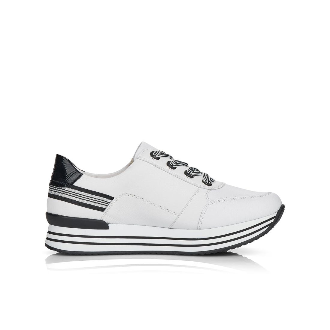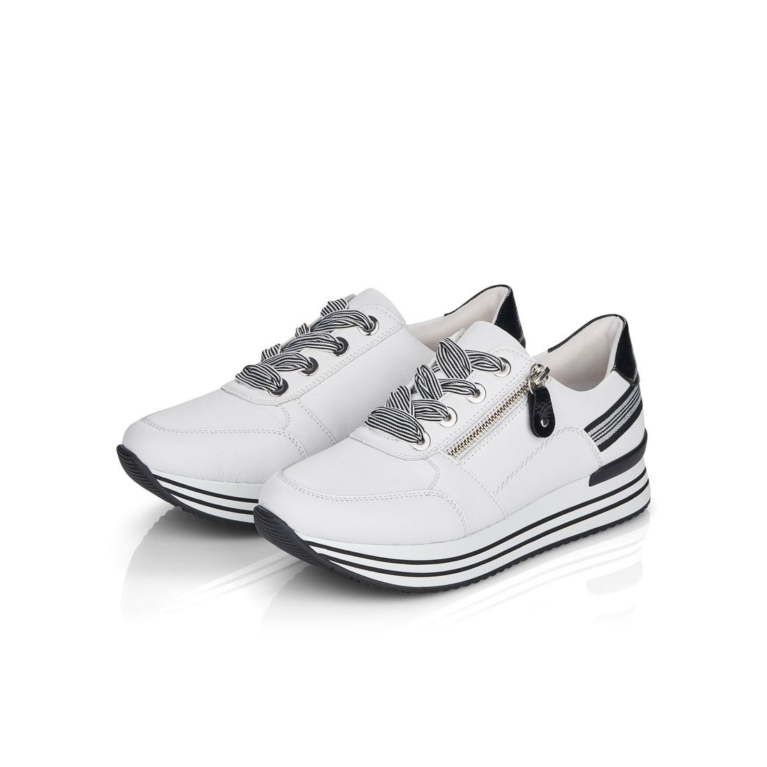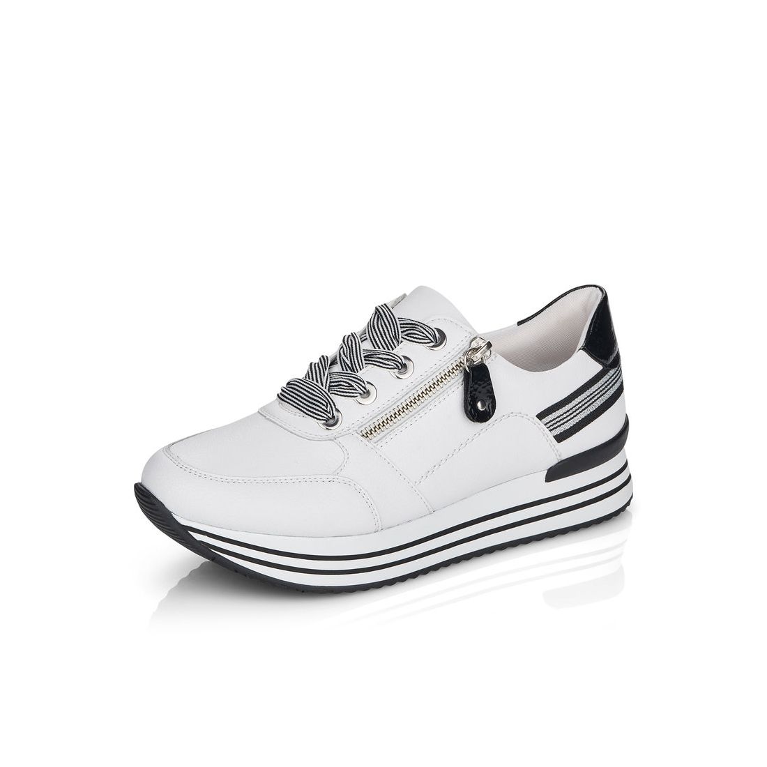 Znáte značku Rieker? Pokud ano, určitě nám dáte za pravdu, že je obuv velmi pohodlná. Značka Remonte je vyšší řadou značky Rieker a zakládá si na vysoké kvalitě a pohodlnosti, proto obuv této značky je vyráběna z vysoce kvalitních materiálů a je často dodávána i v NADMĚRNÝCH velikostech. Tyto stylové tenisky od značky Remonte zaujmou svým originálním designem. Na první pohled zaujme kombinace bílého svršku s ozdobnými černými, lakovanými prvky a výraznými tkaničkami. Díky nim a fuknčnímu zipu na nártu, se boty snadno obouvají a dokonale se přizpůsobí tvaru Vašeho chodidla. Pohodlí po celý den v těchto botách budete mít díky pohodlné měkké stélce a kvalitní podešvi. Technologie: RemonteSoft - patentovaná technologie stélky z paměťové pěny, která se perfektně přizpůsobí tvaru Vašeho chodidla. Tyto boty mají vyjímatelnou stélku z paměťové pěny, která se perfektně přizpůsobí tvaru Vaší nohy.