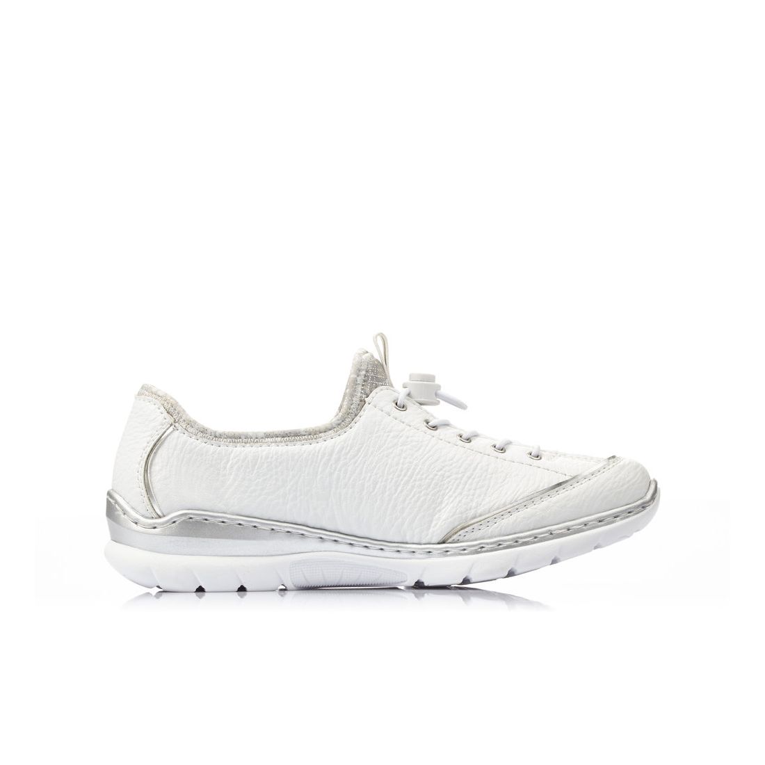 Velmi pohodlné dámské tenisky od značky Rieker v bílé barvě. Uvnitř najdete měkkou stélku z paměťové pěny, která změkčuje došlap a zároveň se maximálně přizpůsobuje tvaru Vaší nohy. Pohodlí Vám zajistí flexibilní podešev se systémem Antistress, která perfektně tlumí při došlapu nárazy a otřesy, čímž šetří tlak na Vaše nohy a páteř.Není nač čekat. Pokud hledáte kvalitní boty, tak jste je právě našla. Technologie: Antistress - podešev je díky této technologii lehká, flexibilní, absorbuje nárazy při došlapu a snadno se přizpůsobí každé noze. MemoSoft - stélka s paměťovou pěnou, která se perfektně přizpůsobí tvaru Vaší nohy.
