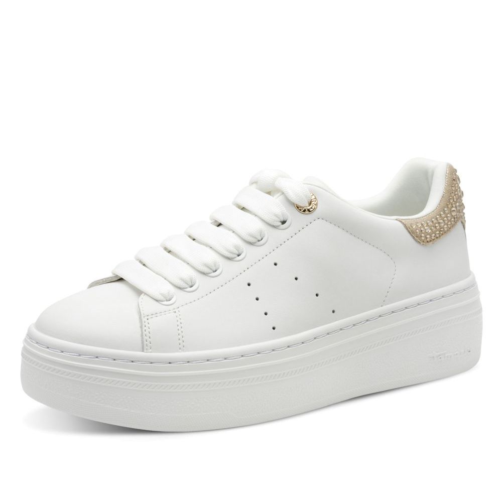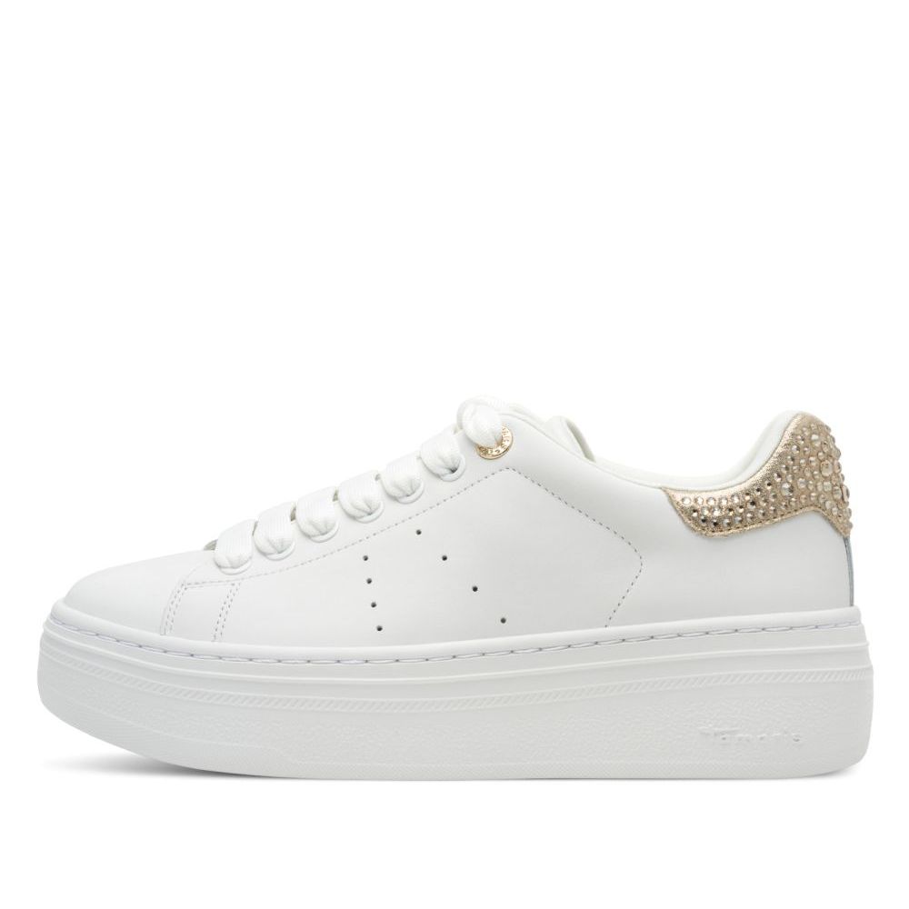 Detailní informace Krásné dámské tenisky Tamaris bílé barvy, v jednoduchém stylu, dolaněny kamínky, na vysoké podešvi, která zvýrazní Vaší osobnost. V této obuvi vydržíte po celý den díky měkké vyjímatelné stélce z paměťové pěny, která se přizpůsobí tvaru chodidla. Tento model vynosite k riflím, legínám i sukni. Tenisky by neměly chybět v botníku moderní ženy.