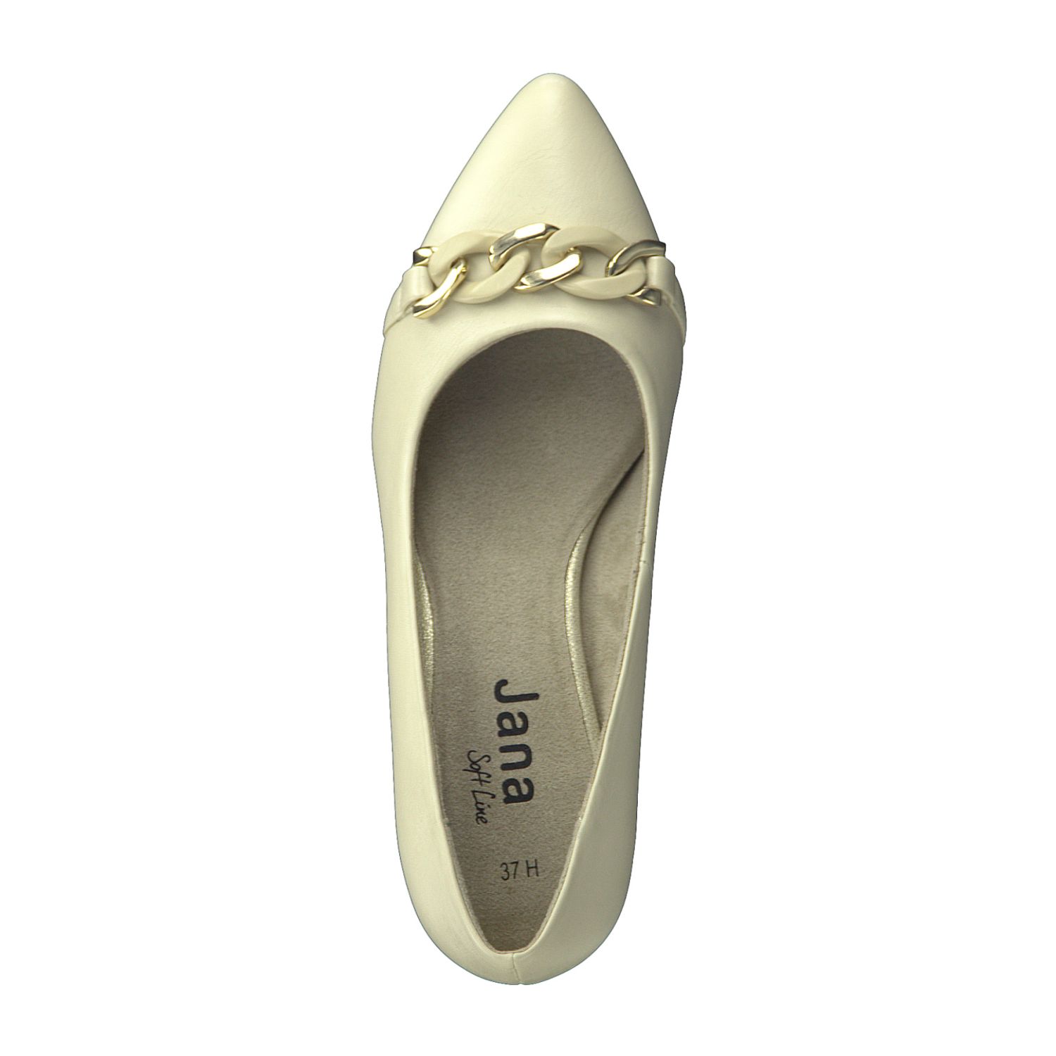 Detailní informace Elegantní béžové lodičky na podpatku od zn. Jana . V jednoduchosti je síla. Tímto heslem se řídili při výrobě tohoto modelu. Boty mají hladký povrch ze syntetického materiálu a ozdobnou aplikaci v podobě propleteného řetízku. Uvnitř obuvi najdete pohodlnou měkkou stélku. Kvalitní a stabilní podpatek Vám zaručí pohodlnou chůzi po celý den. Obuv šíře H (široká obuv).