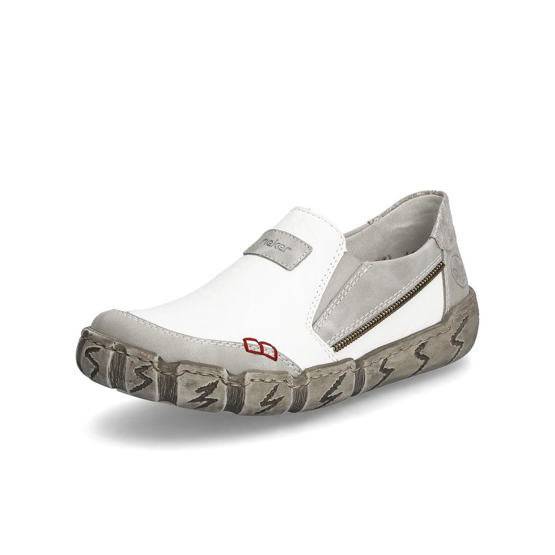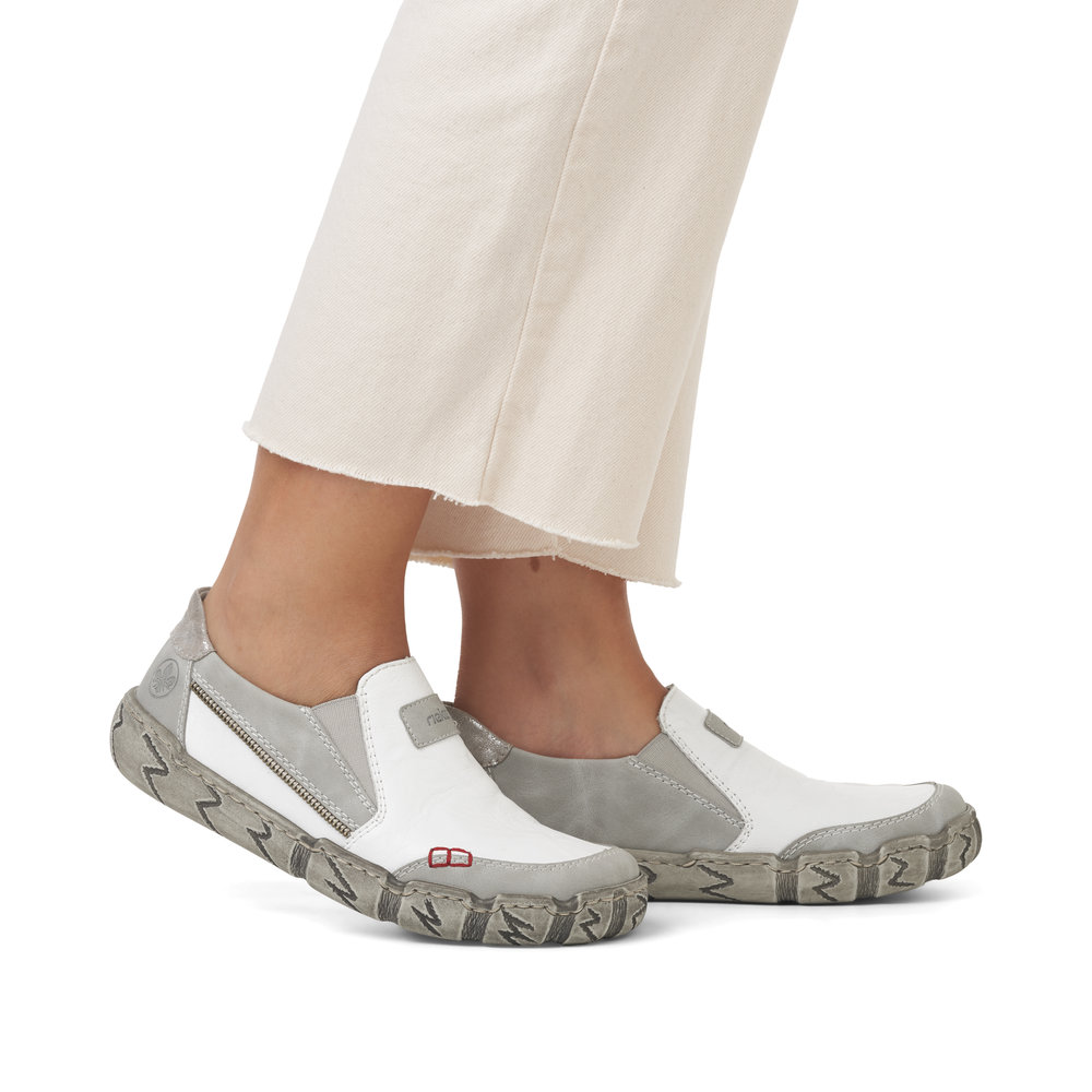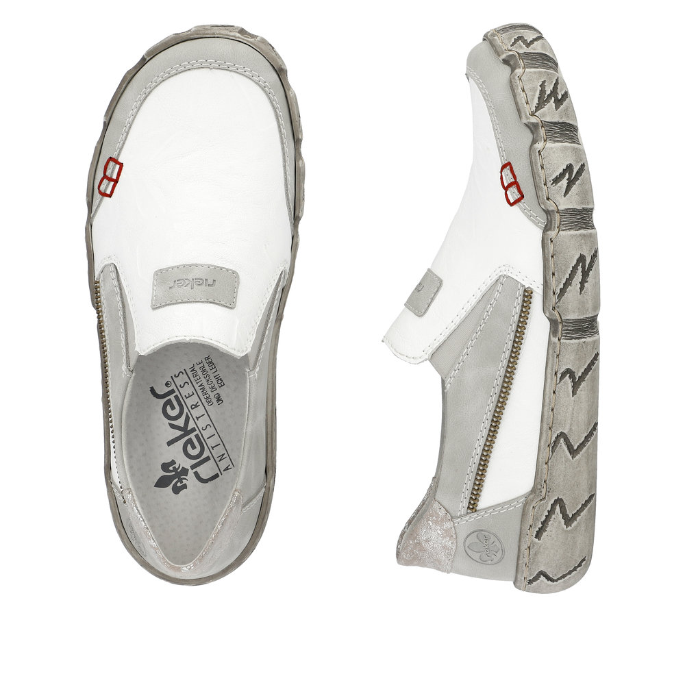 Dámské mokasíny Rieker, na oblíbené podešvi, musíte mít. Bílo-šedá barevná kombinace je doladěna červeným prošitím a okrasným zipem na boku. Kožená stélka je zárukou pohodlí. Flexibilní podešev se přizpůsobí každému Vašemu kroku. Ať už zvolíte rifle, sportovní kalhoty, sukni nebo kraťase, tyto boty se budu hodit ke všemu. Technologie: Antistress - podešev je díky této technologii lehká, flexibilní, absorbuje nárazy při došlapu a snadno se přizpůsobí každé noze. Výrobní způsob - šitá obuv.