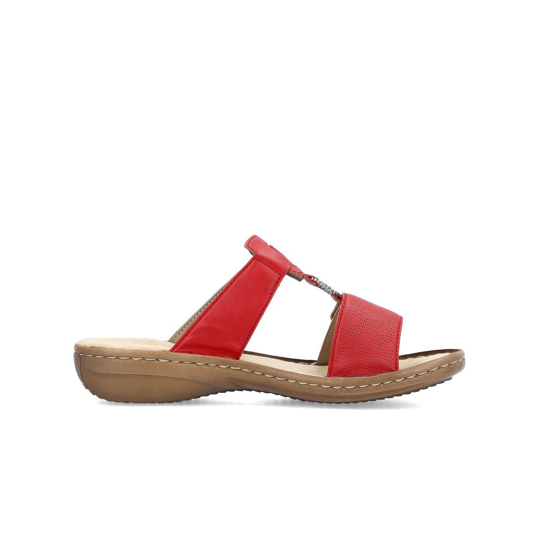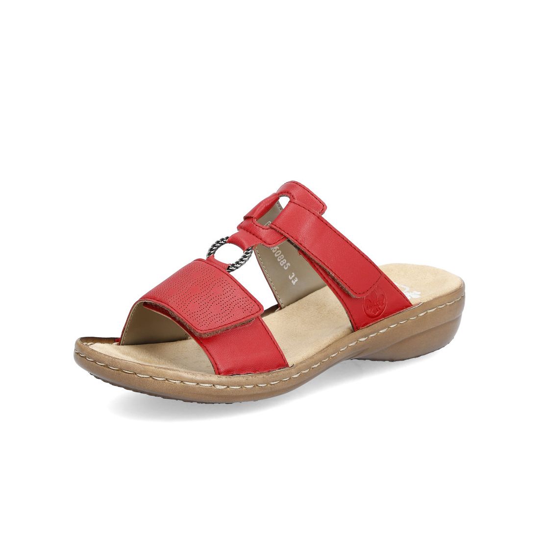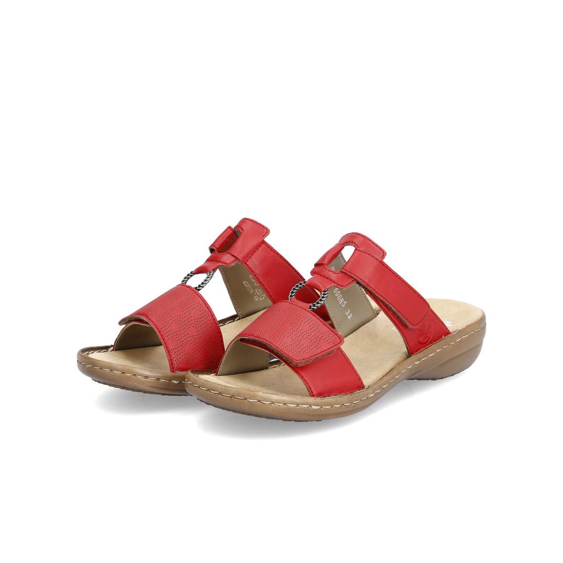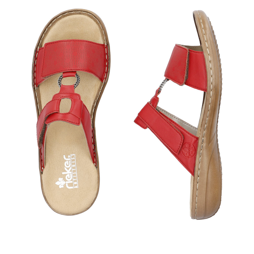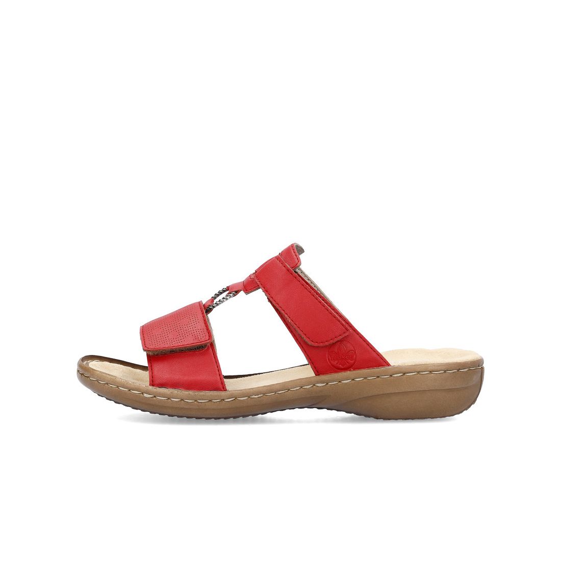 Dámské pantofle Rieker v červené barvě s ozdobným kovovým spojovacím kroužkem na nártu. Díky oběma nastavitelným páskům se zapínáním na suchý zip, si můžete obuv přizpůsobit přesně podle Vašich představ. O pohodlí se Vám postará měkká stélka a flexibilní podešev s technologií Antistress, která skvěle tlumí nárazy a otřesy, čímž šetří zejména tlak na Vaše nohy a Vaši páteř. Tyto letní nazouváky se Vám budou hodit k sukni, šatům nebo kalhotám, a tak je lehce sladíte s Vaším oblečením. Tento model nabízíme na našem e-shopu v další barevné kombinaci (platí do vyprodání zásob). Technologie: Antistress - díky této technologii je obuv lehká, flexibilní, absorbuje nárazy při došlapu a snadno se přizpůsobí každé noze. Výrobní způsob - šitá obuv.