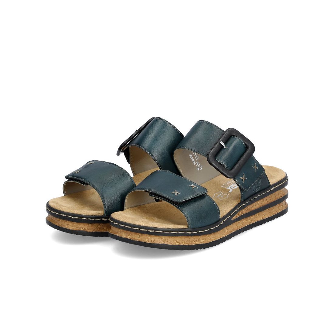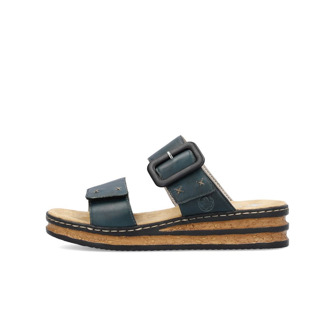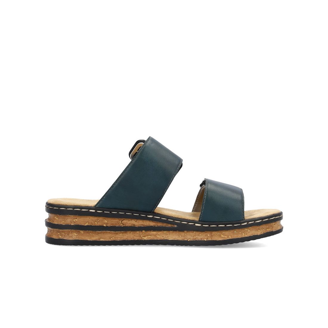 Skvěle padnoucí dámské pantofle Rieker udělají každý den ještě pohodlnější. Tyto nazouváky v "petrolejové" barvě se dvěma pásky na suchý zip, díky nimž si obuv perfektně přizpůsobíte svým nohám, jsou doladěny nízkým klínkem v imitaci korku. Ať je využijete na dovolenou, do práce a na běžné nošení, vždy budete spokojená. Technologie: Antistress - podešev je díky této technologii lehká, flexibilní, absorbuje nárazy při došlapu a snadno se přizpůsobí každé noze.