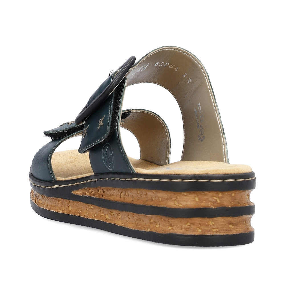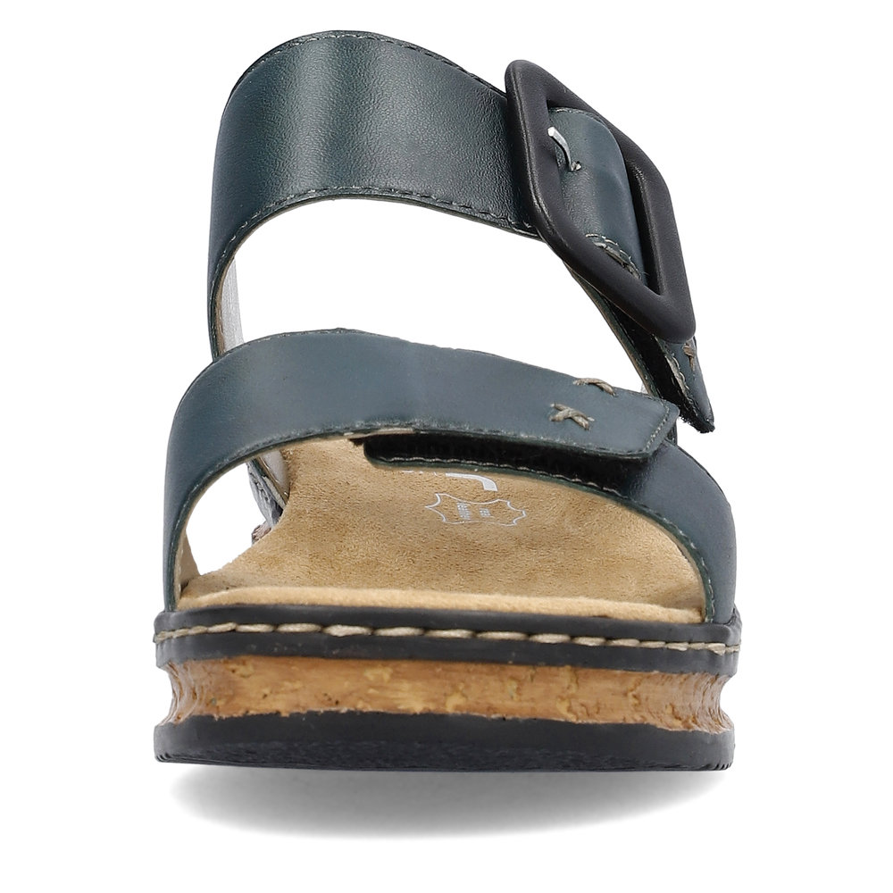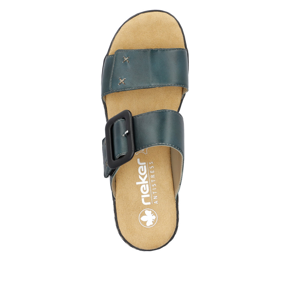 Skvěle padnoucí dámské pantofle Rieker udělají každý den ještě pohodlnější. Tyto nazouváky v "petrolejové" barvě se dvěma pásky na suchý zip, díky nimž si obuv perfektně přizpůsobíte svým nohám, jsou doladěny nízkým klínkem v imitaci korku. Ať je využijete na dovolenou, do práce a na běžné nošení, vždy budete spokojená. Technologie: Antistress - podešev je díky této technologii lehká, flexibilní, absorbuje nárazy při došlapu a snadno se přizpůsobí každé noze.