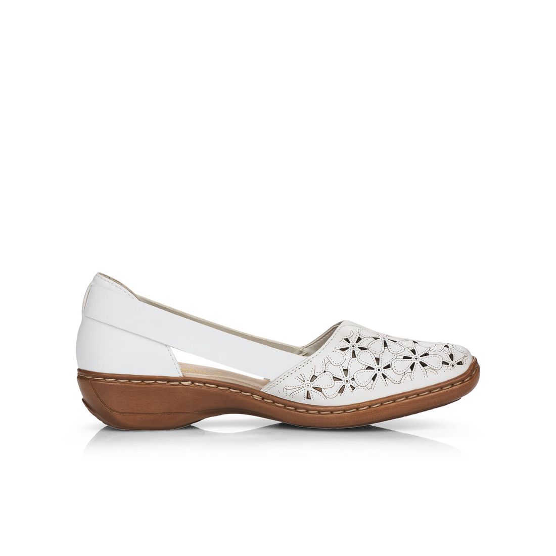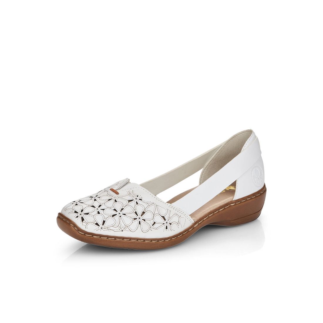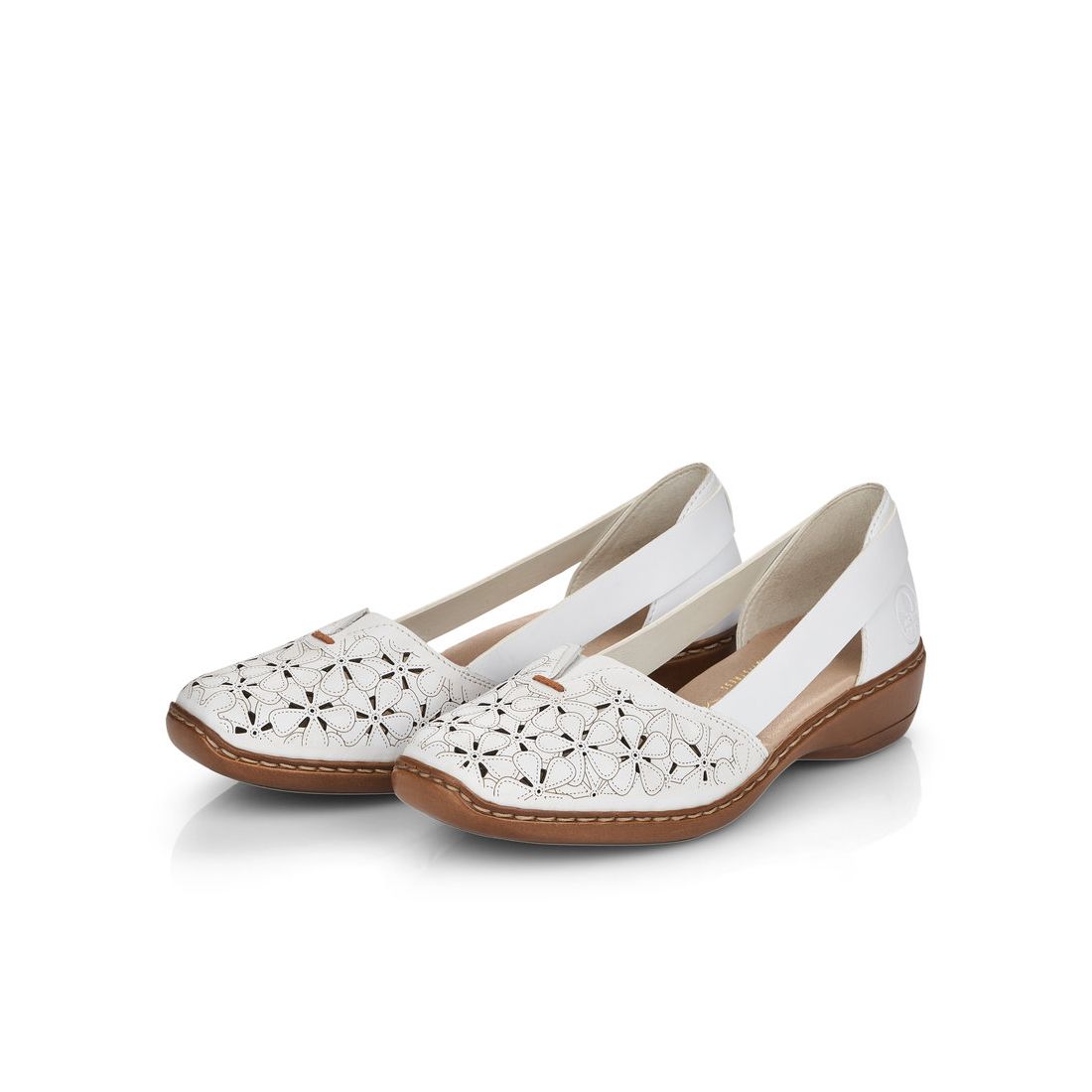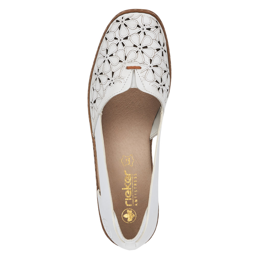Dámské polobotky značky Rieker oceníte v teplých dnech. Na první pohled zaujme perforace ve tvaru květů, díky které jsou boty vzdušné. Příjemná, měkká stélka, z paměťové pěny, Vám zajistí pohodlí, ať už vyrazíte kamkoliv. Pomocí gumiček po stranách si můžete obuv přizpůsobit svým nohám. Tato obuv by neměla chybě ve vašem botníku, protože ji lehce zkombinujete s různými outfity. Tento model nabízíme na našem e-shopu v další barevné kombinaci (platí do vyprodání zásob). Technologie: Antistress - podešev je díky této technologii lehká, flexibilní, absorbuje nárazy při došlapu a snadno se přizpůsobí každé noze.