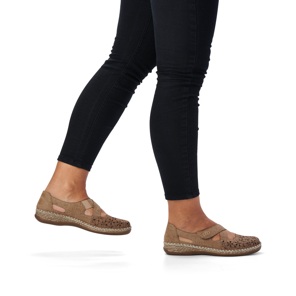 Dámské polobotky Rieker v béžové barvě jsou skvělou volbou pro Váš botník. Jemné květy ve špici jsou doladěny textem po obvodu obuvi. Celkový vzhled doladí světlé prošití na podešvi. Tyto boty jsou velice pohodlné díky měkké kožené stélce z paměťové pěny, která se přizpůsobí Vašemu chodidlu. Snadno se obouvají díky pásku na suchý zip. Antistressová podešev tlumí každý došlap, a tak se budete cítit příjemně celý den, ať už vyrazíte do práce nebo někam na výlet. Technologie: MemoSoft - stélka s paměťovou pěnou, která se perfektně přizpůsobí tvaru Vaší nohy. Antistress - podešev je díky této technologii lehká, flexibilní, absorbuje nárazy při došlapu a snadno se přizpůsobí každé noze.