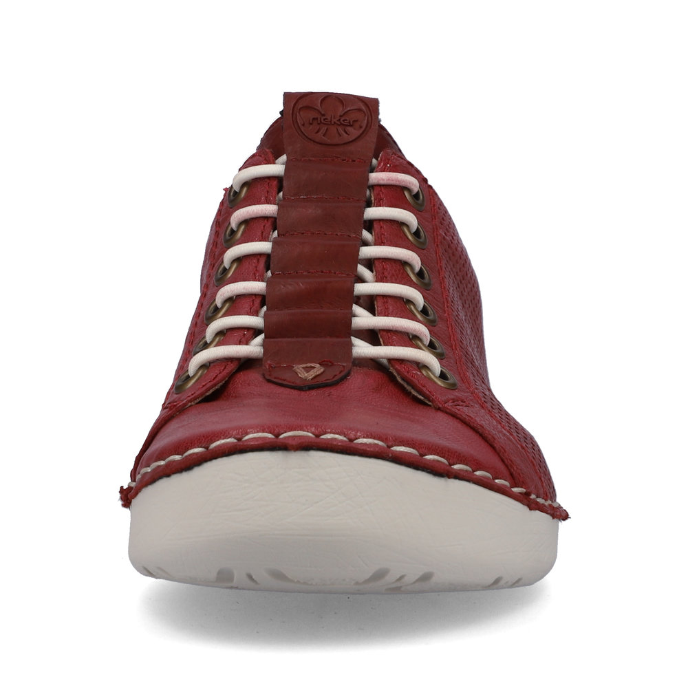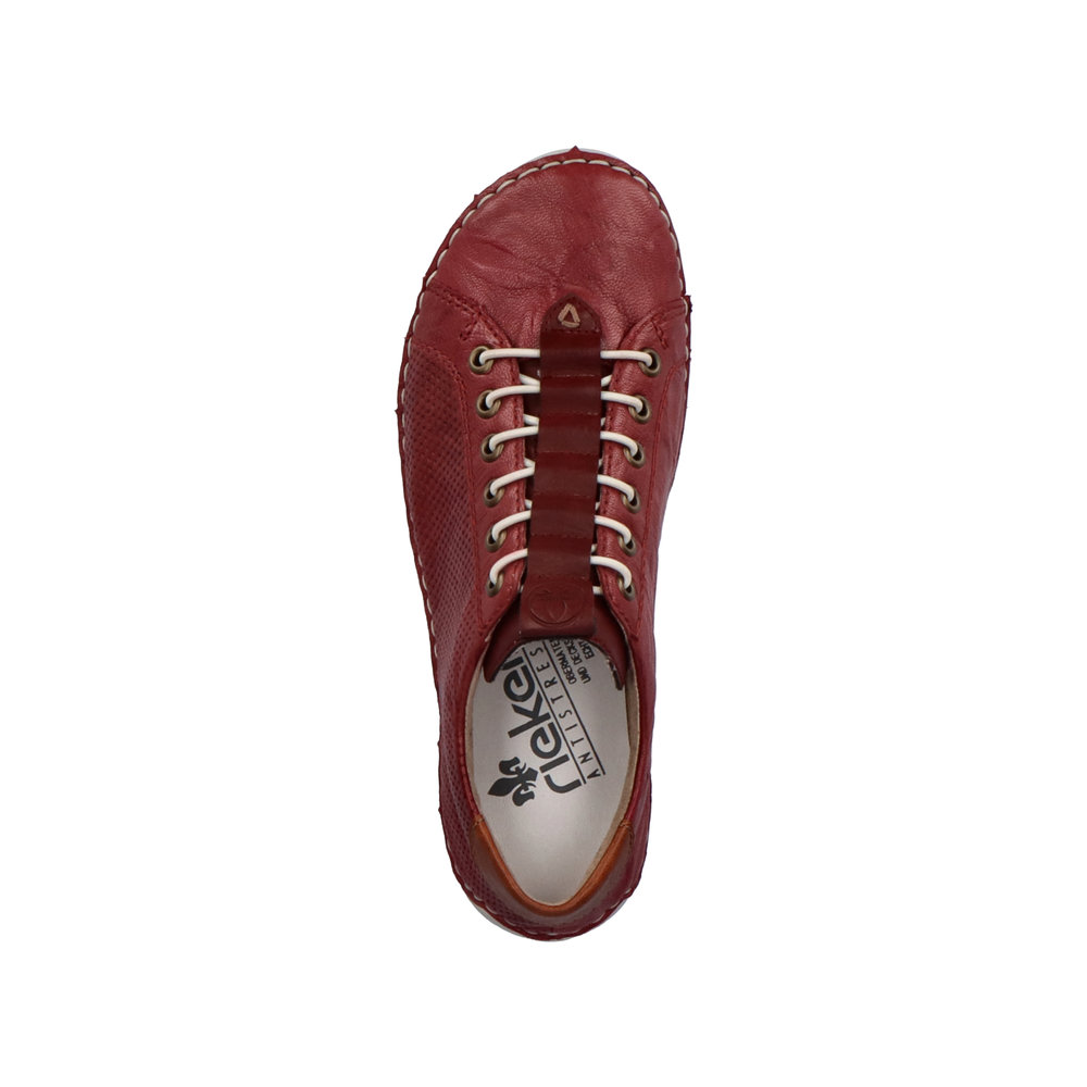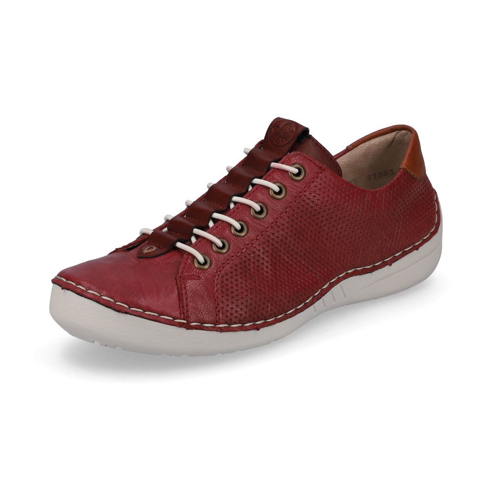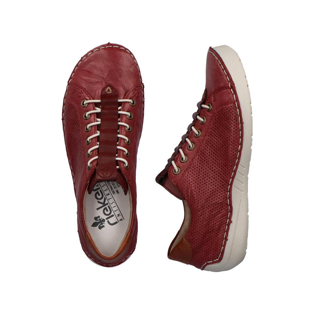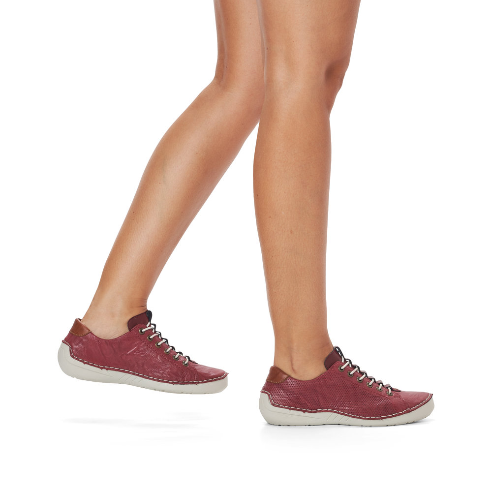 Tyto dámské tenisky Rieker, vínové barvy, Vás zaujmou na provní pohled svým originálním vzhledem. Svršek má z boční, vnějěí strany ozdobnou perforaci v podobě vymačkaných teček. Z vnitřní strany a na špici má svrchní materiál efekt pomačkaného materiálu. Jde o originální provedení, které se bude vyjímat ve Vašem outfitu. Uvnitř najdete pohodlnou, měkkou stélku, která je velmi příjemná. Boty se snadnou nazouvají díky pružnému materiálu v podobě gumiček. Technologie: Antistress - podešev, která perfektně tlumí při došlapu nárazy a otřesy, čímž šetří tlak na Vaše nohy a páteř. Navíc je díky této technologii lehká a flexibilní.