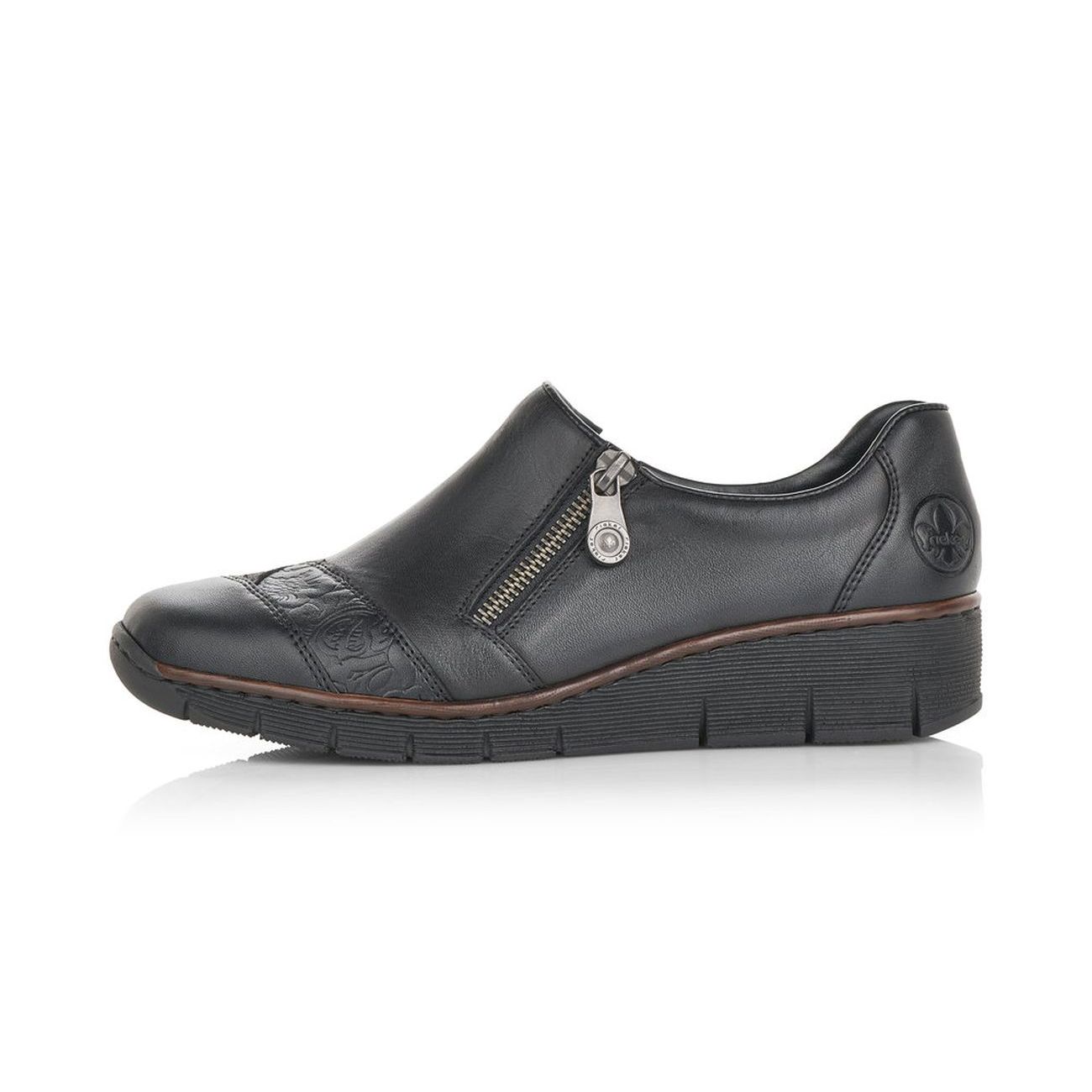 Detailní informace Oblíbené dámské kožené polobotky v černé barvě od značky Rieker. Tyto boty jsou perfektní volbou, jak do práce, tak na volný čas. Jednoduchý vzhled doladí ozdobný proužek na nártu a logo v patní části obuvi. Snadno se obouvají díky funkčnímu zipu a pružince. O pohodlí během celého dne se postará měkká kožená stélka a flexibilní podešev, která tlumí nárazy a přizpůsobí se každému kroku. Skvěle je sladíte s jakýmkoliv oblečením.