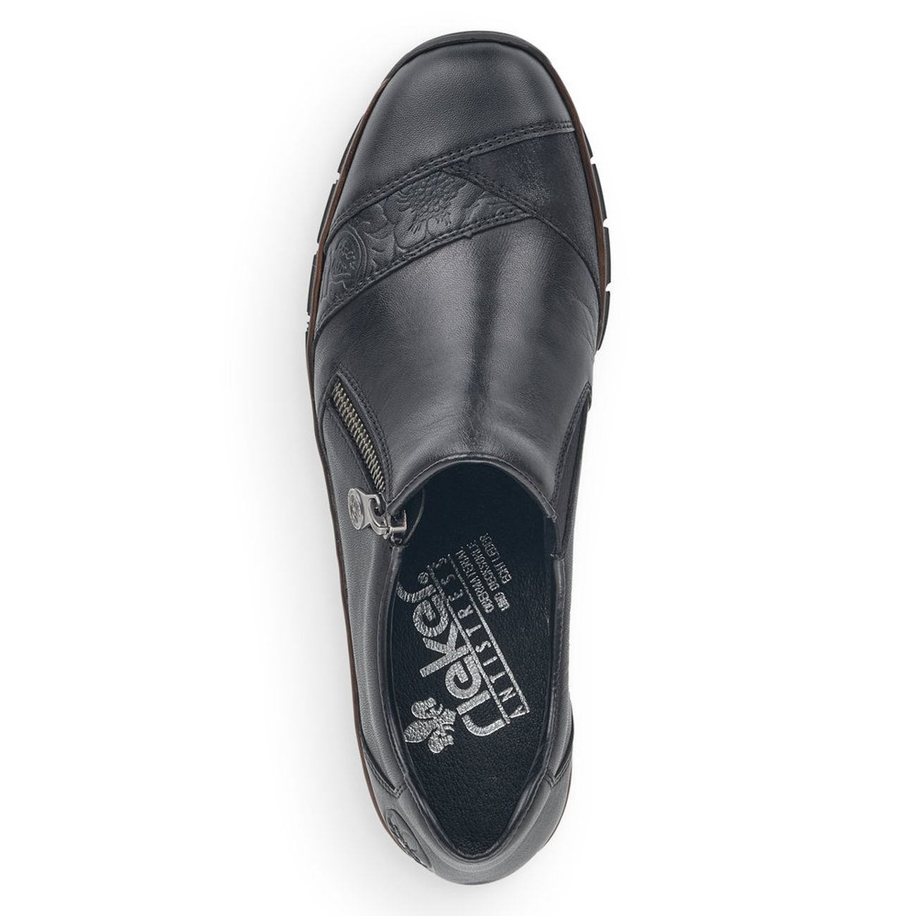 Oblíbené dámské kožené polobotky v černé barvě od značky Rieker. Tyto boty jsou perfektní volbou, jak do práce, tak na volný čas. Jednoduchý vzhled doladí ozdobný proužek na nártu a logo v patní části obuvi. Snadno se obouvají díky funkčnímu zipu a pružince. O pohodlí během celého dne se postará měkká kožená stélka a flexibilní podešev, která tlumí nárazy a přizpůsobí se každému kroku. Skvěle je sladíte s jakýmkoliv oblečením. Tento model nabízíme na našem e-shopu v další barevné kombinaci (platí do vyprodání zásob). Technologie: Antistress - podešev je díky této technologii lehká, flexibilní, absorbuje nárazy při došlapu a snadno se přizpůsobí každé noze. Výrobní způsob - šitá obuv.
