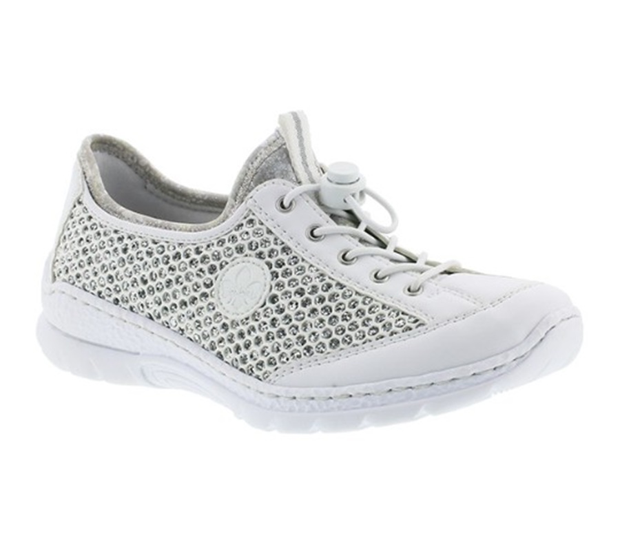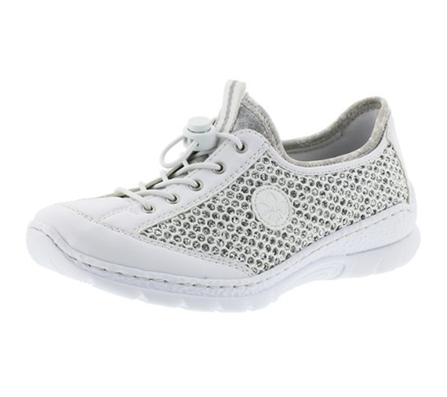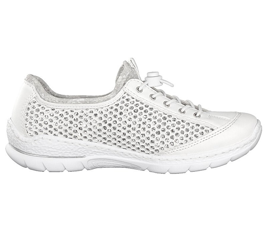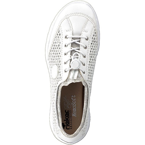 Dámské tenisky bílé barvy na nižší podešvi, která jsou vhodné pro každodenní nošení. Obuv je zdobená po stranách prodyšným textilním materiálem se stříbrným podkladem a jemným logem značky Rieker. Stahovací gumičkou si přesně přizpůsobíte obuv k vlastní noze. Potřebný komfort při užívání Vám zajistí měkká podšívka společně s měkkou stélkou. Technologie Antistress zaručuje, že je podešev díky této technologii lehká, flexibilní a absorbuje nárazy a otřesy při došlapu. Technologie: Antistress - díky této technologii je obuv lehká, flexibilní, absorbuje nárazy při došlapu a snadno se přizpůsobí každé noze.