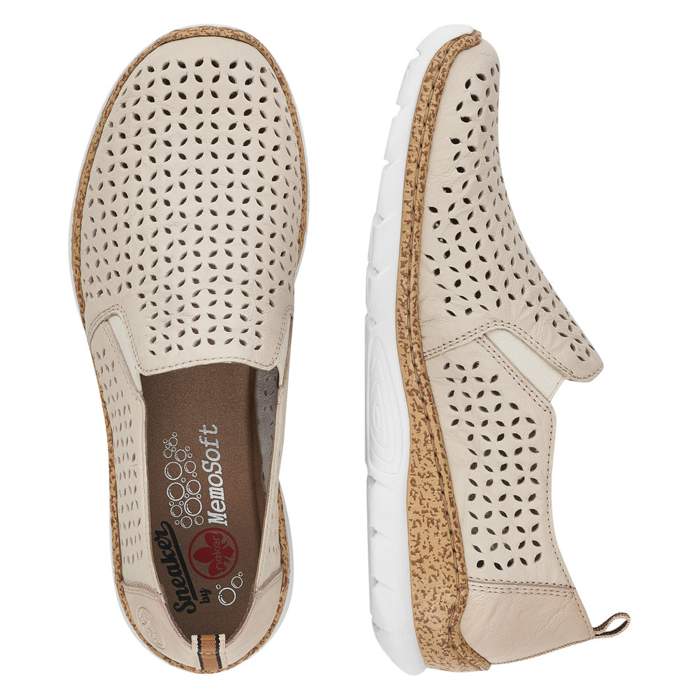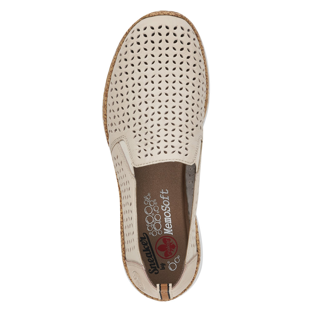 Stylové dámské polobotky v béžové barvě od značky Rieker, které zaujmou svým originálním provedením. Svršek je zajímavě perforovaný a dokonale ladí s bílou podešví, která je doplněna korkovým pruhem. Z obou stran je na nártu všitá pružinka, která se více přizpsůobí šiři nohy a lépe tak přilne k chodidlu. Pohodlí Vám zajistí příjemně měkká stélka a kvalitní podešev s technologií Antistress. Technologie: Antistress - podešev, která perfektně tlumí při došlapu nárazy a otřesy, čímž šetří tlak na Vaše nohy a páteř. Navíc je díky této technologii lehká a flexibilní.