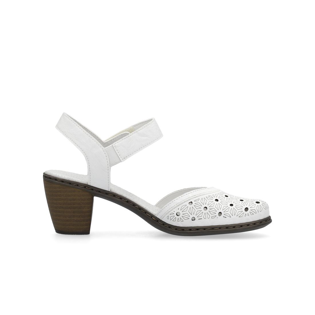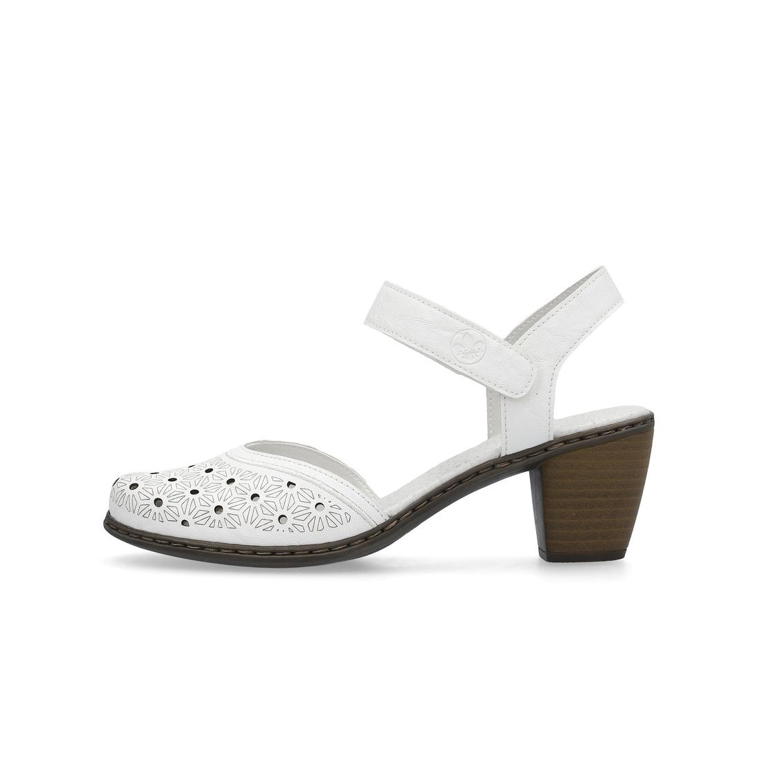 Letní sandále Rieker s uzavřenou špičkou a otevřenou patou unosíte od jara do podzima. Výrazným prvkem je perforace na svrchním materiálu. Pásek kolem nohy, na suchý zip, oceníte. Pohodlný stabilní podpatek Vám dodá jistý krok. Ať už do práce nebo na kafíčko si ráda tyto boty vezmete. Technologie: Antistress - podešev je díky této technologii lehká, flexibilní, absorbuje nárazy při došlapu a snadno se přizpůsobí každé noze. Výrobní způsob - šitá obuv.