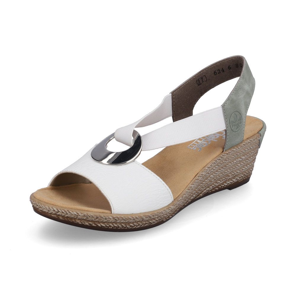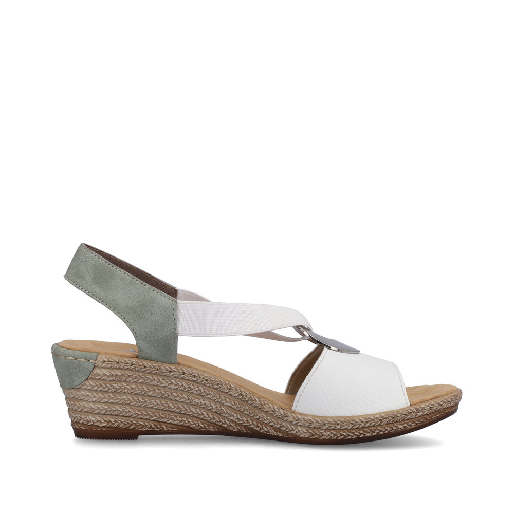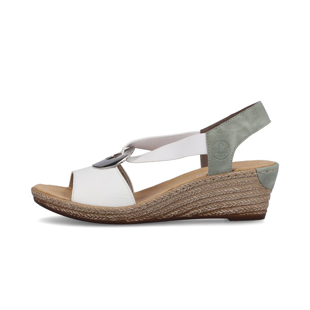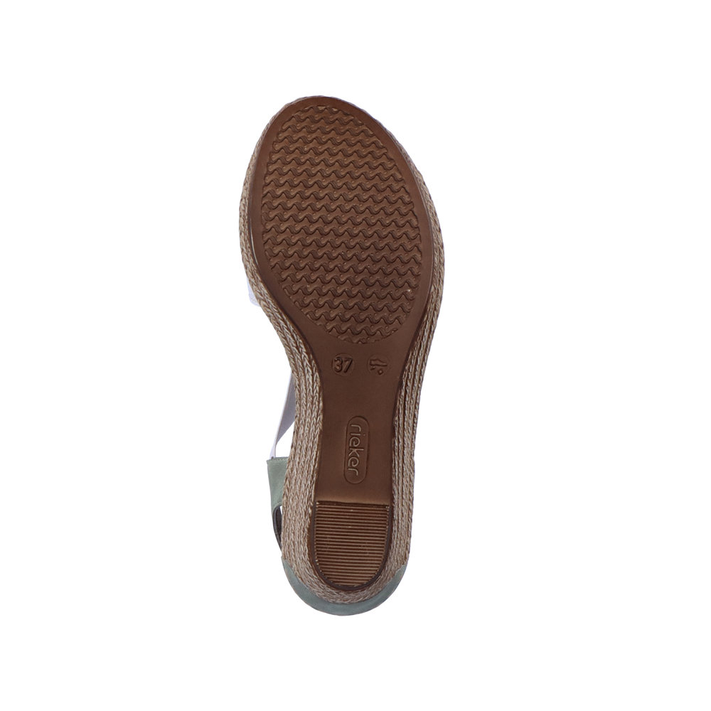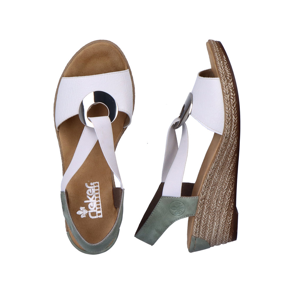 Dámské sandály Rieker v bílé barvě s ozdobným stříbrným kroužkem na nártu a jemně zeleným páskem za patou. Díky dvěma pružným páskům, si obuv lehce a rychle nazujete a pásky se skvěle přizpůsobí Vaší noze. O pohodlí se Vám postará měkká stélka a flexibilní podešev s technologií Antistress, která skvěle tlumí nárazy a otřesy, čímž šetří zejména tlak na Vaše nohy a Vaši páteř. Tyto boty budou skvělým doplňkem Vašeho outfitu, ať už vyrazíte do práce nebo do města. Tento model nabízíme na našem e-shopu v další barevné kombinaci (platí do vyprodání zásob). Technologie: Antistress - díky této technologii je obuv lehká, flexibilní, absorbuje nárazy při došlapu a snadno se přizpůsobí každé noze.