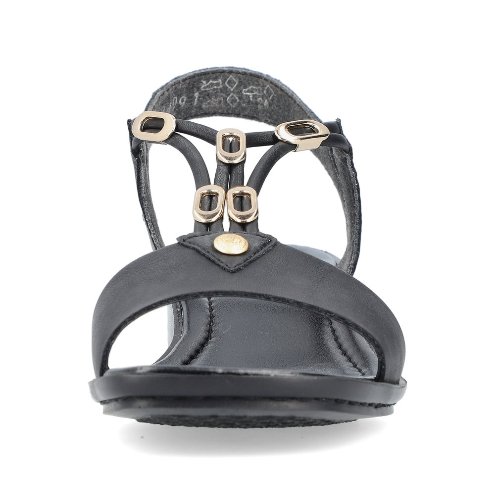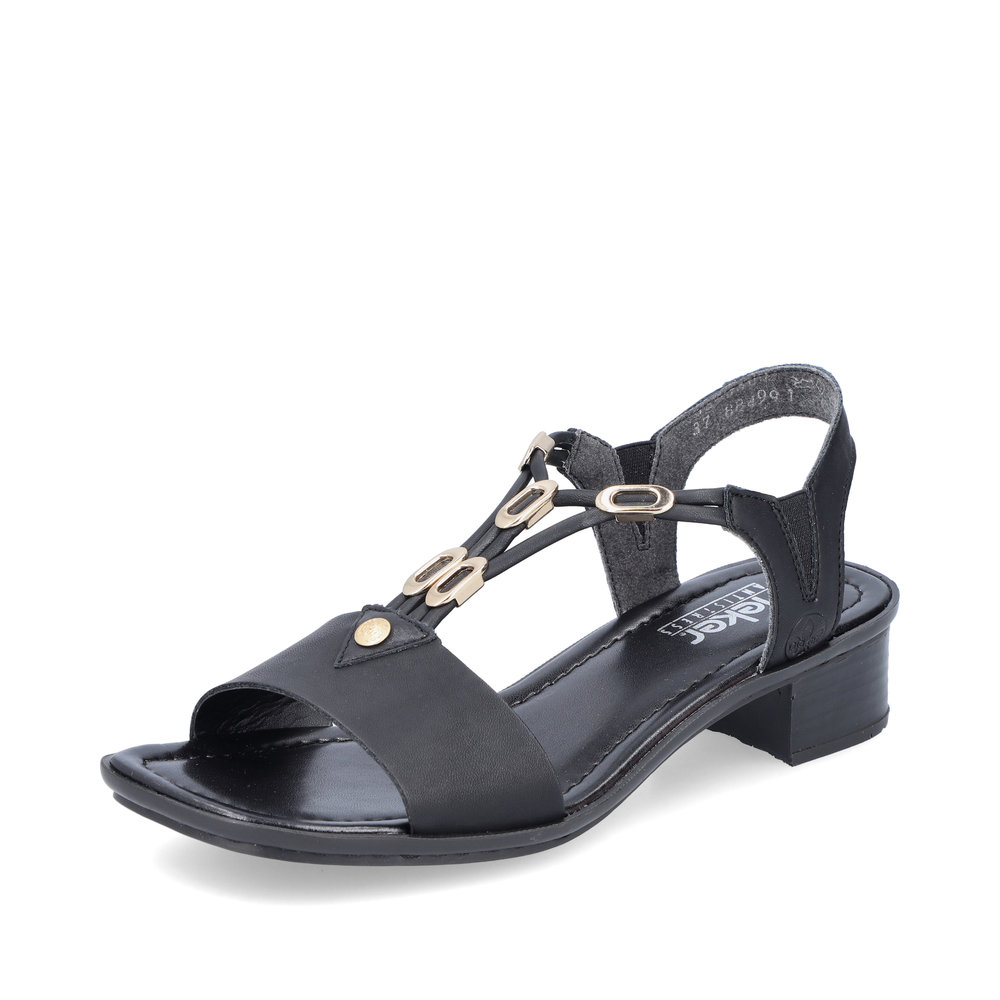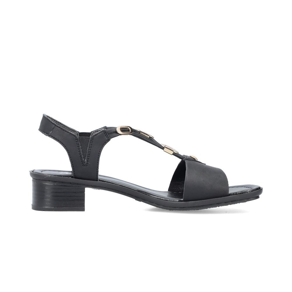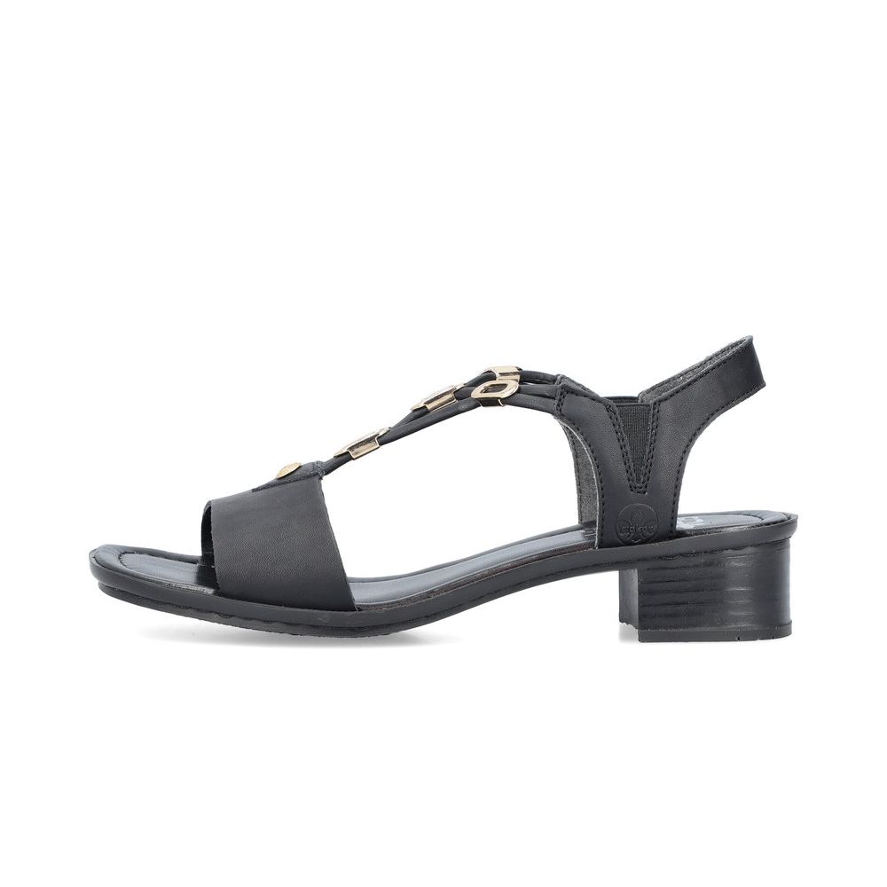 Černé letní sandály pro každodenní nošení se skvěle budou hodit do Vašeho botníku. Tyto dámské sandály Rieker, s kovovým zdobením a pásečky, mají nízký široký stabilní podpatek pro Vaši jistou chůzi. Díky vsazeným pružinkám si obuv lehce obujete a oceníte koženou stélku v horkých dnech. Flexibilní podešev s funkcí Antistress tlumí každý Váš došlap. Tento kousek se bude hodit, jak na běžné nošení, tak i na slavnostní příležitost. Technologie: Antistress - podešev je díky této technologii lehká, flexibilní, absorbuje nárazy při došlapu a snadno se přizpůsobí každé noze.