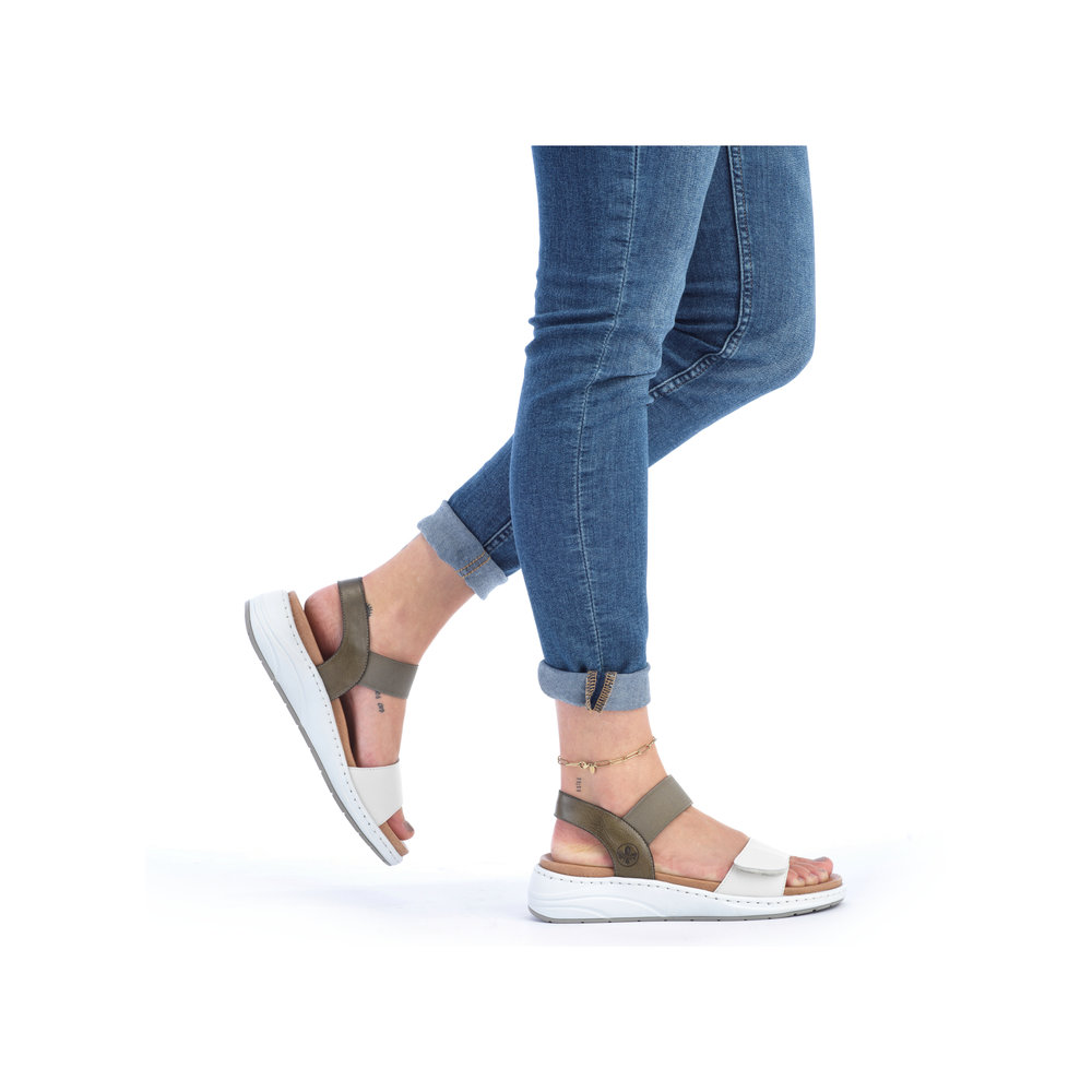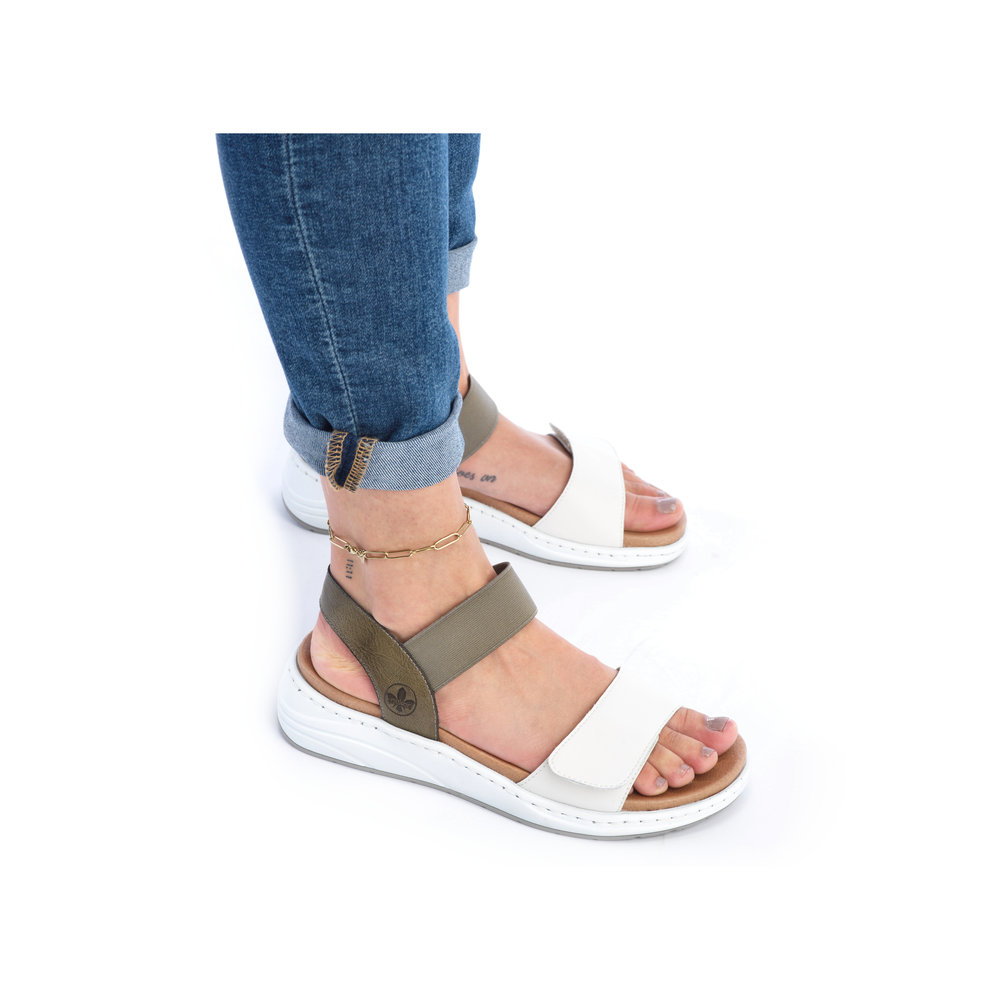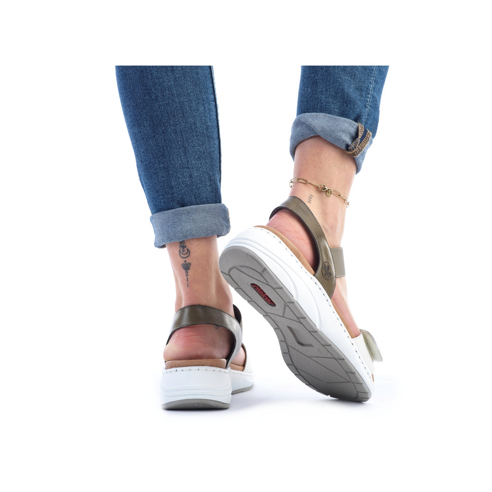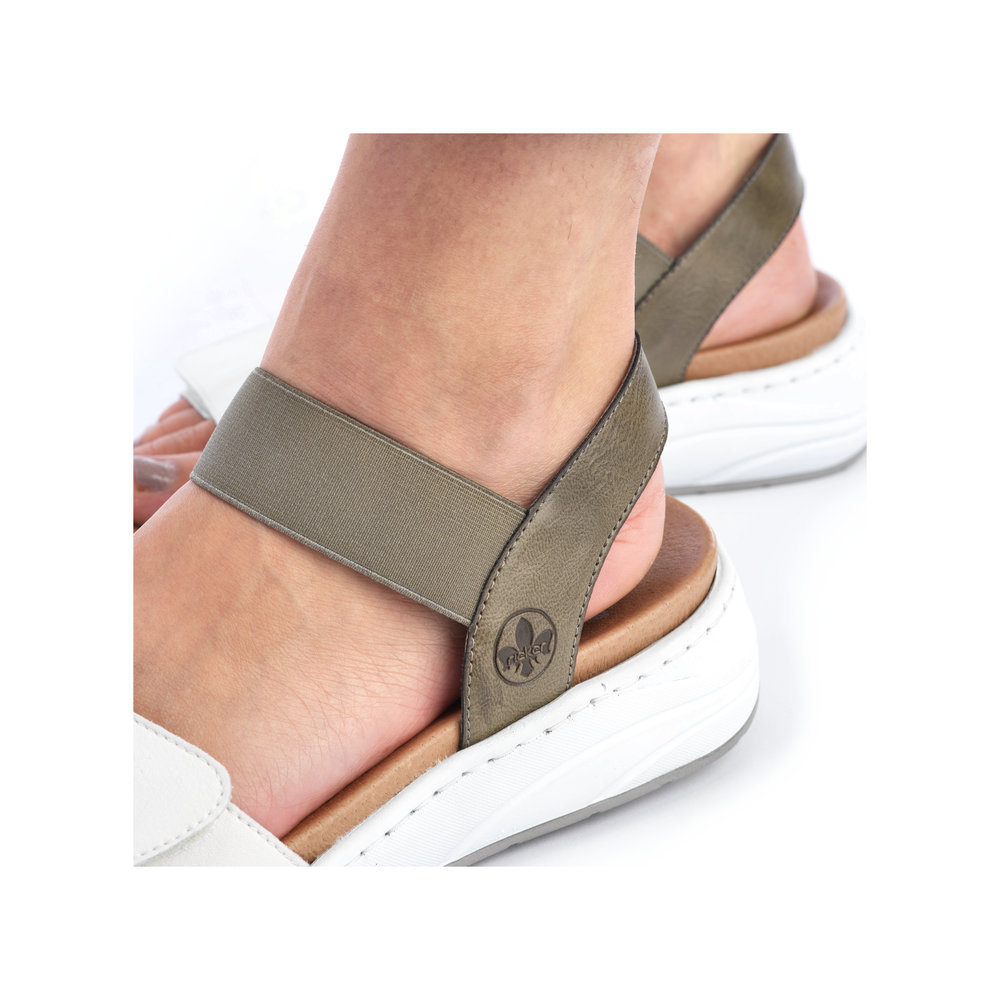 Tyto dámské sandály Rieker v zelené barvě si rychle oblíbíte. Snadno si je obujete díky pružnému pásku a pomocí suchého zipu na předním pásku si obuv přizpůsobíte svým potřebám. Barevná kombinace bílá a zelená vypádá přímo skvěle! Lehce je sladíte s jakýmkoliv outfitem. Krásné budou, jak k šatům, riflím, tak i k legínám. Tento model nabízíme na našem e-shopu v další barevné kombinaci (platí do vyprodání zásob). Technologie: Antistress - podešev je díky této technologii lehká, flexibilní, absorbuje nárazy při došlapu a snadno se přizpůsobí každé noze. Stélka z paměťové pěny.