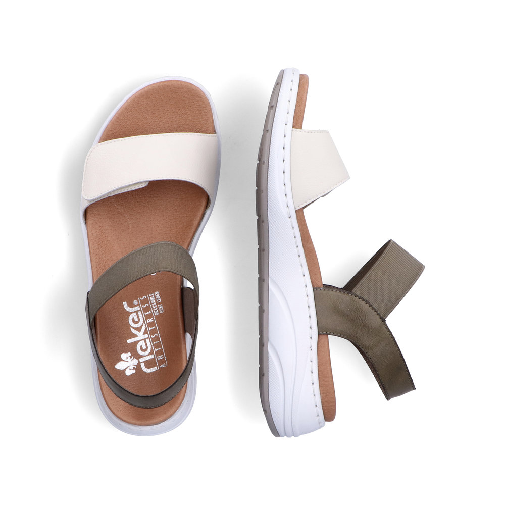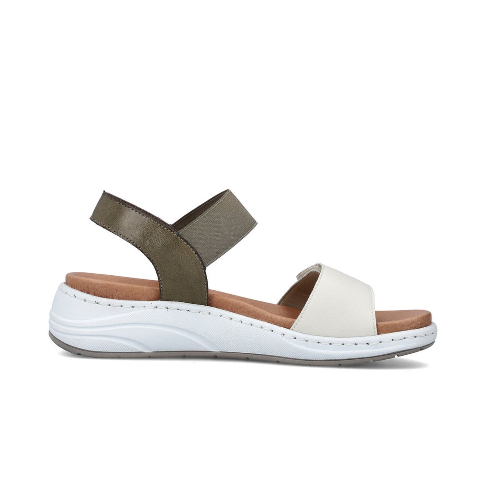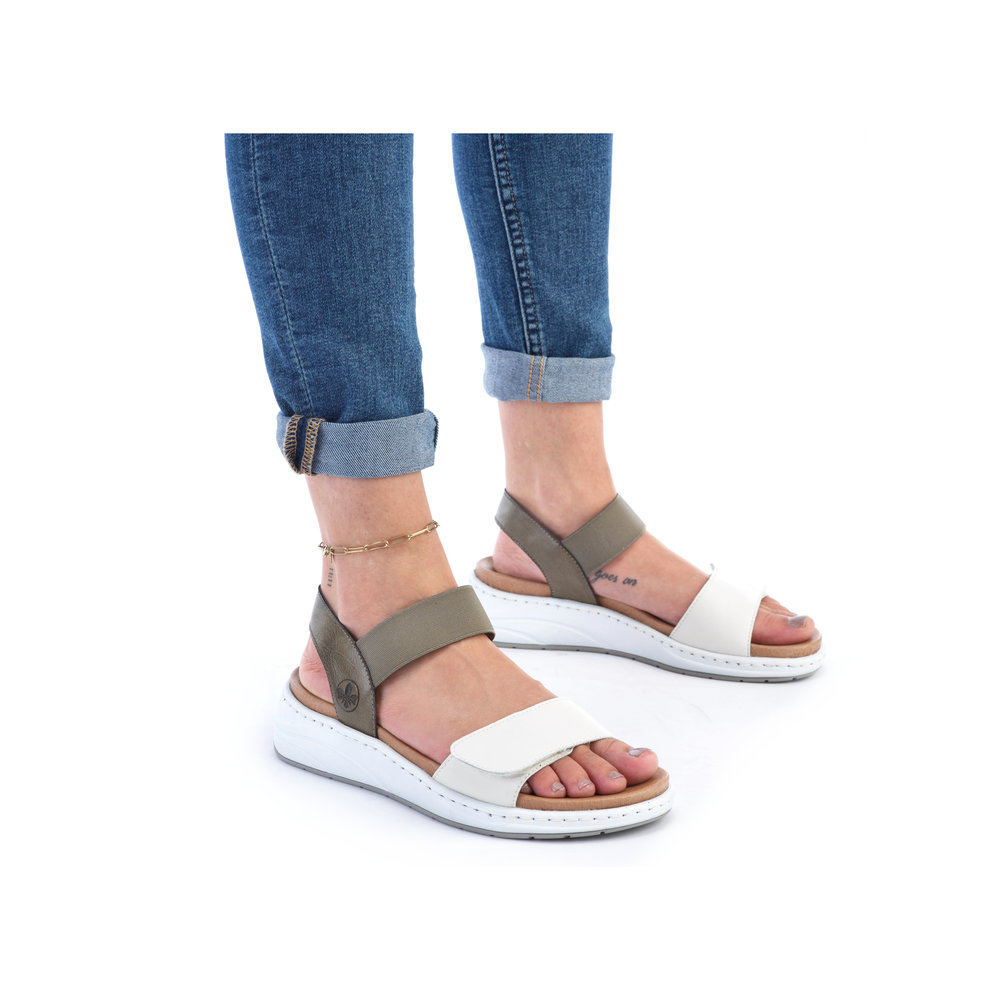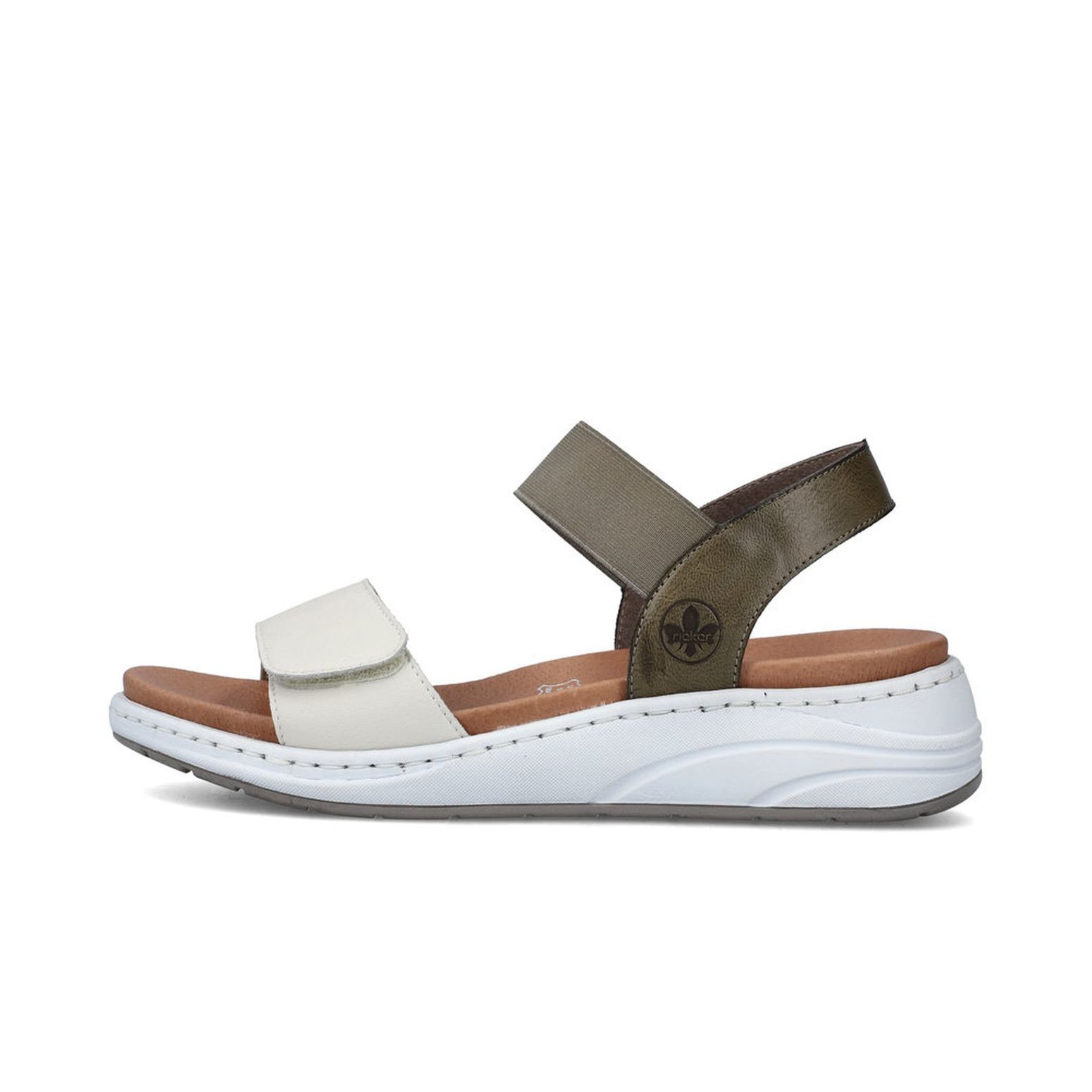 Tyto dámské sandály Rieker v zelené barvě si rychle oblíbíte. Snadno si je obujete díky pružnému pásku a pomocí suchého zipu na předním pásku si obuv přizpůsobíte svým potřebám. Barevná kombinace bílá a zelená vypádá přímo skvěle! Lehce je sladíte s jakýmkoliv outfitem. Krásné budou, jak k šatům, riflím, tak i k legínám. Tento model nabízíme na našem e-shopu v další barevné kombinaci (platí do vyprodání zásob). Technologie: Antistress - podešev je díky této technologii lehká, flexibilní, absorbuje nárazy při došlapu a snadno se přizpůsobí každé noze. Stélka z paměťové pěny.